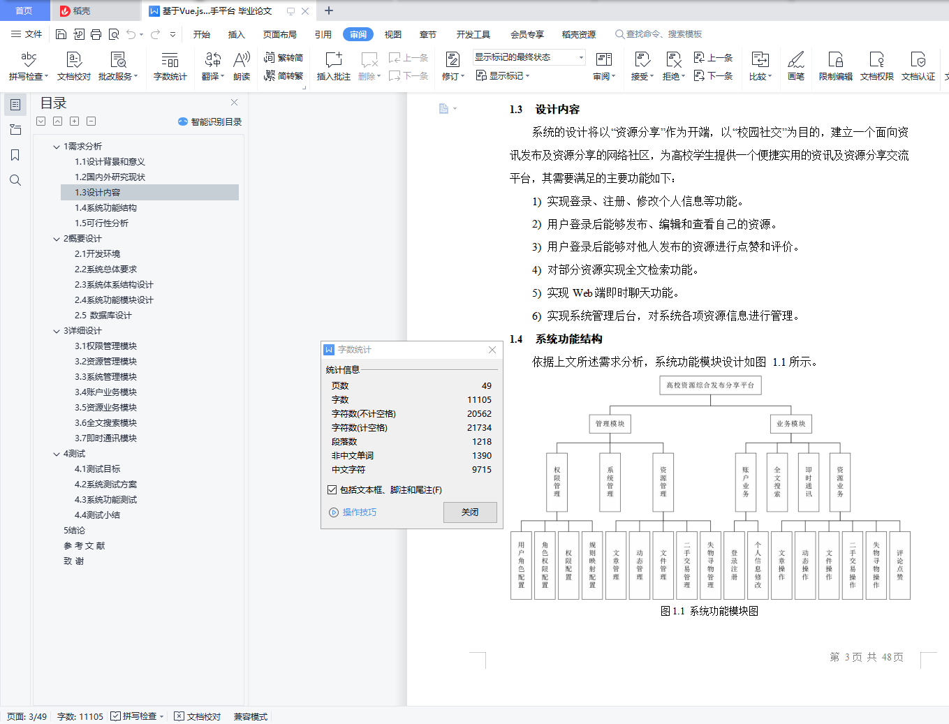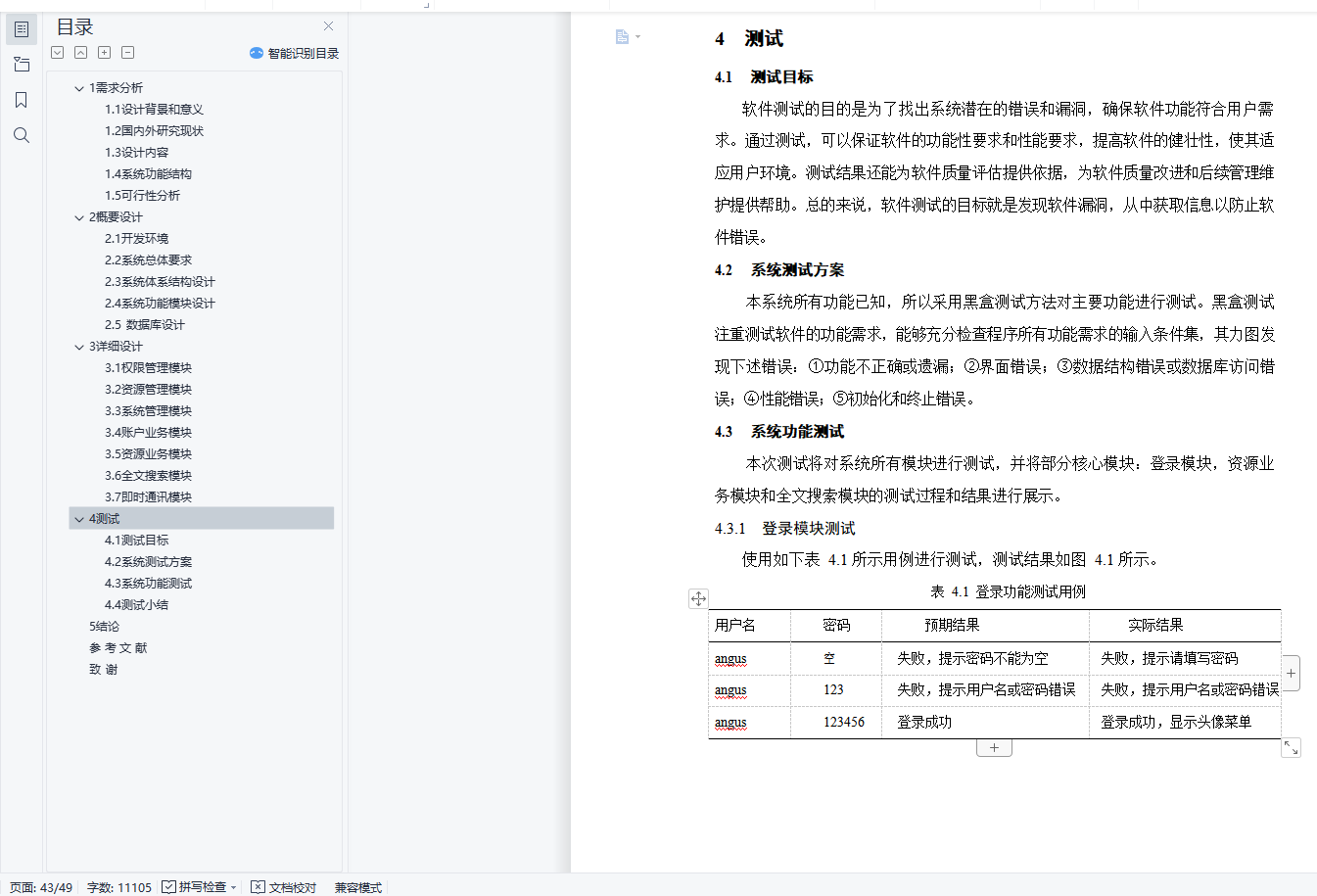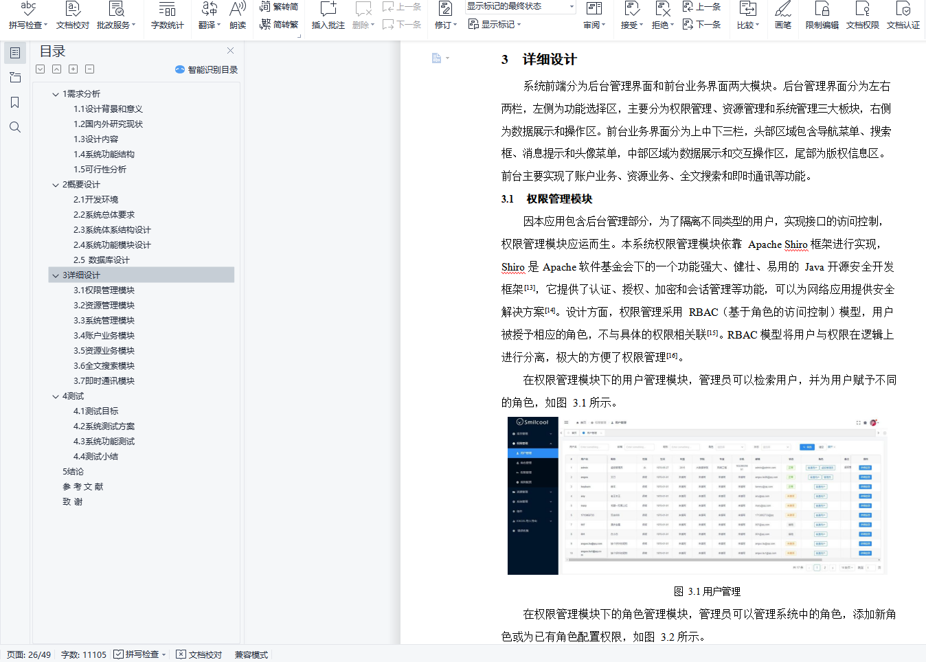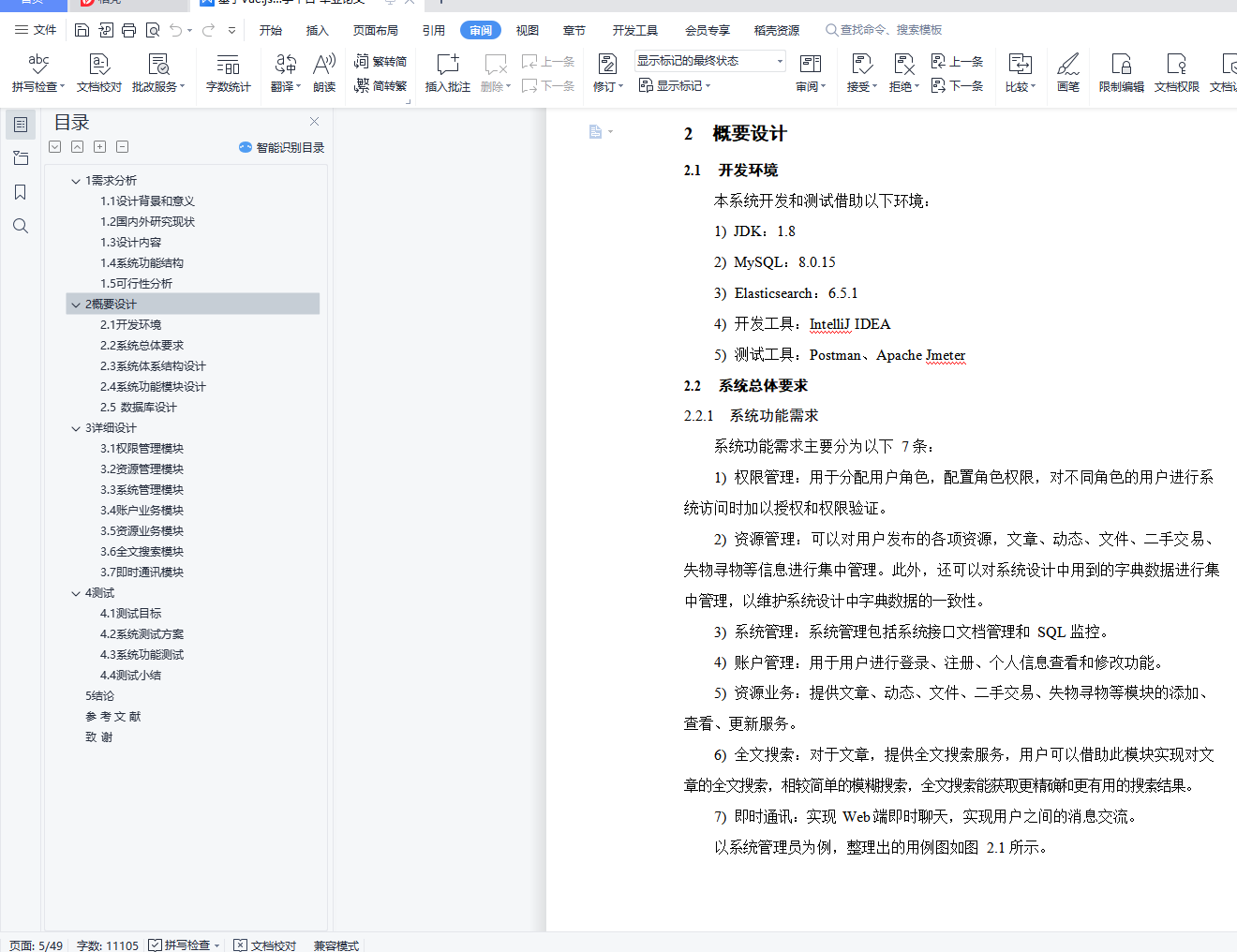 目录1 需求分析 11.1 设计背景和意义 11.2 国内外研究现状 21.3 设计内容 31.4 系统功能结构 31.5 可行性分析 42 概要设计 52.1 开发环境 52.2 系统总体要求 52.3 系统体系结构设计 82.4 系统功能模块设计 92.5 数据库设计 143 详细设计 253.1 权限管理模块 253.2 资源管理模块 273.3 系统管理模块 293.4 账户业务模块 303.5 资源业务模块 333.6 全文搜索模块 383.7 即时通讯模块 394 测试 424.1 测试目标 424.2 系统测试方案 424.3 系统功能测试 424.4 测试小结 445 结论 45参 考 文 献 46致 谢 48