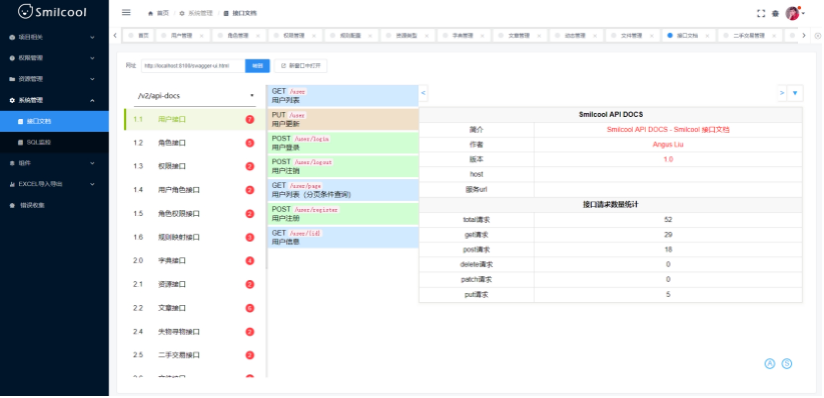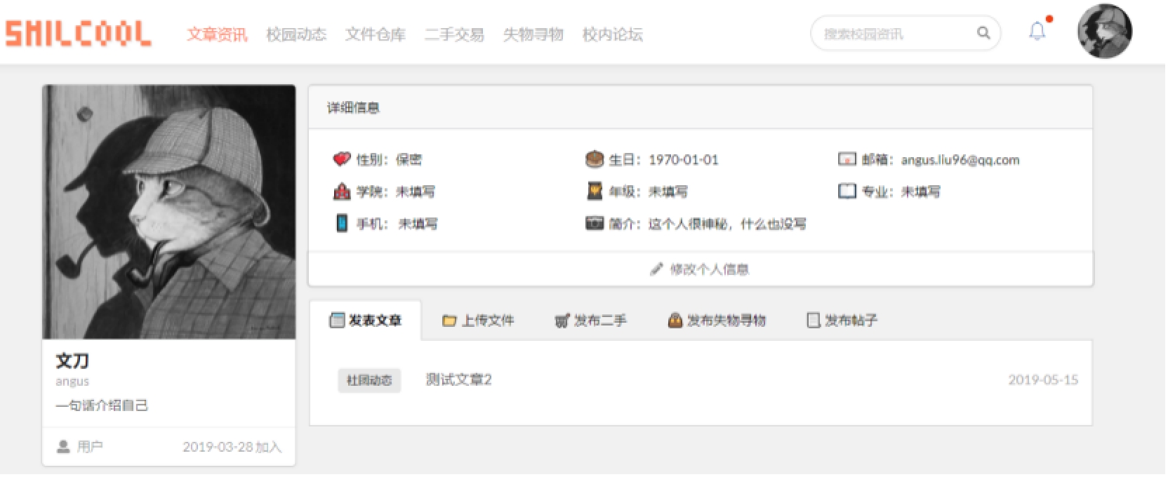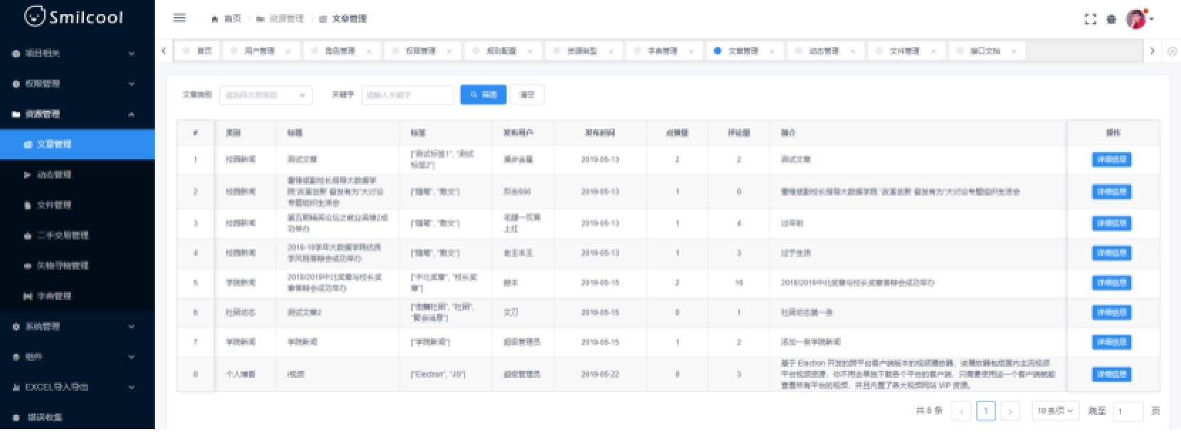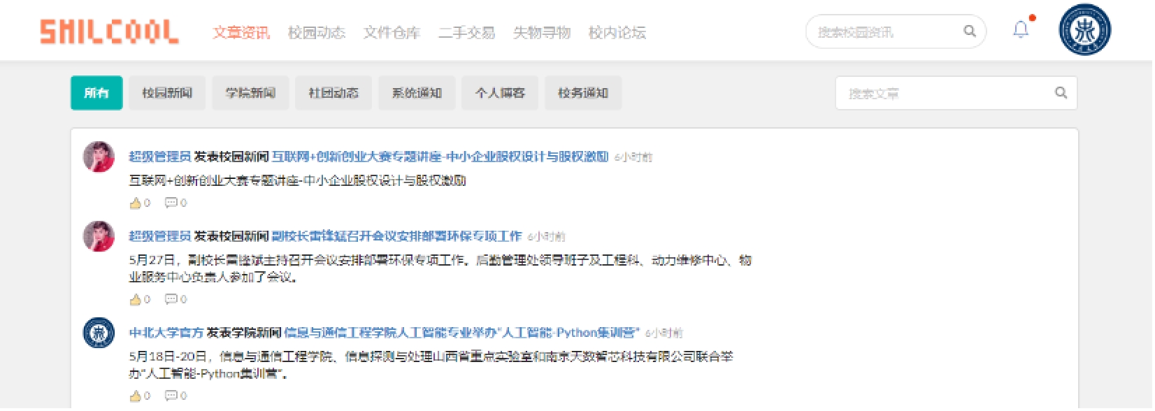 2.2系统总体要求2.2.1系统功能需求系统功能需求主要分为以下 7 条:1)权限管理:用于分配用户角色,配置角色权限,对不同角色的用户进行系统访问时加以授权和权限验证。2)资源管理:可以对用户发布的各项资源,文章、动态、文件、二手交易、失物寻物等信息进行集中管理。此外,还可以对系统设计中用到的字典数据进行集中管理,以维护系统设计中字典数据的一致性。3)系统管理:系统管理包括系统接口文档管理和 SQL 监控。4)账户管理:用于用户进行登录、注册、个人信息查看和修改功能。5)资源业务:提供文章、动态、文件、二手交易、失物寻物等模块的添加、查看、更新服务。6)全文搜索:对于文章,提供全文搜索服务,用户可以借助此模块实现对文章的全文搜索,相较简单的模糊搜索,全文搜索能获取更精确和更有用的搜索结果。即时通讯:实现 Web 端即时聊天,实现用户之间的消息交流。