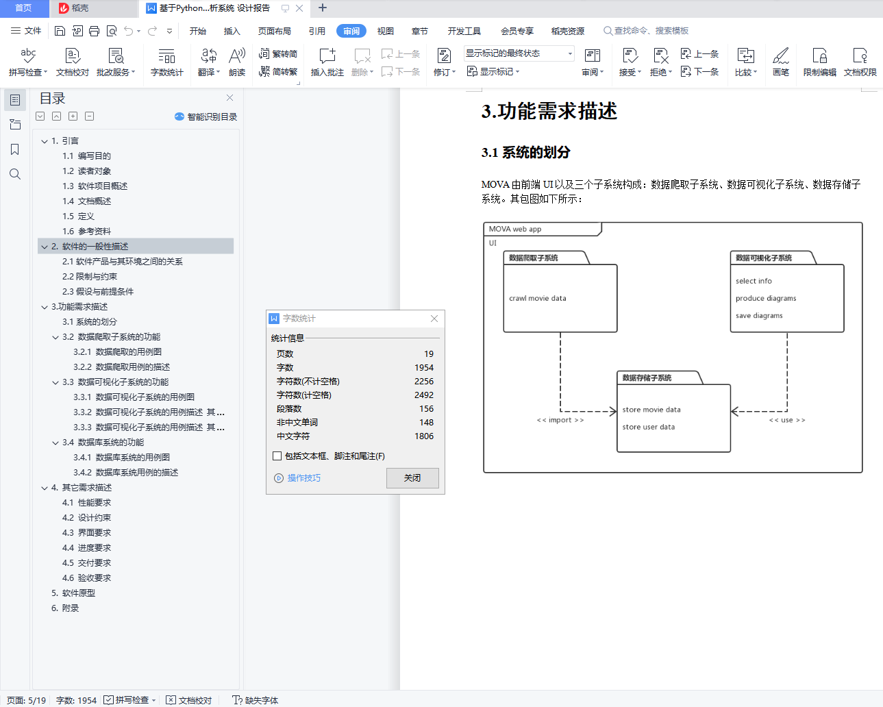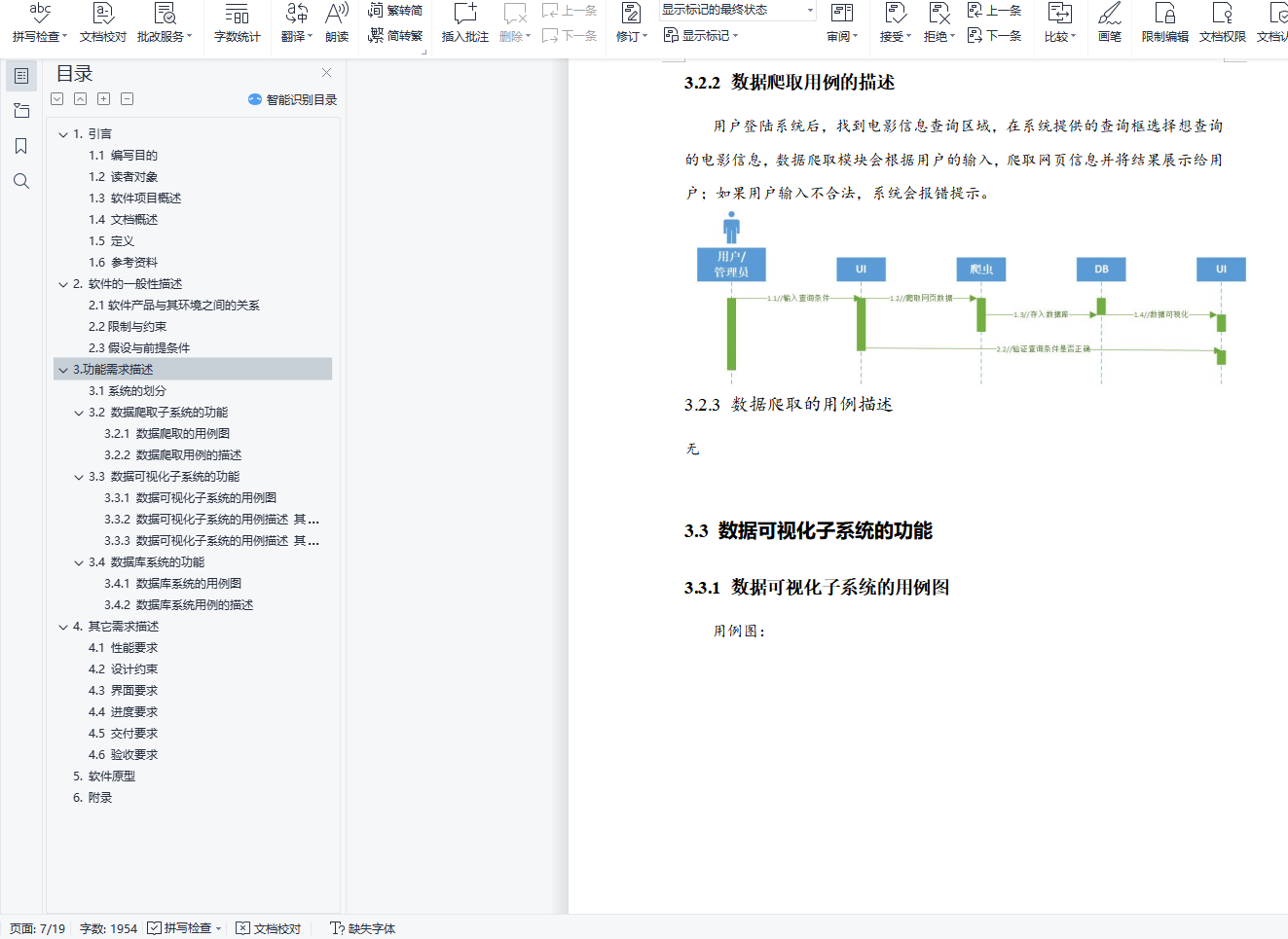 目录1. 引言 21.1 编写目的 21.2 读者对象 21.3 软件项目概述 21.4 文档概述 21.5 定义 21.6 参考资料 32. 软件的一般性描述 42.1软件产品与其环境之间的关系 42.2限制与约束 42.3假设与前提条件 43.功能需求描述 53.1系统的划分 53.2 数据爬取子系统的功能 63.2.1 数据爬取的用例图 63.2.2 数据爬取用例的描述 73.3 数据可视化子系统的功能 73.3.1 数据可视化子系统的用例图 73.3.2 数据可视化子系统的用例描述 其一 93.3.3 数据可视化子系统的用例描述 其二 103.4 数据库系统的功能 113.4.1 数据库系统的用例图 113.4.2 数据库系统用例的描述 124. 其它需求描述 134.1 性能要求 134.2 设计约束 134.3 界面要求 134.4 进度要求 134.5 交付要求 134.6 验收要求 135. 软件原型 146. 附录 19