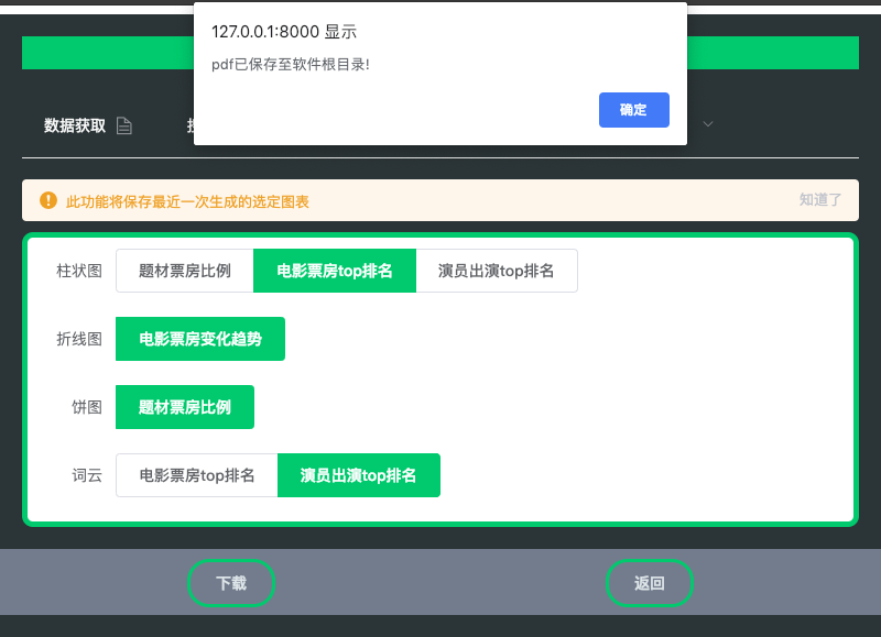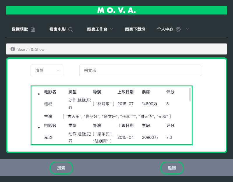 用户登陆系统后,找到电影信息查询区域,在系统提供的查询框选择想查询的电影信息,数据爬取模块会根据用户的输入,爬取网页信息并将结果展示给用户;如果用户输入不合法,系统会报错提示。在数据可视化子系统中,用户可以通过系统管理员来进行选择报表属性、生成报表操作。“选择属性”用例包括“选择时间范围”“选择电影属性”,即用户可选择生成报表的限定时间范围,以及根据需要选择不同的电影属性生成报表,如Top10劳模演员、电影票房变化趋势等等。“生成报表”用例包括“生成表格”与“生成图表”,即可以生成文字形式的表格,也可以生成扇形图、柱状图、折线图等不同形式的图表。此外,“生成报表”用例还可扩展出“保存报表”用例,即用户在生成报表后可以选择将报表保存,方便随时查看。