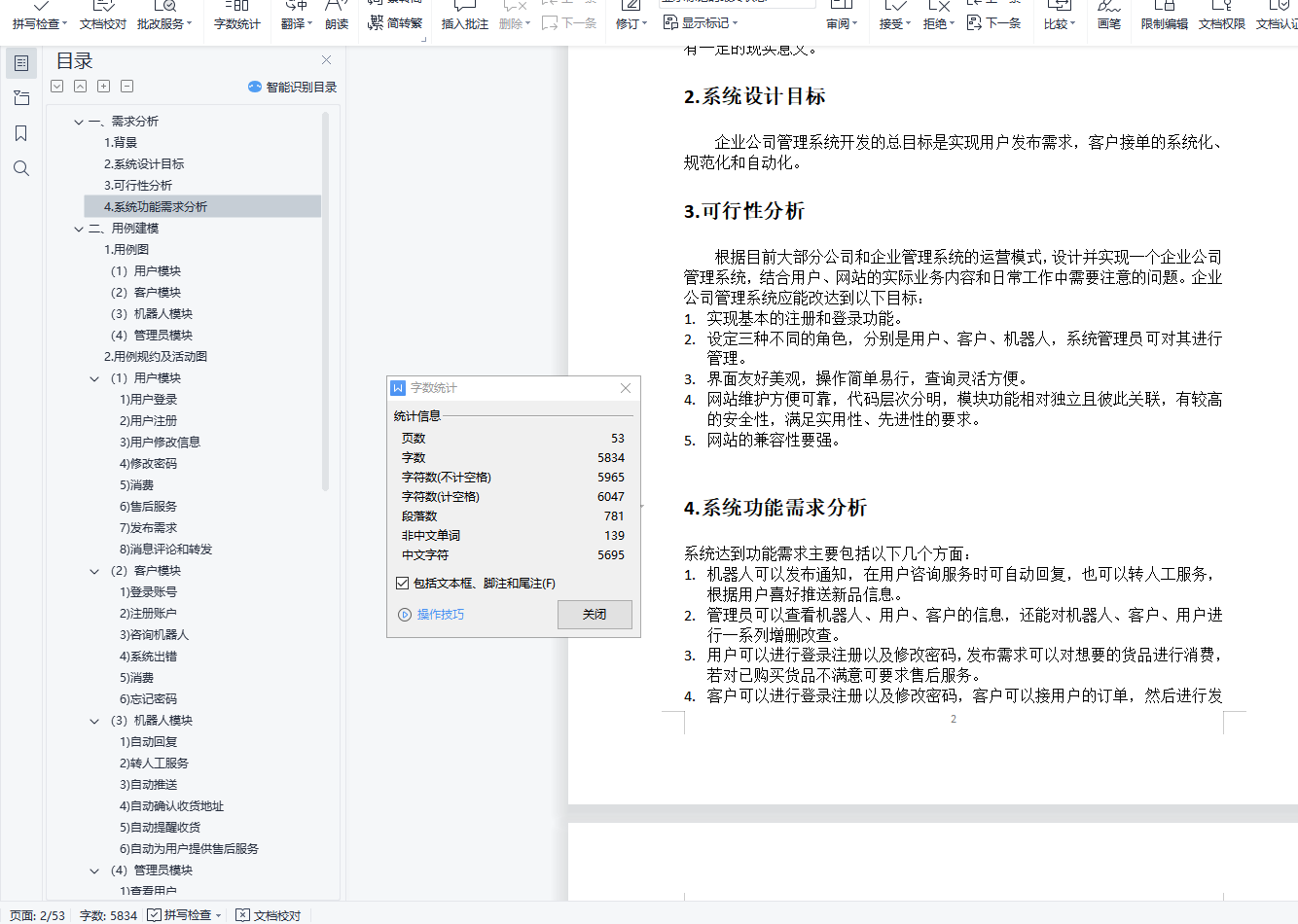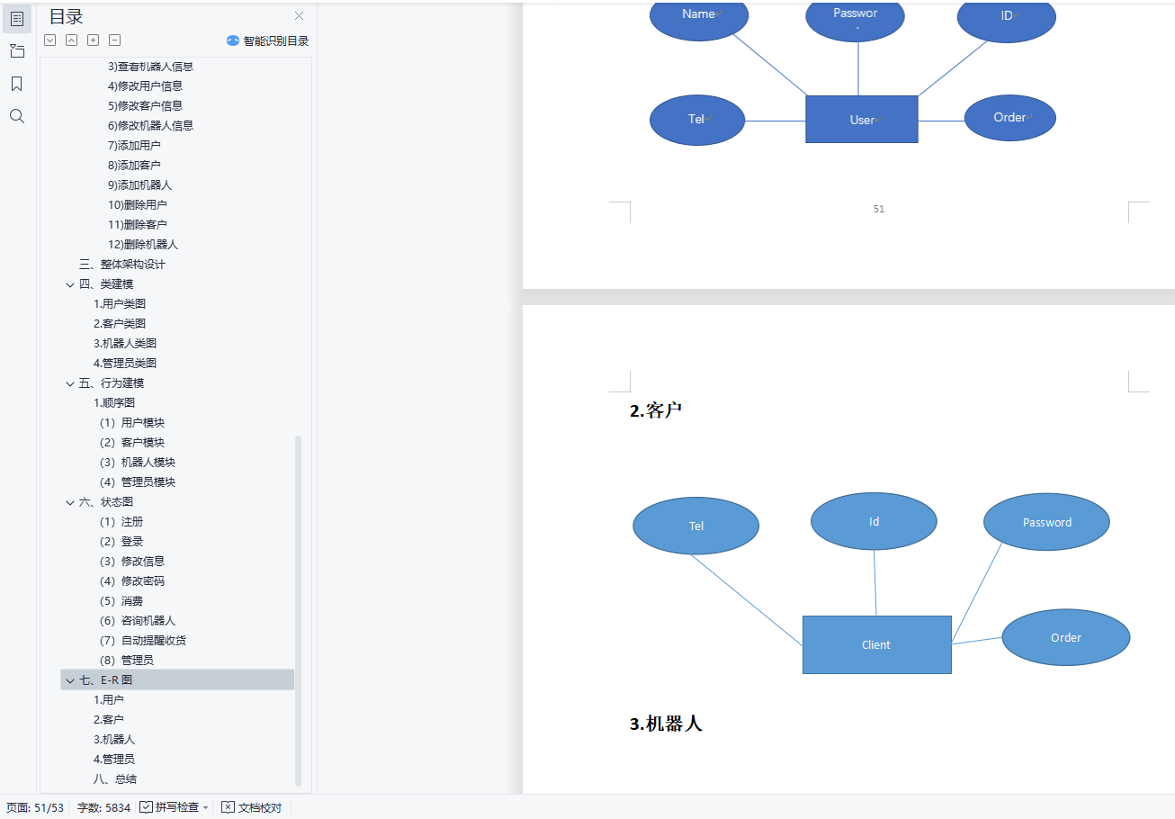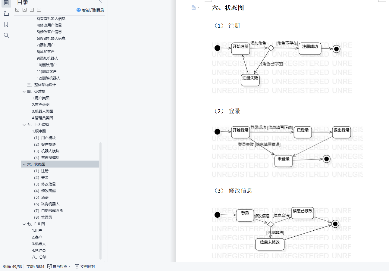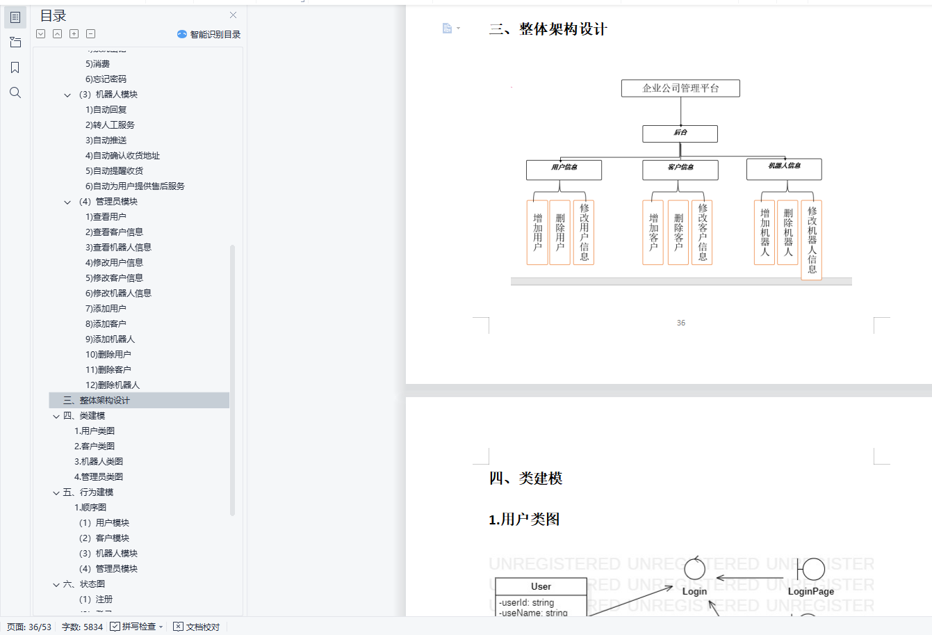 目录一、需求分析 31.背景 32.系统设计目标 33.可行性分析 34.系统功能需求分析 3二、用例建模 41.用例图 4(1) 用户模块 4(2) 客户模块 5(3) 机器人模块 5(4) 管理员模块 62.用例规约及活动图 6(1) 用户模块 6(2) 客户模块 14(3) 机器人模块 20(4) 管理员模块 26三、整体架构设计 37四、类建模 381.用户类图 382.客户类图 393.机器人类图 394.管理员类图 40五、行为建模 401.顺序图 40(1) 用户模块 40(2) 客户模块 44(3) 机器人模块 47(4) 管理员模块 48六、状态图 50(1) 注册 50(2) 登录 50(3) 修改信息 50(4) 修改密码 51(5) 消费 51(6) 咨询机器人 51(7) 自动提醒收货 52(8) 管理员 52七、E-R图 521.用户 522.客户 533.机器人 534.管理员 54八、总结 54一、需求分析1.背景随着时代的发展,人们对企业、公司管理的需求日益提升,越来越多的企业和公司需要更高效、快捷地管理商品,也需要令客户更方便地购买商品。同时,客户亦需要良好的咨询服务和售后服务。因此,建立一个企业公司管理系统,具有一定的现实意义。2.系统设计目标企业公司管理系统开发的总目标是实现用户发布需求,客户接单的系统化、规范化和自动化。3.可行性分析根据目前大部分公司和企业管理系统的运营模式,设计并实现一个企业公司管理系统,结合用户、网站的实际业务内容和日常工作中需要注意的问题。企业公司管理系统应能改达到以下目标:1.实现基本的注册和登录功能。2.设定三种不同的角色,分别是用户、客户、机器人,系统管理员可对其进行管理。3.界面友好美观,操作简单易行,查询灵活方便。4.网站维护方便可靠,代码层次分明,模块功能相对独立且彼此关联,有较高的安全性,满足实用性、先进性的要求。5.网站的兼容性要强。4.系统功能需求分析系统达到功能需求主要包括以下几个方面:1.机器人可以发布通知,在用户咨询服务时可自动回复,也可以转人工服务,根据用户喜好推送新品信息。2.管理员可以查看机器人、用户、客户的信息,还能对机器人、客户、用户进行一系列增删改查。3.用户可以进行登录注册以及修改密码,发布需求可以对想要的货品进行消费,若对已购买货品不满意可要求售后服务。4.客户可以进行登录注册以及修改密码,客户可以接用户的订单,然后进行发货或取消订单的操作。