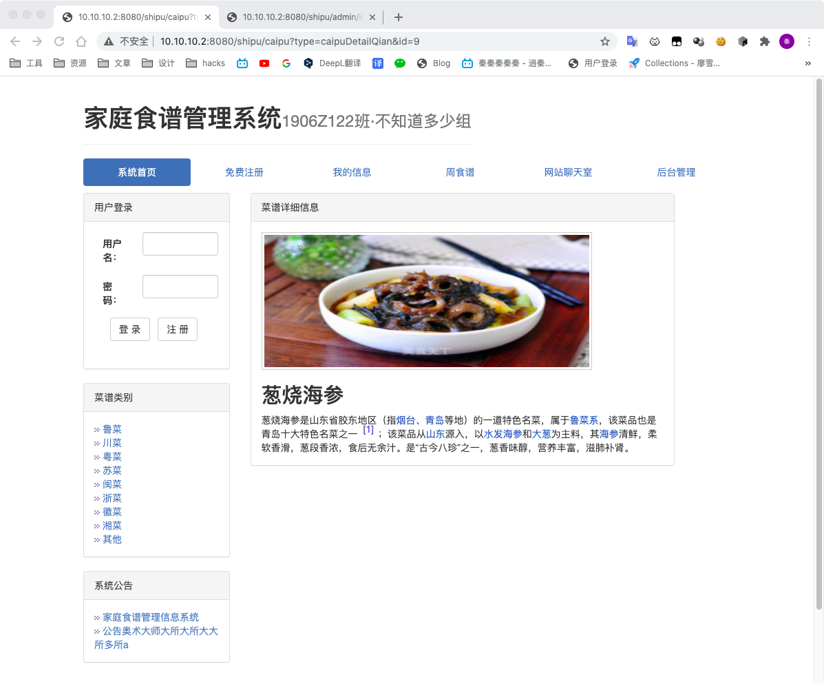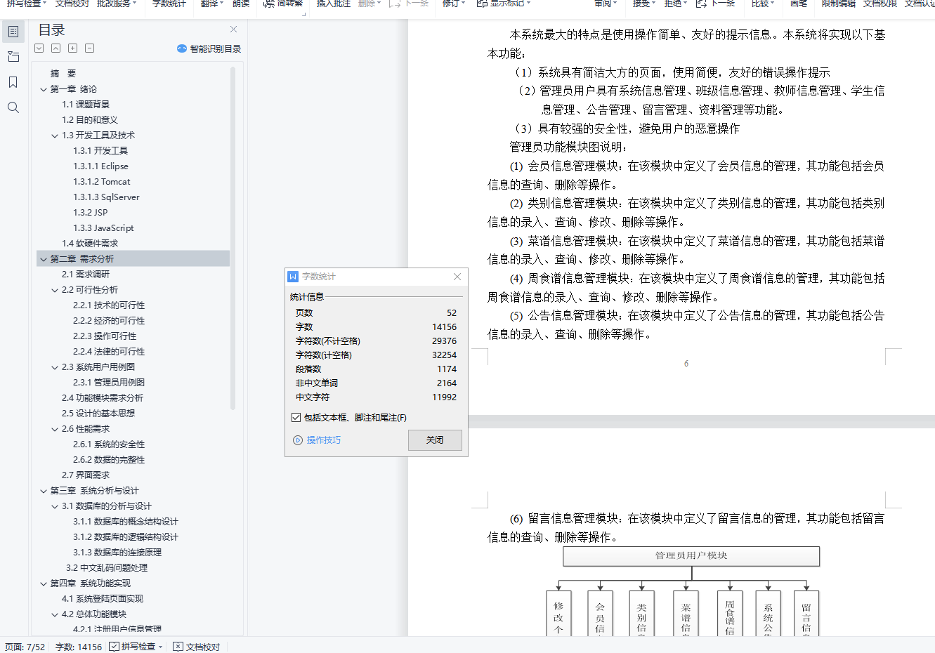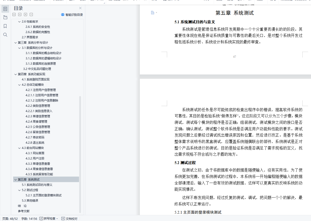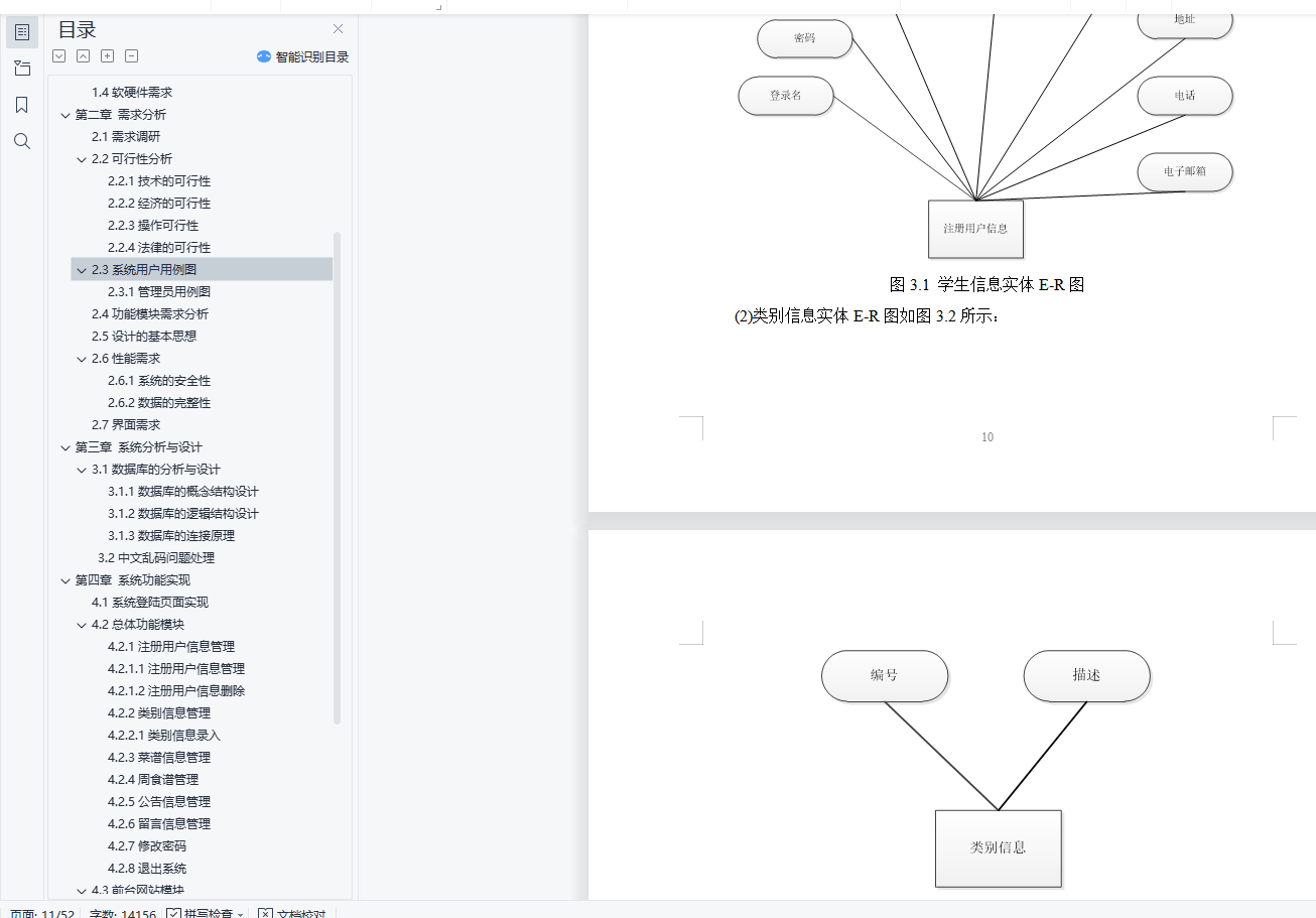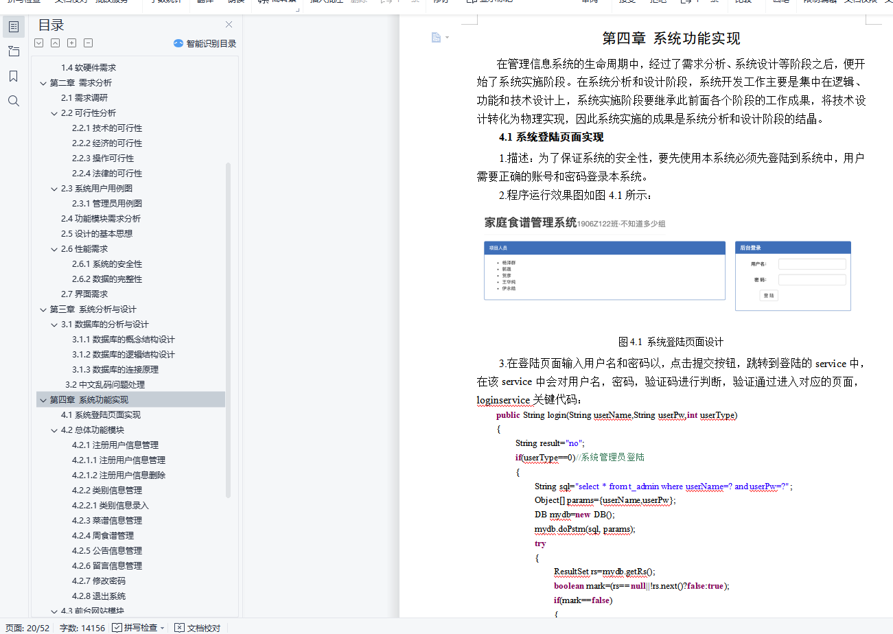 目 录摘 要 1第一章 绪论 21.1课题背景 21.2目的和意义 21.3开发工具及技术 21.4软硬件需求 4第二章 需求分析 5z2.1需求调研 52.2可行性分析 52.3系统用户用例图 62.4功能模块需求分析 62.5设计的基本思想 72.6性能需求 82.7界面需求 8第三章 系统分析与设计 103.1数据库的分析与设计 103.2中文乱码问题处理 17第四章 系统功能实现 204.1系统登陆页面实现 204.2总体功能模块 214.3前台网站模块 43第五章 系统测试 505.1系统测试目的与意义 505.2测试过程 505.3其他错误 51结 论 52参考文献 53摘 要中国已进入温饱问题基本得到解决的小康社会,人们对食物的要求越来越高,不仅仅局限于能吃饱就好,越来越多人在追求更多的美食。中国有五千多年的历史,其间自然也产生了数不胜数的美食。随着计算机网络的飞速发展,美食网已经成为人们日常生活中必不可少的部分,也是一种简单有效的提供网络用户进行学习和评价的平台,通过其可以理解美食,自己学习制作美食,它随时可以发表评论,方便快捷。开发此网站,目的在于尽可能详细地展示、介绍各种美食信息,同时提供美食爱好者一个交流的平台,使得更多的美食传统做法得到推广,也可激发更多美食创意的产生针对以上问题,设计开发了家庭食谱管理系统,本系统前台主要使用JSP作为开发语言,后台使用SqlServer作为数据库管理系统,开发环境是Eclipse,服务器采用tomcat,开发出的一个基于Web技术的B/S结构的食谱分享系统。关键词:家庭食谱,WEB,JSP,B/S结构