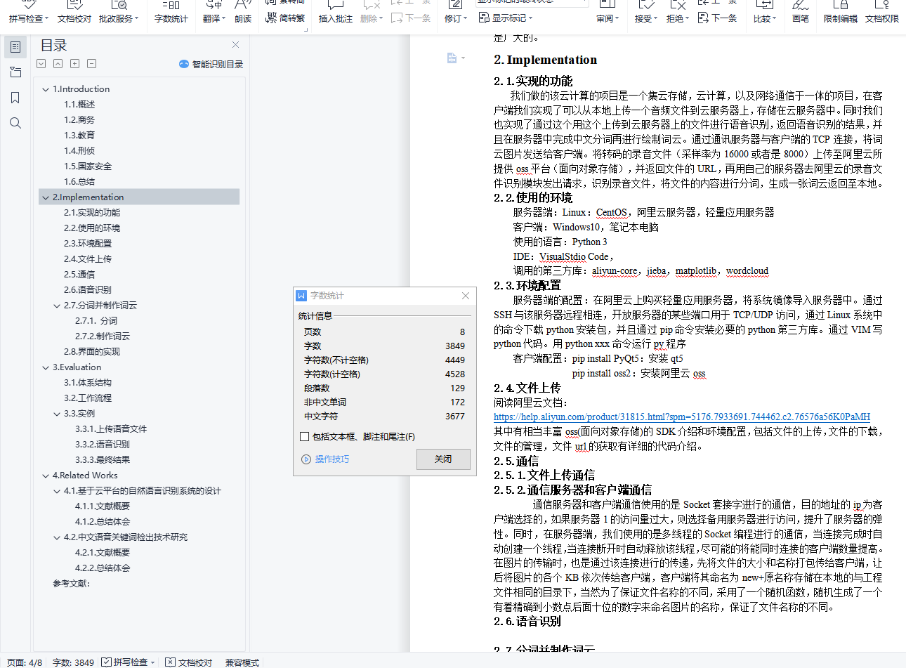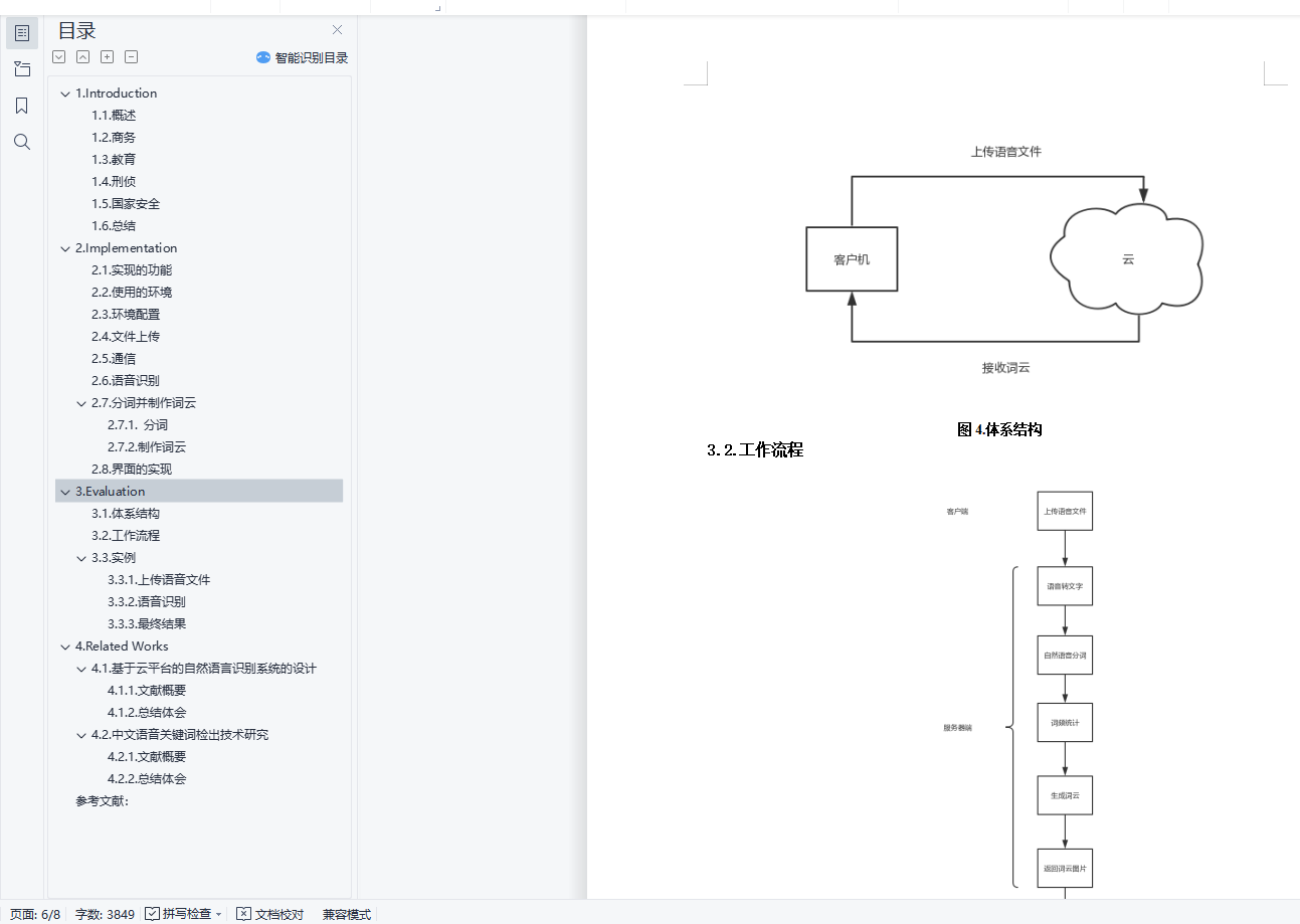 语音词频提取云平台摘要:随着互联网的发展,语音文件成为了人们接触得越来越多文件。如何高效的从一段录音中提取出关键信息,提取出其中人们感兴趣的内容,直观的呈现给人门。而搭建一个语音词频提取的云平台可以很好的解决这些问题。大风车小组从需求出发,学习阿里云平台的使用,搭建出了一个基于ASR的语音词频提取云平台。面向日常应用为商业、教育等领域提供关键信息提取的解决方案。关键字:云计算;语音识别;自然语言分词;目录1. Introduction 21.1. 概述 21.2. 商务 21.3. 教育 21.4. 刑侦 21.5. 国家安全 31.6. 总结 32. Implementation 42.1. 实现的功能 42.2. 使用的环境 42.3. 环境配置 42.4. 文件上传 42.5. 通信 42.6. 语音识别 42.7. 分词并制作词云 42.8. 界面的实现 53. Evaluation 53.1. 体系结构 53.2. 工作流程 63.3. 实例 74. Related Works 74.1. 基于云平台的自然语言识别系统的设计 74.2. 中文语音关键词检出技术研究 81.Introduction1.1.概述随着互联网的发展,诸如微信、soul等语音聊天软件的普及,人们接触到的语音文件的机会也越来越多。录音文件的途径也越来越多,应用场景也越来越方丰富。下面我们从以下几个不同的行业不同的场景进行需求分析。