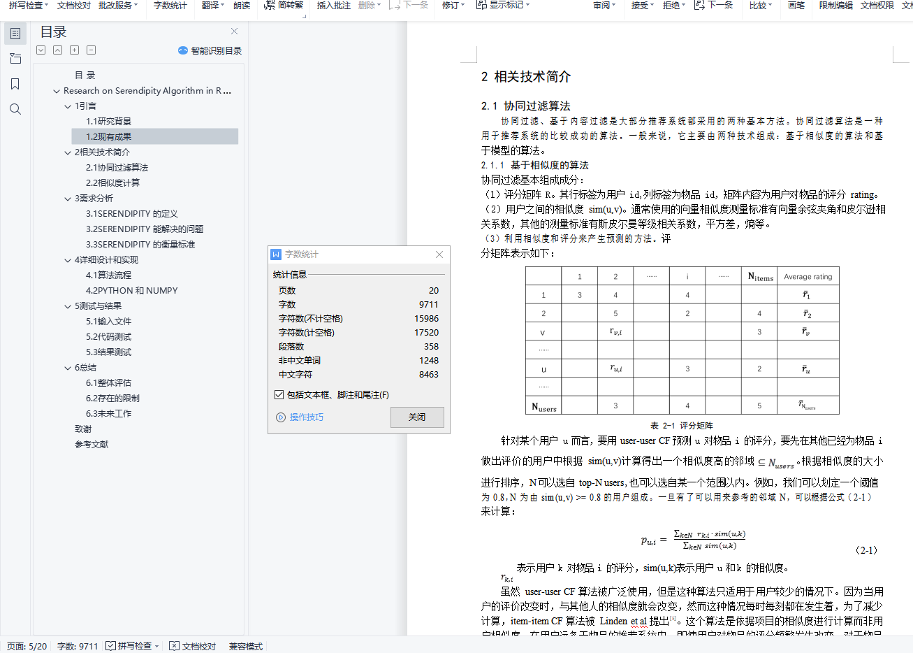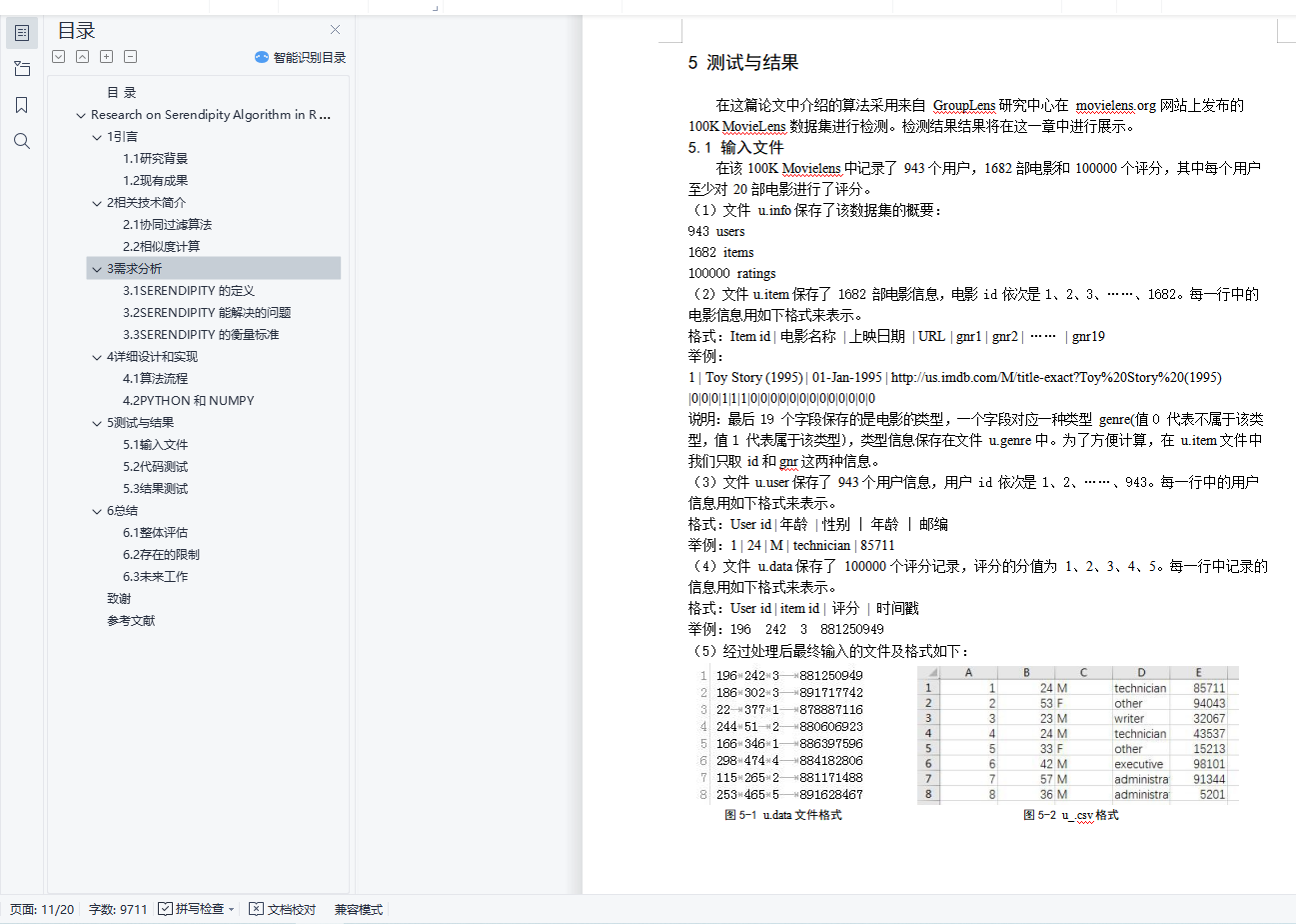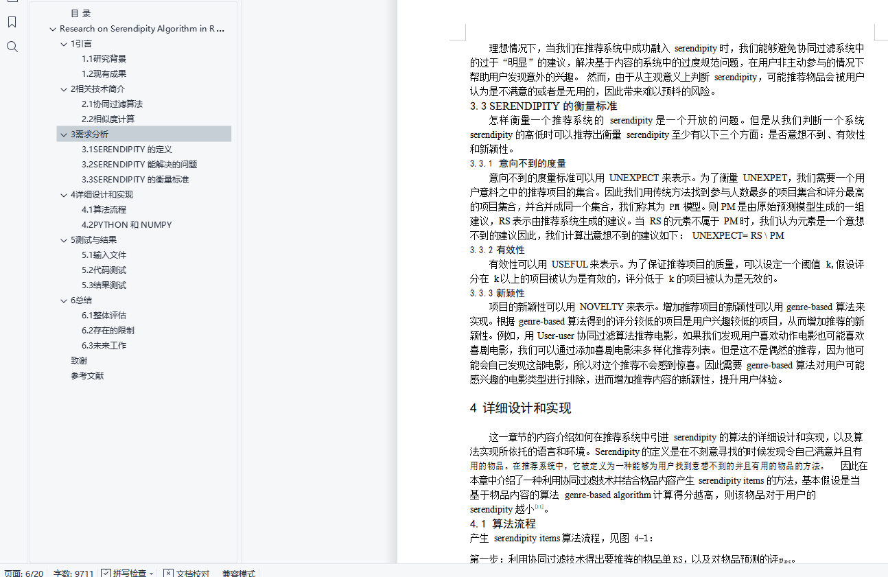 目 录摘要 1ABSTRACT 11引言 21.1研究背景 21.2现有成果 22相关技术简介 32.1协同过滤算法 32.1.1基于相似度的算法 32.1.2基于模型的算法 32.2相似度计算 43需求分析 43.1SERENDIPITY 的定义 43.2SERENDIPITY 能解决的问题 43.3SERENDIPITY 的衡量标准 53.3.1意向不到的度量 53.3.2有效性 53.3.3新颖性 54详细设计和实现 54.1算法流程 54.1.1利用协同过滤算法得出 RS 64.1.2原始推荐算法模型 PM 64.1.3得出用户意想不到的物品集 UNEXPECT 64.1.4利用有效性得出 USEFUL 64.1.5结合物品内容得出 SERENDIP(t) 64.2PYTHON 和 NUMPY 84.2.1工具的选择 84.2.2代码实现 85测试与结果 95.1输入文件 95.2代码测试 105.2.1初步预测 105.2.2得出 UNEXPECT 115.2.3得出 USEFUL 125.2.4得出 SERENDIP(t) 125.3结果测试 135.3.1GENRE 比较 135.3.2用户测试 146 总结 156.1整体评估 156.2存在的限制 156.3未来工作 16致谢 16参考文献 16在推荐系统中引入 Serendipity 的算法研究摘要:现今广泛使用的推荐算法所推荐的项目,往往出自于一个相对固定和狭窄的特征集合,因此忽略了用户兴趣的改变和对新鲜感的诉求。为了让用户有更好的用户体验,推荐系统应该考虑在准确率之外更加重要的衡量尺度,比如说新颖度、惊喜度、覆盖率、有效性等。这篇论文的核心是如何将推荐系统结合 serendipity 这个尺度。Serendipity 的定义是在一种轻松愉快的氛围中偶然发现让自己意想不到的物品,因此算法中融合了商品的属性特征 genre,评分越高的 genre 往往有着越低的 serendipity。算法代码是用带有科学计算包 numpy 的 pyhon 语言写成,并且在 100KMovieLens 数据集上进行测试,可以鉴别出在利用协同过滤算法推荐给用户的项目中,serendipity 较低的项目,进而提升推荐系统的用户体验。关键词:推荐系统;协同过滤;SerendipityResearch on Serendipity Algorithm in Recommendation SystemAbstract:Nowadays, the items recommended by widely used recommendation algorithms often come from a relatively fixed and narrow set of features, thus ignoring the changes of user’s interests and the demands of freshness. Therefore, recommendation system should consider other more important metrics outside of accuracy such as novelty, serendipity, coverage, usefulness in order to provide a better user experience. The core of this thesis is how to incorporate serendipity into a recommendation. Serendipity isdefined as finding something good by accident in a relaxed and delighted atmosphere, hence the algorithm considers items’ genre feature. Usually higher ratings correspond to lower serendipity. The algorithm implemented using Python in conjunction with the scientific computing package Numpy and tested on the 100K MovieLens dataset is shown to be capable of identifying less serendipitous items in the item set recommended to users by algorithm based on collaborative filtering, thereby improving user experience of the recommendation system.Key words:Recommendation System;Collaborative Filtering;Serendipity