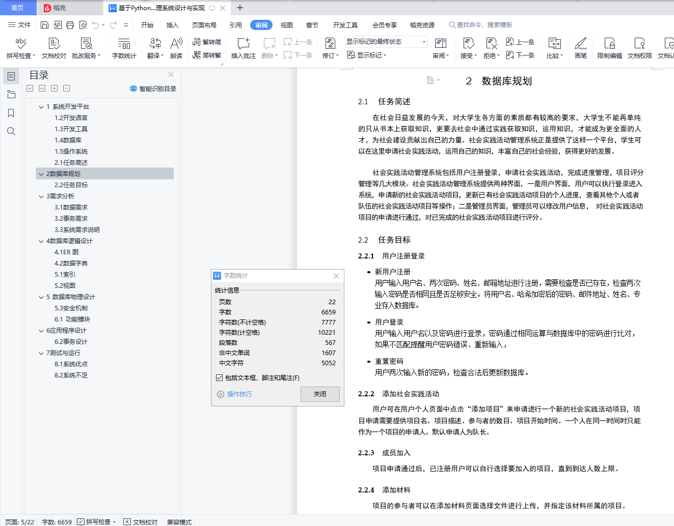 目录1系统开发平台 11.1 开发平台简介 . . . . . . . . . . . . . . . . . . . . . . . . . . . . . . . . . . . 11.2 开发语言 . . . . . . . . . . . . . . . . . . . . . . . . . . . . . . . . . . . . . 11.3 开发工具 . . . . . . . . . . . . . . . . . . . . . . . . . . . . . . . . . . . . . 11.4 数 据 库 . . . . . . . . . . . . . . . . . . . . . . . . . . . . . . . . . . . . . . . 11.5 操作系统 . . . . . . . . . . . . . . . . . . . . . . . . . . . . . . . . . . . . . 12数据库规划 22.1 任务简述 . . . . . . . . . . . . . . . . . . . . . . . . . . . . . . . . . . . . . 22.2 任务目标 . . . . . . . . . . . . . . . . . . . . . . . . . . . . . . . . . . . . . 22.2.1 用户注册登录 . . . . . . . . . . . . . . . . . . . . . . . . . . . . . . . 22.2.2 添加社会实践活动 . . . . . . . . . . . . . . . . . . . . . . . . . . . . 22.2.3 成员加入 . . . . . . . . . . . . . . . . . . . . . . . . . . . . . . . . . 22.2.4 添加材料 . . . . . . . . . . . . . . . . . . . . . . . . . . . . . . . . . 22.2.5 管理员操作 . . . . . . . . . . . . . . . . . . . . . . . . . . . . . . . . 33需求分析 43.1 数据需求 . . . . . . . . . . . . . . . . . . . . . . . . . . . . . . . . . . . . . 43.2 事务需求 . . . . . . . . . . . . . . . . . . . . . . . . . . . . . . . . . . . . . 43.2.1 数据录入 . . . . . . . . . . . . . . . . . . . . . . . . . . . . . . . . . 43.2.2 数据更新 . . . . . . . . . . . . . . . . . . . . . . . . . . . . . . . . . 53.2.3 数据查看 . . . . . . . . . . . . . . . . . . . . . . . . . . . . . . . . . 53.3 系统需求说明 . . . . . . . . . . . . . . . . . . . . . . . . . . . . . . . . . . . 53.3.1 初始数据库大小 . . . . . . . . . . . . . . . . . . . . . . . . . . . . . . 53.3.2 网络与共享要求 . . . . . . . . . . . . . . . . . . . . . . . . . . . . . . 53.3.3 备份与恢复 . . . . . . . . . . . . . . . . . . . . . . . . . . . . . . . . 53.3.4 用户界面 . . . . . . . . . . . . . . . . . . . . . . . . . . . . . . . . . 53.3.5 法律问题 . . . . . . . . . . . . . . . . . . . . . . . . . . . . . . . . . 54数据库逻辑设计 64.1 ER 图 . . . . . . . . . . . . . . . . . . . . . . . . . . . . . . . . . . . . . . . 64.2 数据字典 . . . . . . . . . . . . . . . . . . . . . . . . . . . . . . . . . . . . . 64.2.1 从数据字典中抽取出来的系统实体描述 . . . . . . . . . . . . . . . . . 64.2.2 从数据字典中抽取出来的联系的描述 . . . . . . . . . . . . . . . . . . 85数据库物理设计 95.1 索引 . . . . . . . . . . . . . . . . . . . . . . . . . . . . . . . . . . . . . . . . 95.2 视 图 . . . . . . . . . . . . . . . . . . . . . . . . . . . . . . . . . . . . . . . . 95.3 安全机制 . . . . . . . . . . . . . . . . . . . . . . . . . . . . . . . . . . . . . 95.3.1 系统安全 . . . . . . . . . . . . . . . . . . . . . . . . . . . . . . . . . 95.3.2 数据安全 . . . . . . . . . . . . . . . . . . . . . . . . . . . . . . . . . 95.3.3 其 他 . . . . . . . . . . . . . . . . . . . . . . . . . . . . . . . . . . . . 96应用程序设计 106.1功能模块 106.1.1用户注册登录 106.1.2项目添加加入 116.1.3材料管理 126.1.4后台管理 136.2事务设计 146.2.1用户相关 146.2.2项目相关 146.2.3材料相关 146.2.4分数相关 157测试与运行 167.0.1认证系统测试 167.0.2项目测试 167.0.3材料测试 177.0.4后台管理测试 1718. . . . . . . . . . . . . . . . . . . . . . . . . . . . . . . . . . . . 18. . . . . . . . . . . . . . . . . . . . . . . . . . . . . . . . . . . . 18
