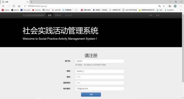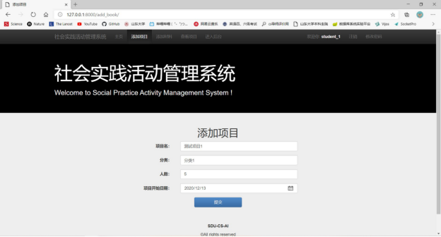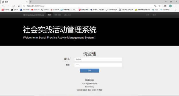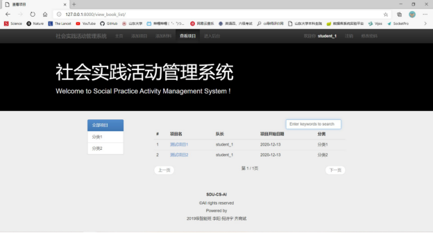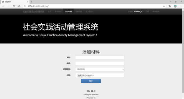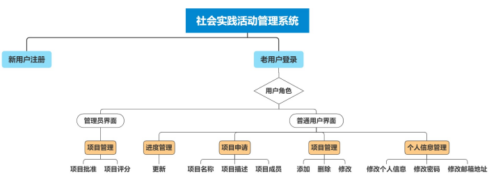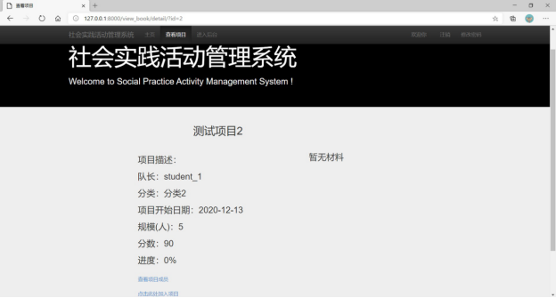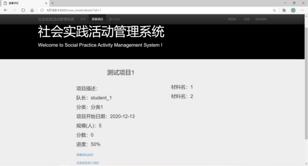 2.2.1用户注册登录•新用户注册用户输入用户名、两次密码、姓名、邮箱地址进行注册,需要检查是否已存在,检查两次输入密码是否相同且是否足够安全。将用户名、哈希加密后的密码、邮件地址、姓名、专业存入数据库。•用户登录用户输入用户名以及密码进行登录,密码通过相同运算与数据库中的密码进行比对, 如果不匹配提醒用户密码错误、重新输入,•重置密码用户两次输入新的密码,检查合法后更新数据库。2.2.2添加社会实践活动用户可在用户个人页面中点击“添加项目”来申请进行一个新的社会实践活动项目,项目申请需要提供项目名、项目描述、参与者的数目、项目开始时间。一个人在同一时间时只能作为一个项目的申请人。默认申请人为队长。2.2.3成员加入项目申请通过后,已注册用户可以自行选择要加入的项目,直到到达人数上限。2.2.4添加材料项目的参与者可以在添加材料页面选择文件进行上传,并指定该材料所属的项目。2.2.5管理员操作•移除成员管理员可在后台界面查看某项目的所有成员,点击成员右方的移除即可将该成员从成员列表中移除。•添加项目管理员可以添加项目,并指定队长。•项目评分管理员可以为项目进行评分,并在项目信息中展示出来。•查看所有用户管理员可以在后台查看所有用户的信息。