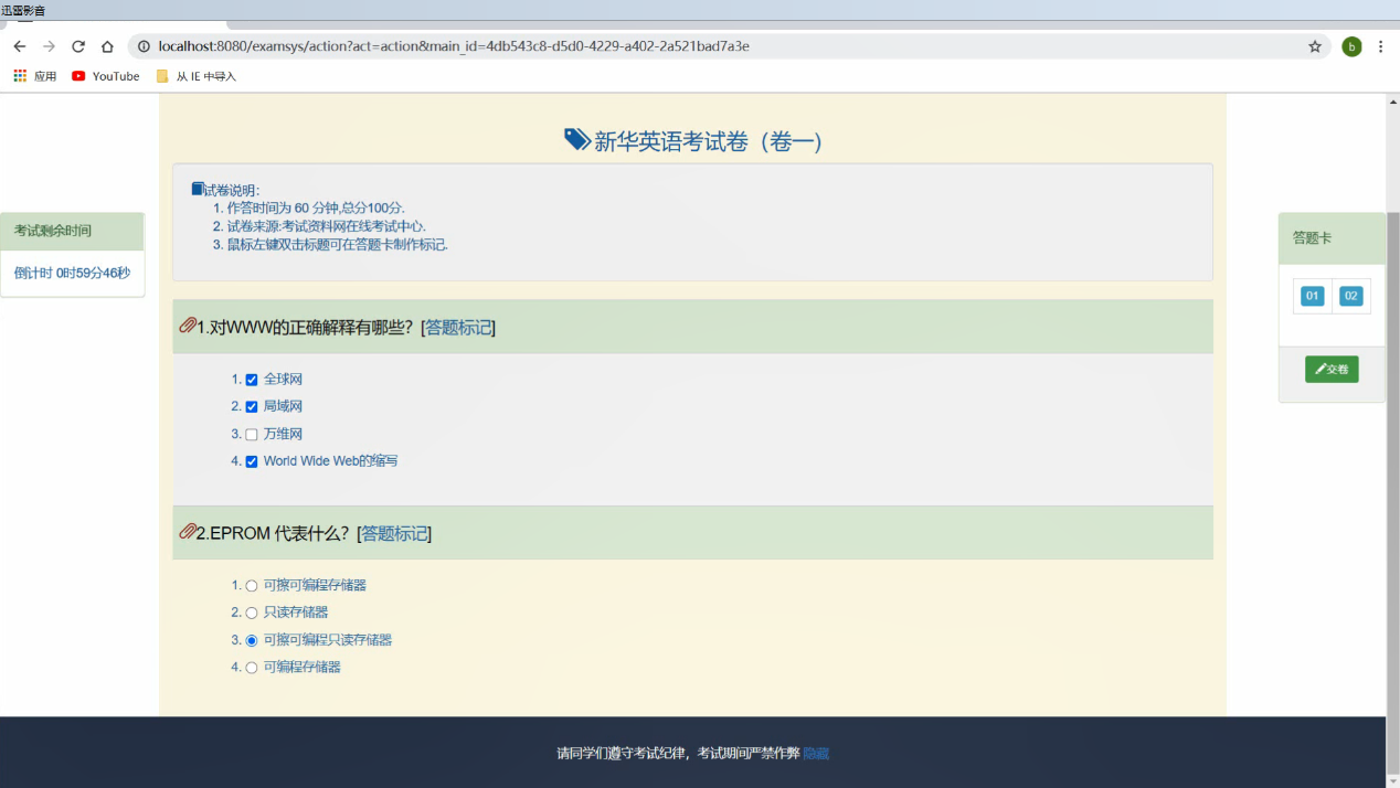 文中首先对课题背景,数据库基础理论和SQL语言进行了简单的讨论;对网络考试系统进行了详细分析,划分了具体的功能模块;最后,给出了网络考试系统应用程序的设计过程,以及每个功能模块的功能。