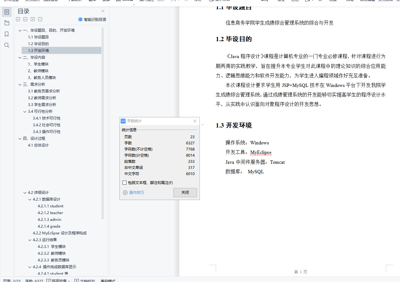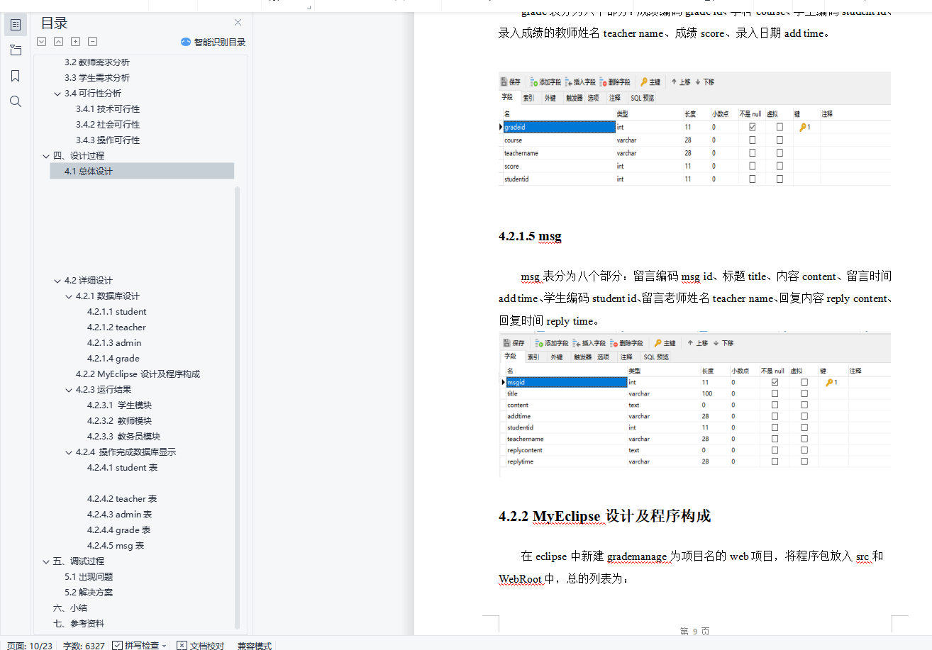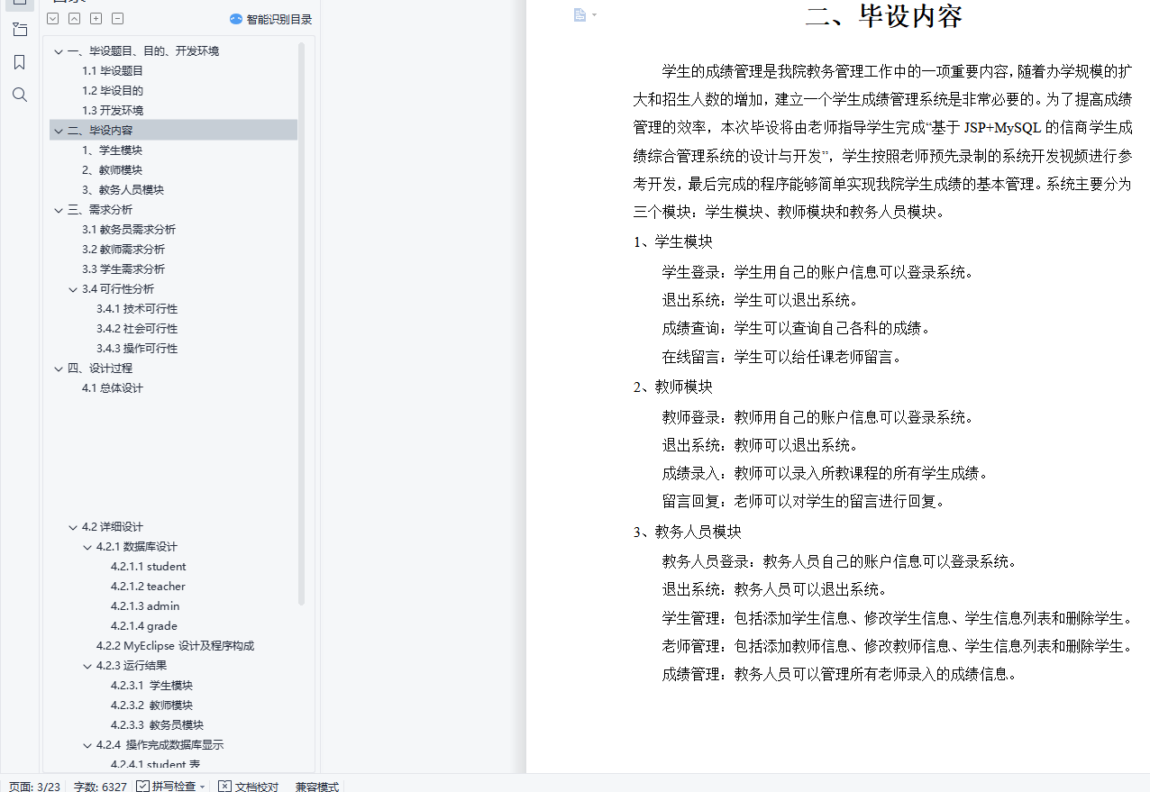 目录一、 毕设题目、目的、开发环境 11.1毕设题目 1信息商务学院学生成绩综合管理系统的综合与开发 11.2毕设目的 11.3开发环境 1二、毕设内容 11、学生模块 22、教师模块 23、教务人员模块 2三、 需求分析 23.1教务员需求分析 23.2教师需求分析 33.3学生需求分析 33.4可行性分析 33.4.1技术可行性 33.4.2社会可行性 43.4.3操作可行性 4四、设计过程 44.1总体设计 44.2详细设计 74.2.1数据库设计 74.2.2 MyEclipse设计及程序构成 94.2.3运行结果 104.2.4 操作完成数据库显示 16五、调试过程 185.1出现问题 185.2解决方案 18六、小结 19七、参考资料 20一、毕设题目、目的、开发环境1.1毕设题目信息商务学院学生成绩综合管理系统的综合与开发1.2毕设目的《Java程序设计》课程是计算机专业的一门专业必修课程,针对课程进行为期两周的实践教学,旨在提升本专业学生对此课程中的理论知识的综合应用能力、逻辑思维能力和软件开发能力,为学生进入编程领域作好充足准备。本次课程设计要求学生用JSP+MySQL技术在Windows平台下开发我院学生成绩综合管理系统,通过成绩管理系统的开发能够切实提高学生的程序设计水平,从实践中认识面向对象程序设计的开发思想。1.3开发环境操作系统:Windows开发工具:MyEclipseJava中间件服务器:Tomcat数据库: MySQL