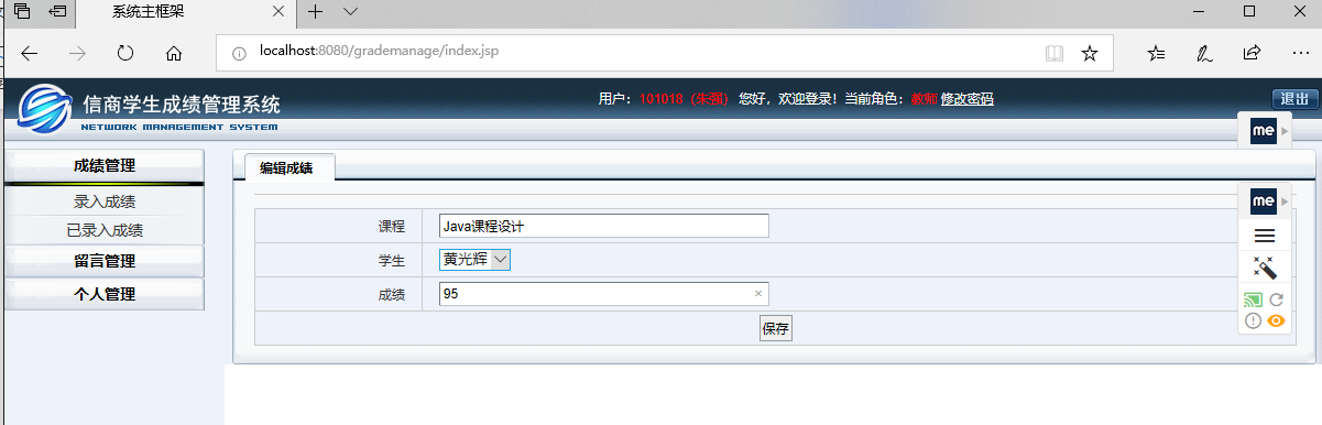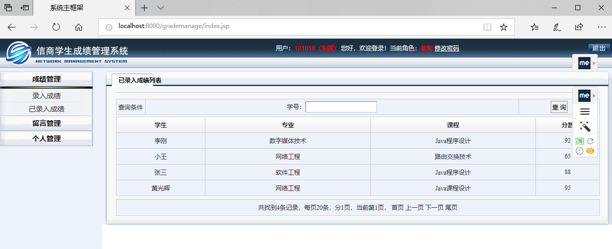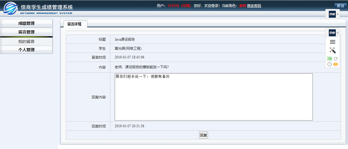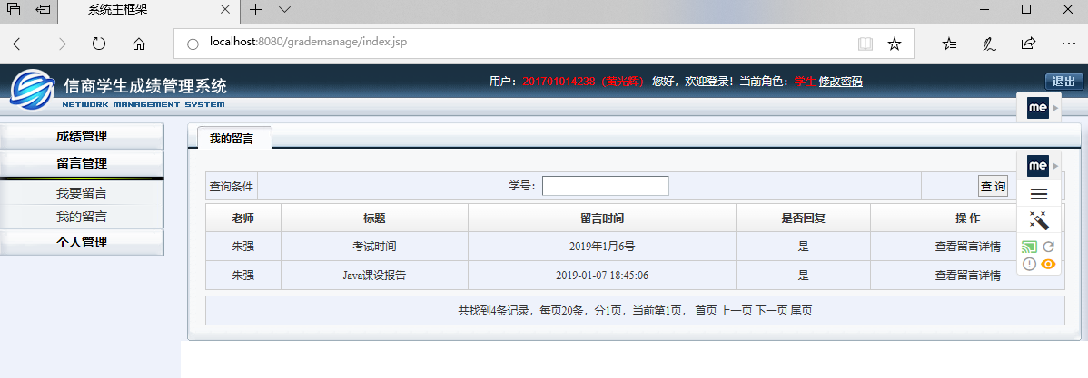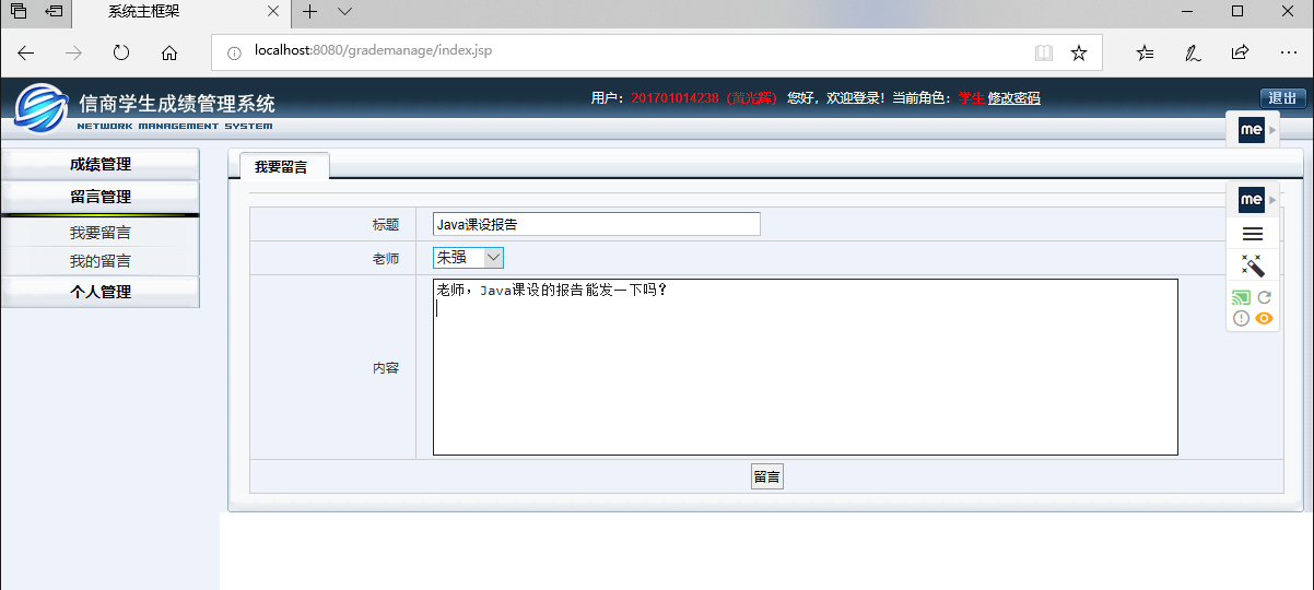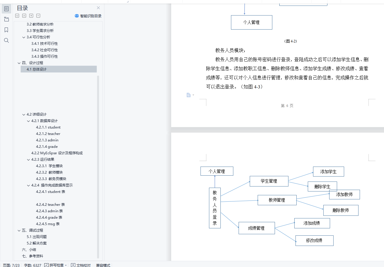 目录一、 毕设题目、目的、开发环境 11.1毕设题目 1信息商务学院学生成绩综合管理系统的综合与开发 11.2毕设目的 11.3开发环境 1二、毕设内容 11、学生模块 22、教师模块 23、教务人员模块 2三、 需求分析 23.1教务员需求分析 23.2教师需求分析 33.3学生需求分析 33.4可行性分析 33.4.1技术可行性 33.4.2社会可行性 43.4.3操作可行性 4四、设计过程 44.1总体设计 44.2详细设计 74.2.1数据库设计 74.2.2 MyEclipse设计及程序构成 94.2.3运行结果 104.2.4 操作完成数据库显示 16五、调试过程 185.1出现问题 185.2解决方案 18六、小结 19七、参考资料 20一、毕设题目、目的、开发环境1.1毕设题目信息商务学院学生成绩综合管理系统的综合与开发1.2毕设目的《Java程序设计》课程是计算机专业的一门专业必修课程,针对课程进行为期两周的实践教学,旨在提升本专业学生对此课程中的理论知识的综合应用能力、逻辑思维能力和软件开发能力,为学生进入编程领域作好充足准备。本次课程设计要求学生用JSP+MySQL技术在Windows平台下开发我院学生成绩综合管理系统,通过成绩管理系统的开发能够切实提高学生的程序设计水平,从实践中认识面向对象程序设计的开发思想。1.3开发环境操作系统:Windows开发工具:MyEclipseJava中间件服务器:Tomcat数据库: MySQL