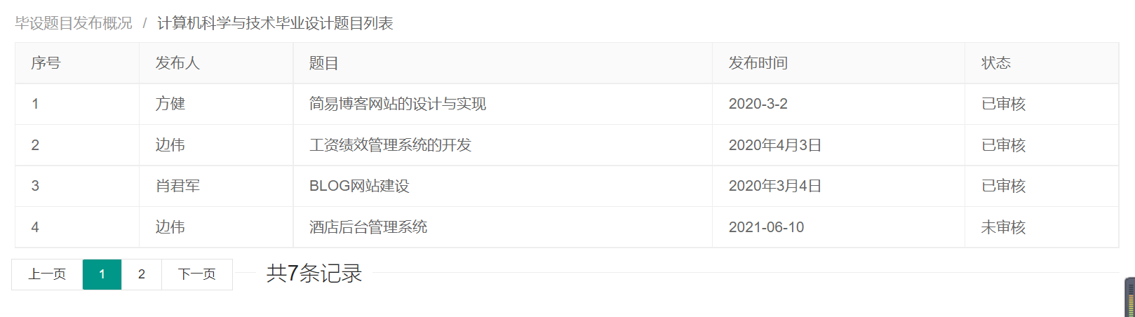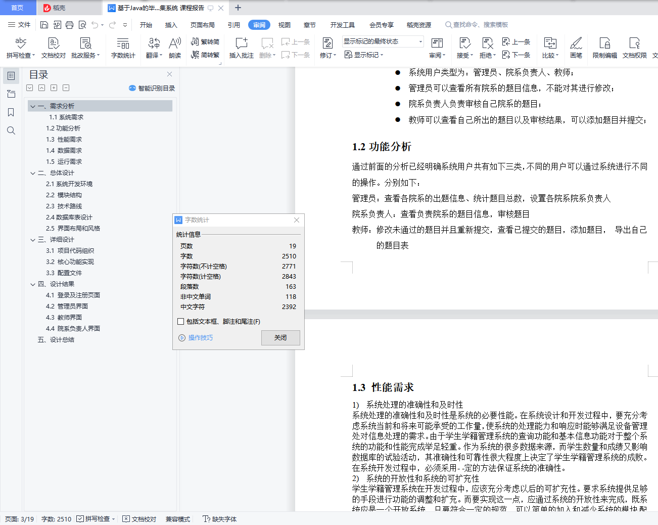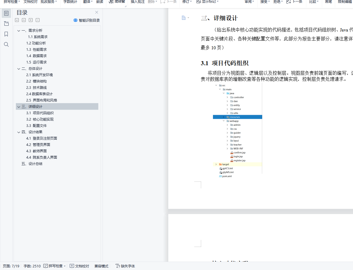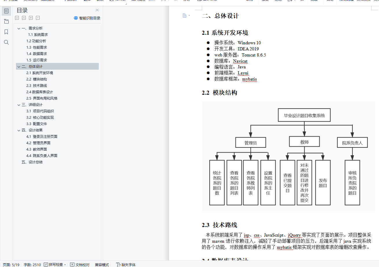 一、需求分析 11.1系统需求 11.2功能分析 11.3 性能需求 21.4 数据需求 21.5 运行需求 2二、总体设计 32.1系统开发环境 32.2 模块结构 32.3 技术路线 32.4数据库表设计 32.5 界面布局和风格 4三、详细设计 53.1 项目代码组织 53.2 核心功能实现 63.3 配置文件 14四、设计结果 144.1 登录及注册页面 144.2 管理员界面 154.3 教师界面 164.4 院系负责人界面 16五、设计总结 17一、需求分析1.1系统需求随着近些年高校的持续扩招,学生人数逐年增加。为了满足广大学生的求学要求,各高校的师资力量、硬件配置也随之加强。这样一来,日常行政部门的工作也就越来越繁重。传统的管理方式耗费大量的资源,毕业设计题目收集系统比传统的手工管理方式相比不但节约资源,而且更加方便,便于查询和修改信息。毕业设计题目收集系统应该提供管理员、系主任和教师三种用户类型。系统管理员登录系统后可以查看出题进度、各院系的出题数以及已经审核通过的题目数,还可以将某位教师设置为系主任;院系负责人(系主任)登录后的主要操作是审核自己所负责院系的题目(通过或者不通过);教师登录后的主要操作是出题,将题目提交给院系负责人进行审核,若该题目被驳回,则对其进行修改后继续提交直至审核通过,以及查看自己已提交的题目(教师还可以将自己的题目表导出为Execl)。将系统需求加以总结,得系统需求如下:系统可以运行在Windows操作系统平台上,并具有友好的用户界面;系统用户类型为:管理员、院系负责人、教师;管理员可以查看所有院系的题目信息,不能对其进行修改;院系负责人负责审核自己院系的题目;教师可以查看自己所出的题目以及审核结果,可以添加题目并提交;