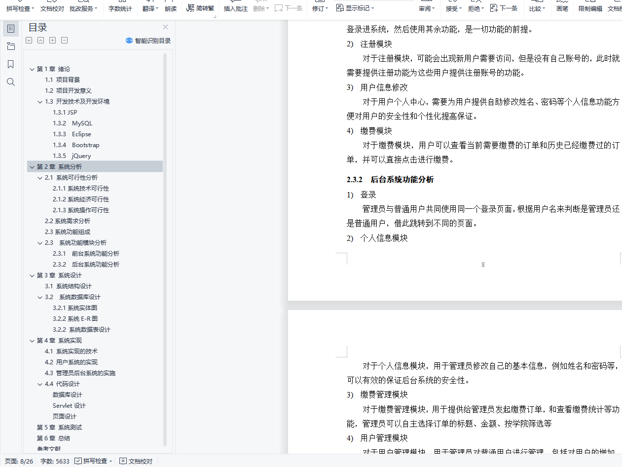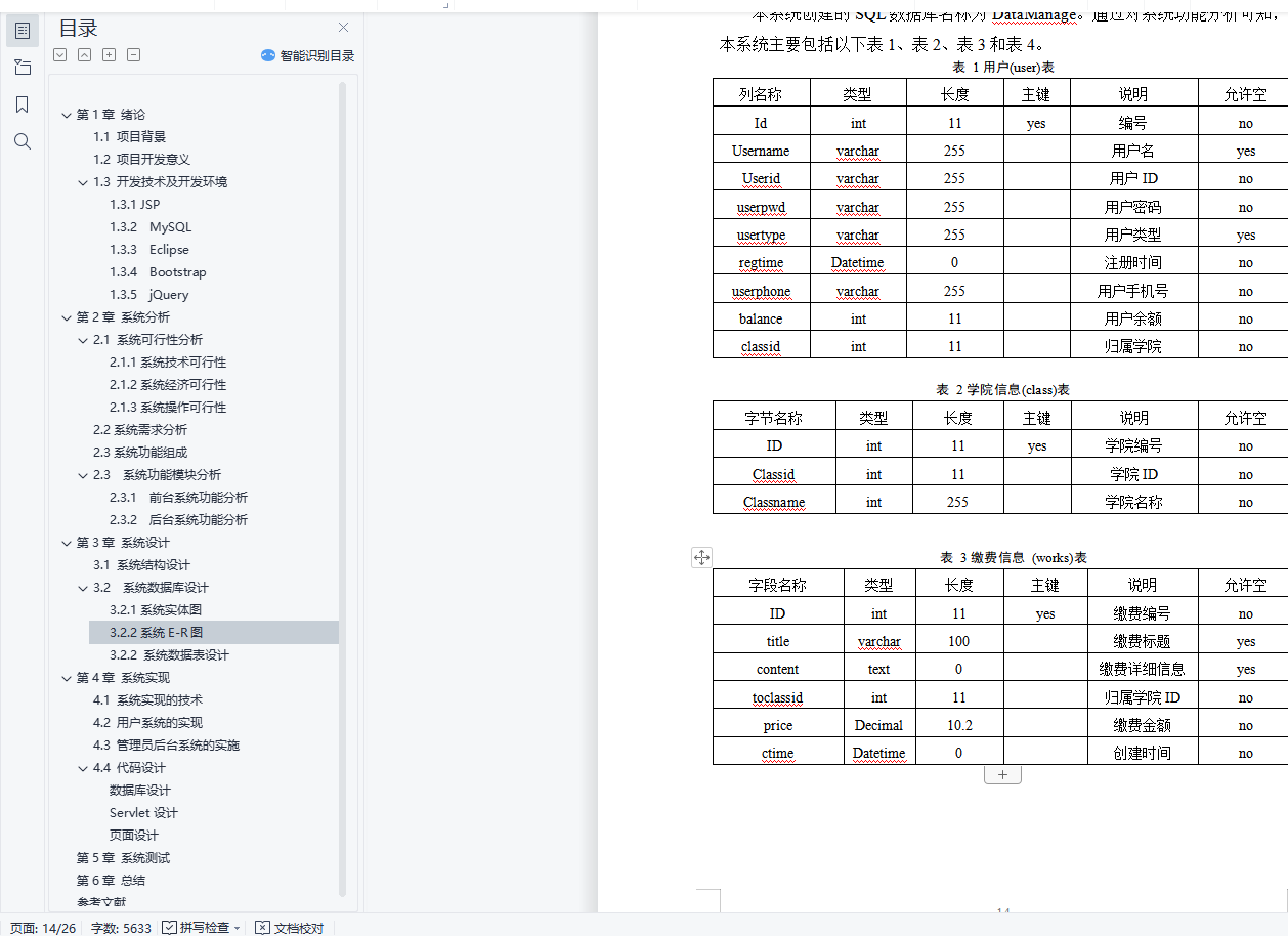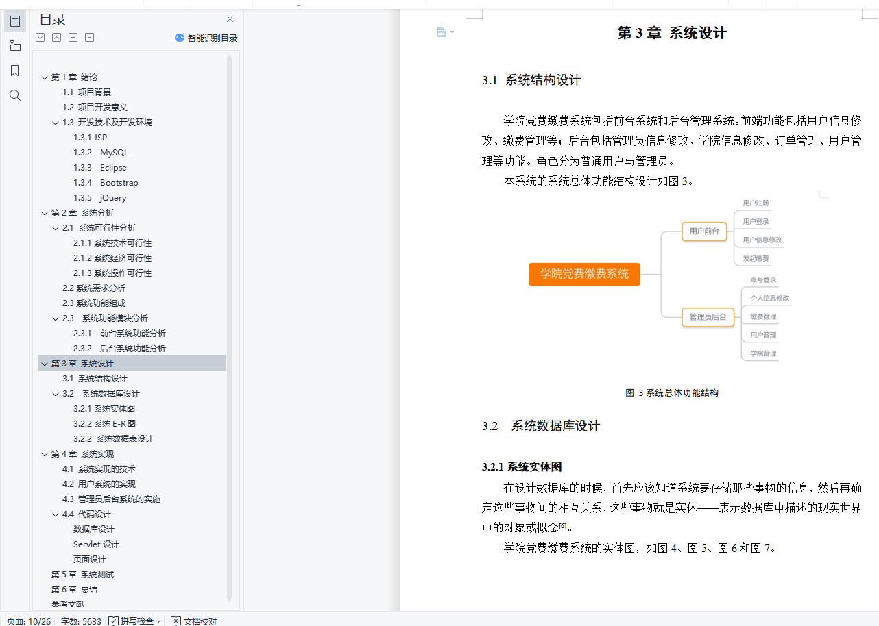 基于Java Web的学院党费缴费系统设计与实现摘 要随着互联网的发展,互联网的便捷性和安全性也惠及普及到每一个人,每行每业也都随着互联网的发展发生翻天覆地的变化,一些缴费系统也应运而生,大大方便了用户的缴费和管理员的统计。减少了传统缴费方式的繁琐和不安全性,本次的党费缴费系统就是其中的一种实际运用。本系统采用B/S形式进行开发,利用JSP,采用eclipse作为开发工具,后台数据库采用MySQL,可实现用户自助注册、登录、缴费和管理员缴费管理和用户管理及学院管理和统计。系统测试运行后功能完整,效果良好关键字:java web,mysql,缴费系统,用户管理Design and Implementation of College Party Fee Payment System Based on Java WebAbstractWith the development of the Internet, the convenience and security of the Internet also benefit and popularize everyone. With the development of the Internet, every industry has undergone earth-changing changes. Some payment systems have emerged at the right moment, which greatly facilitates the payment of users and the statistics of administrators. It reduces the complexity and insecurity of traditional payment methods. The party fee payment system is one of the practical applications.The system is developed in the form of B/S, using JSP, using Eclipse as a development tool, and using Mysql as a backstage database. It can realize self-service registration, login, payment and administrator payment management, user management and college management and statistics. The function of the system is complete and the effect is good.Key words: JAVA WEB, MYSQL, payment system, user management目 录第1章 绪论 51.1 项目背景 51.2 项目开发意义 51.3 开发技术及开发环境 51.3.1 JSP 51.3.2 MySQL 61.3.3 Eclipse 61.3.4 Bootstrap 61.3.5 jQuery 6第2章 系统分析 72.1 系统可行性分析 72.1.1系统技术可行性 72.1.2系统经济可行性 72.1.3系统操作可行性 72.2系统需求分析 72.3系统功能组成 82.3 系统功能模块分析 92.3.1 前台系统功能分析 92.3.2 后台系统功能分析 9第3章 系统设计 113.1 系统结构设计 113.2 系统数据库设计 113.2.1系统实体图 113.2.2系统E-R图 143.2.2 系统数据表设计 15第4章 系统实现 174.1 系统实现的技术 174.2 用户系统的实现 174.3 管理员后台系统的实施 194.4 代码设计 24第5章 系统测试 25第6章 总结 26参考文献 27
