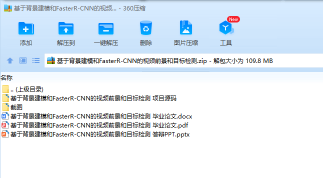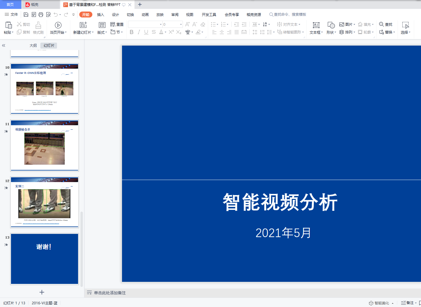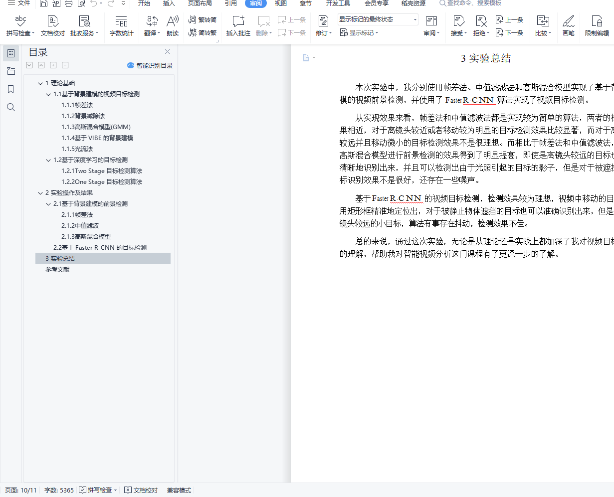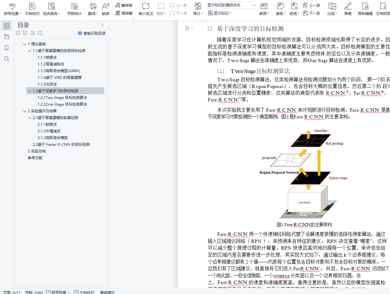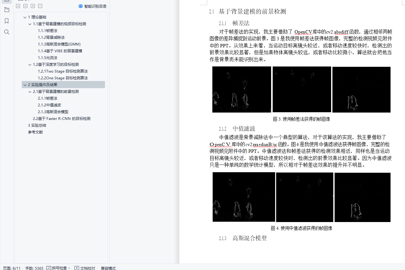 摘 要本次实验中,我选择使用传统方法进行前景检测以及使用深度学习方法进行目标检测两个题目,并分别使用帧差法、中值滤波法和高斯混合模型实现了基于背景建模的视频前景检测,以及使用了 Faster R-CNN 算法实现了视频目标检测。首先,我在 CDNET(ChangeDetection.NET)官网上选取了一段用于目标检测的视频,然后用 OpenCV 分别实现了帧差法、中值滤波法以及高斯混合模型,并对这些方法的实现效果进行了比较分析。接着我将视频拆帧,对每张帧图像用 Faster R-CNN 进行目标检测,并将检测后的帧图像合并成一段视频得到目标检测后的视频。最后,我对以上实现方法进行了总结,进一步加深了对目标检测算法的理解。关键词:视频目标检测;帧差法;中值滤波;高斯混合模型;Faster R-CNN目 录1 理论基础 21.1 基于背景建模的视频目标检测 21.2 基于深度学习的目标检测 62 实验操作及结果 72.1 基于背景建模的前景检测 82.2 基于 Faster R-CNN 的目标检测 103 实验总结 11参考文献 12