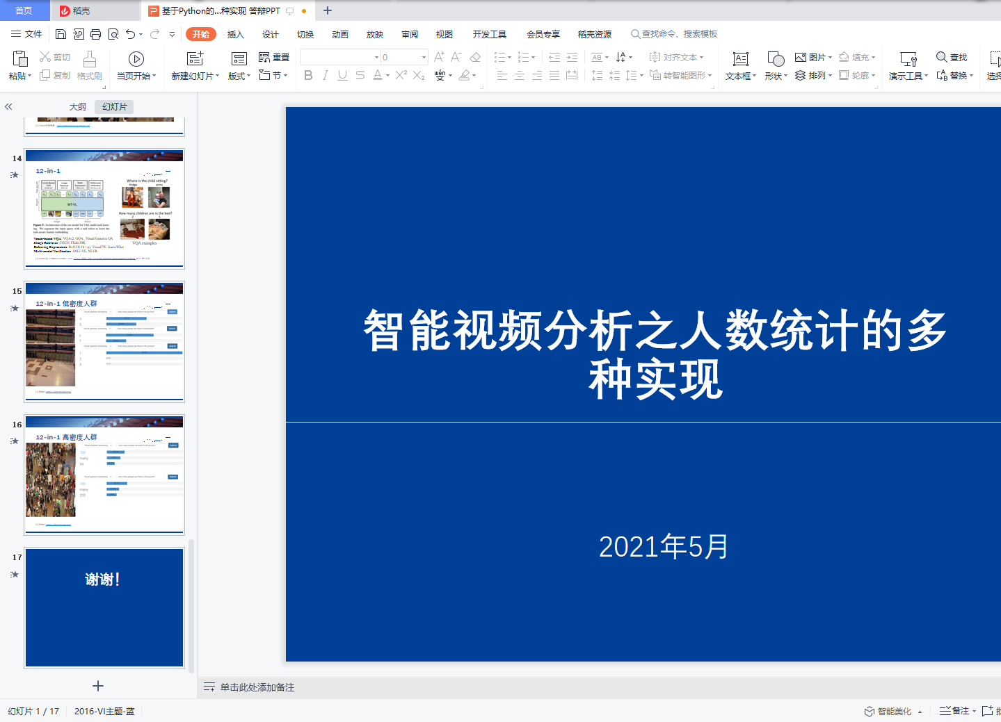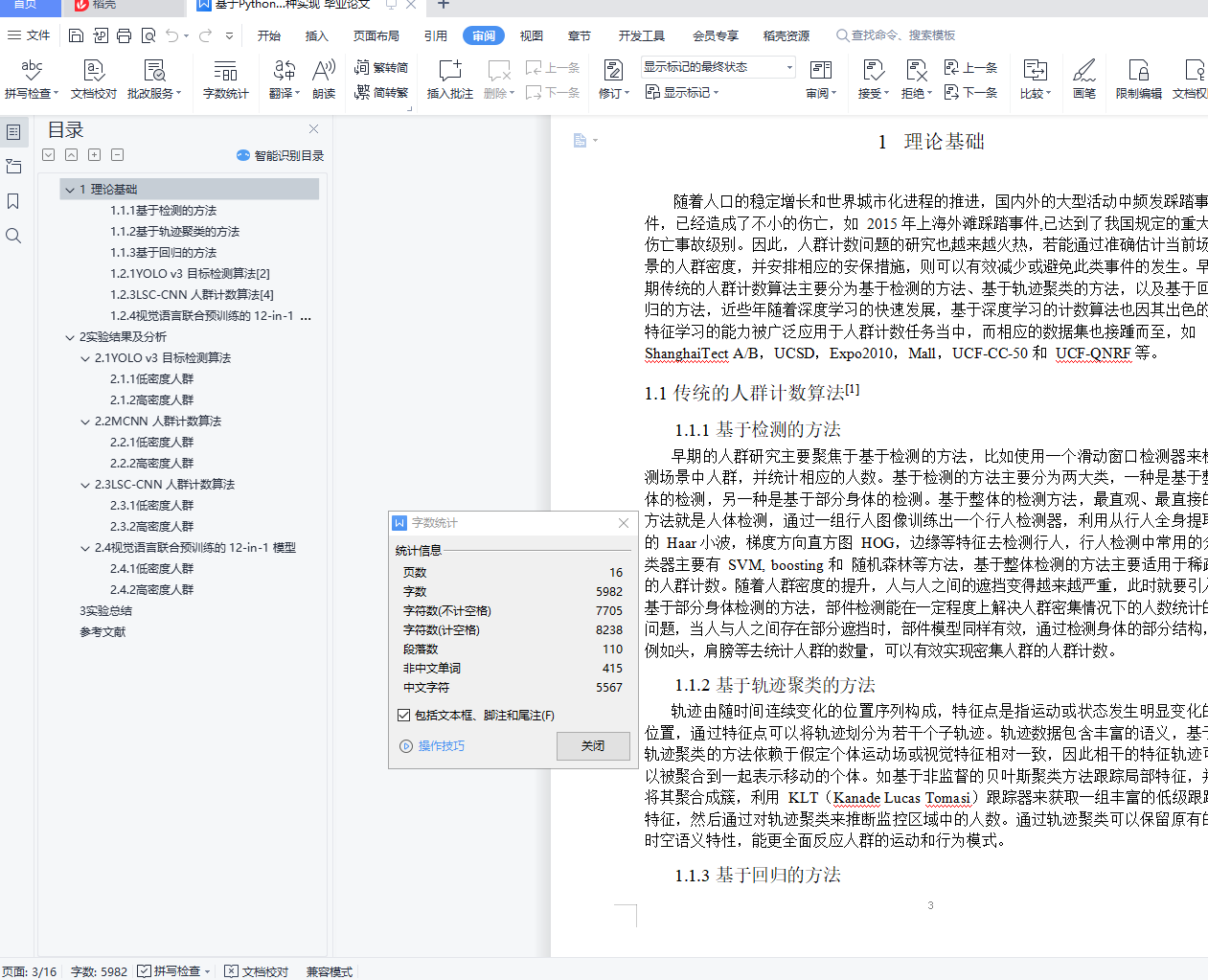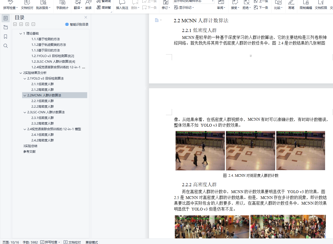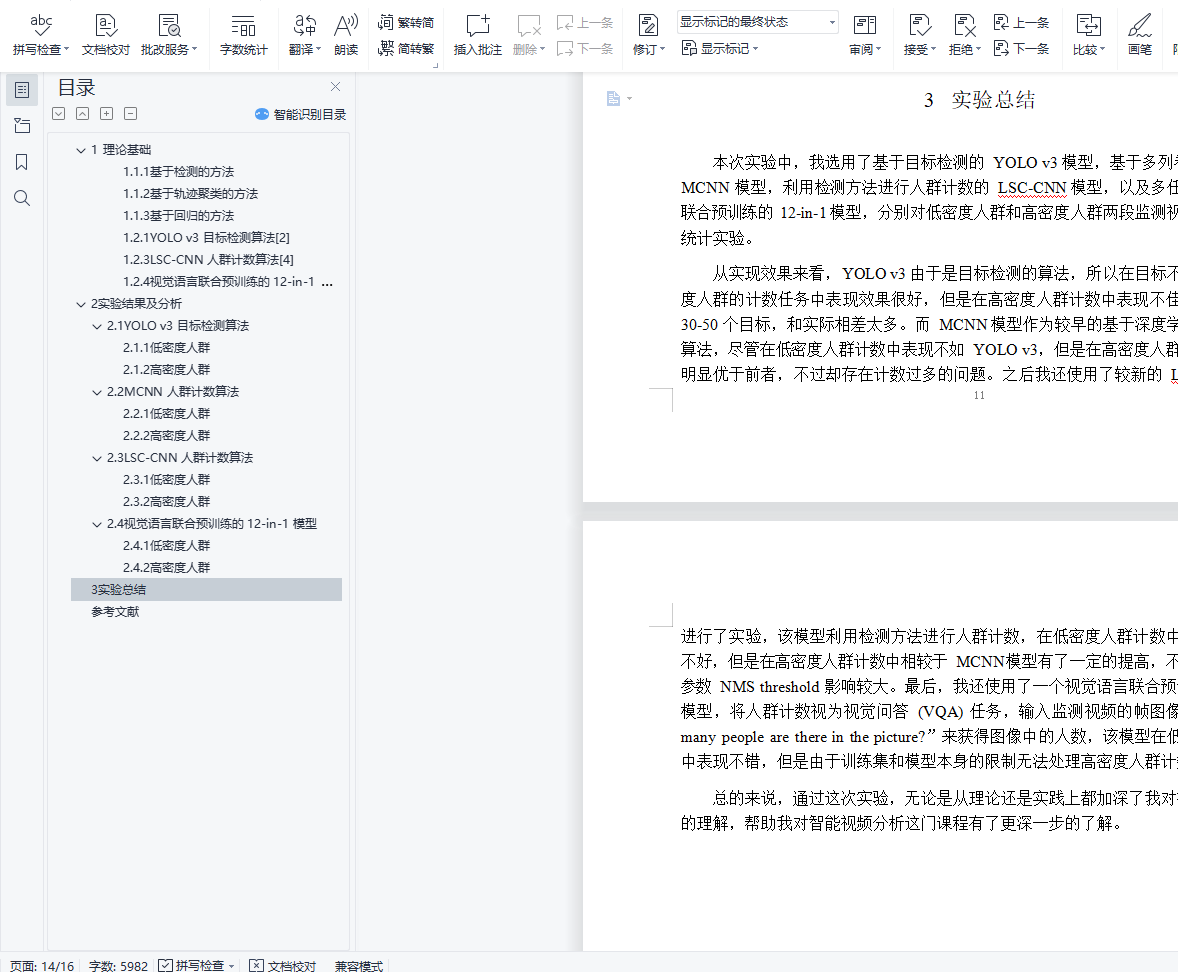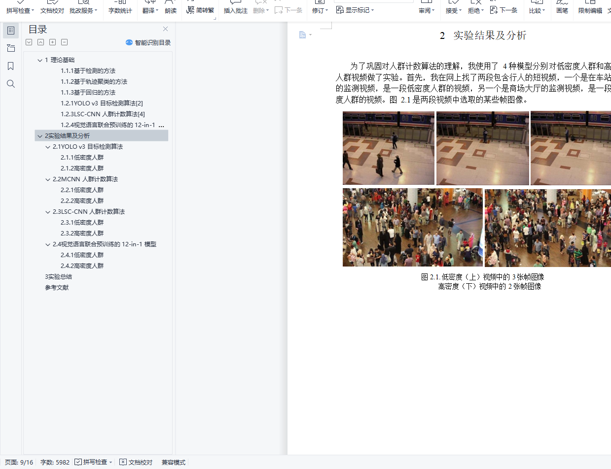 摘 要本次实验中,使用所学方法进行人数统计的实验。我主要使用了深度学习的方法,选用了基于目标检测的 YOLO v3 模型,基于多列卷积神经网络的 MCNN 模型,利用检测方法进行人群计数的 LSC-CNN 模型,以及多任务的视觉语言联合预训练的 12-in-1 模型,使用 4 种不同的模型分别对低密度人群和高密度人群两段监测视频进行了人数统计实验。首先,我在 CDNET 和 Videezy 网站上分别选取了一段低密度人群和一段高密度人群的视频,然后分别使用 YOLO v3 和 MCNN 两种模型对两段视频进行了计数实验, 发现 YOLO v3 的低密度人群计数效果更好,而 MCNN 在高密度人群计数中表现更佳。接着,我使用了较新的利用检测方法进行人群计数的 LSC-CNN 模型对两段视频做了实验,发现在高密度人群计数中效果得到了提升。然后我还将人群计数任务联系到了VQA 任务,并使用了最新提出的视觉语言联合预训练的 12-in-1 模型进行了实验,发现在低密度人群计数中效果理想。最后,我对以上的实现方法进行了比较总结,进一步加深了对人群计数算法的理解。关键词:人群计数;深度学习;多种计数模型;高低密度人群目 录1 理论基础 22 实验结果及分析 82.1 YOLO v3 目标检测算法 92.2 MCNN 人群计数算法 92.3 LSC-CNN 人群计数算法 102.4 视觉语言联合预训练的 12-in-1 模型 113 实验总结 10参考文献 12