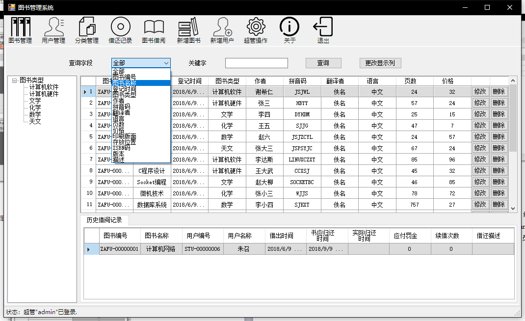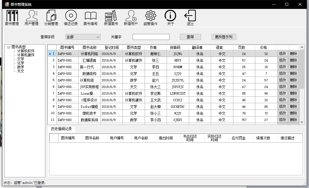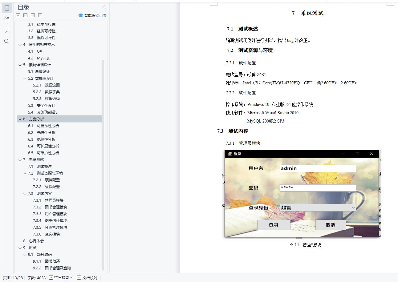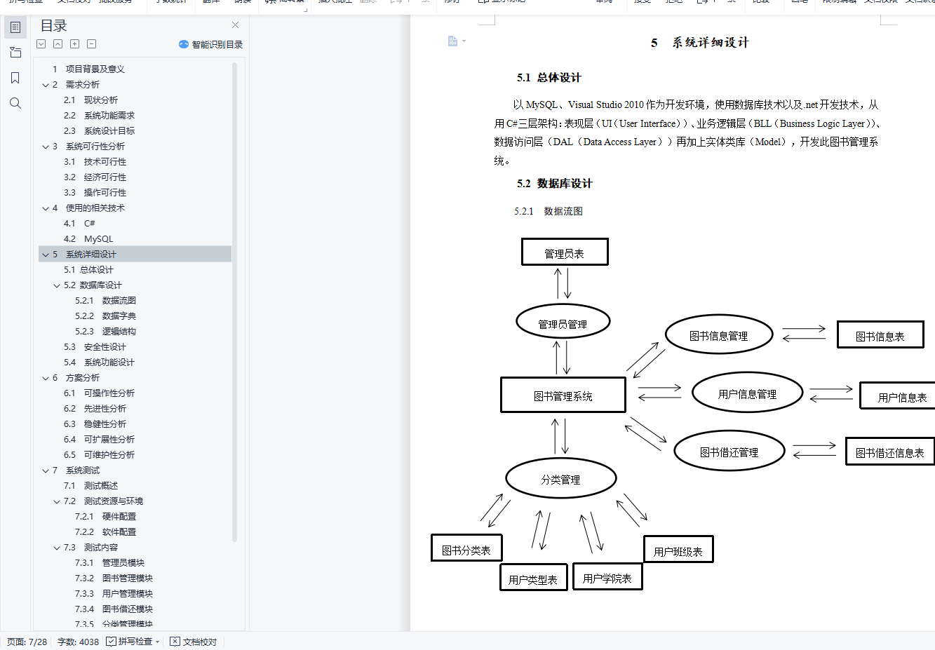 目录1 项目背景及意义 12 需求分析 12.1 现状分析 12.2 系统功能需求 12.3 系统设计目标 23 系统可行性分析 23.1 技术可行性 23.2 经济可行性 23.3 操作可行性 24 使用的相关技术 34.1 C# 34.2 MySQL 35 系统详细设计 35.1 总体设计 35.2 数据库设计 35.2.1 数据流图 35.2.2 数据字典 45.2.3 逻辑结构 65.3 安全性设计 75.4 系统功能设计 76 方案分析 86.1 可操作性分析 86.2 先进性分析 86.3 稳健性分析 86.4 可扩展性分析 86.5 可维护性分析 87 系统测试 97.1 测试概述 97.2 测试资源与环境 97.2.1 硬件配置 97.2.2 软件配置 97.3 测试内容 97.3.1 管理员模块 97.3.2 图书管理模块 107.3.3 用户管理模块 117.3.4 图书借还模块 127.3.5 分类管理模块 127.3.6 查询模块 138 心得体会 149 附录 159.1 部分源码 159.1.1 图书借还 159.2.2 图书管理及查询 18