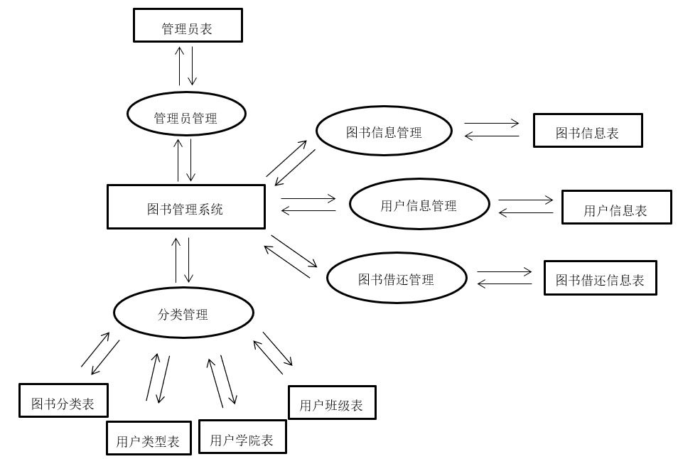 2.2 系统功能需求图书管理系统是针对图书馆工作人员开发的管理软件,实现对图书信息、用户信息的管理功能。本系统主要能够完成以下功能:1.图书信息管理(查询、修改、新增、删除)2.用户信息管理(查询、修改、新增、删除)3.借书操作、还书操作、续借操作、借书记录查看4.图书和用户分类管理(查询、修改、新增、删除)2.3 系统设计目标1.系统中的数据表设计合理、高效、数据冗余少2.软件界面友好、安全性高3.易于维护、方便升级