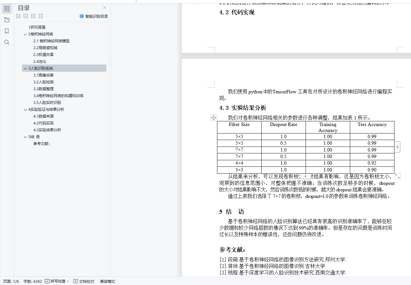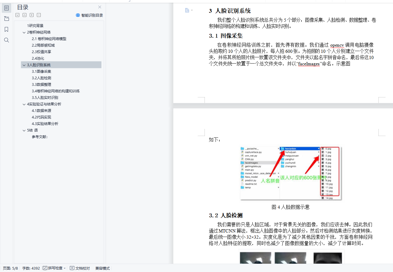 基于卷积神经网络的人脸识别摘 要:随着计算机科技与应用的发展,人脸识别作为一种常用的图像识别技术越来越受到关注。卷积神经网络的出现,大大提高了计算机对图像内容的分析和判断能力。通过结合卷积神经网络和人脸识别,形成一套以卷积神经网络为核心的人脸识别系统。关键词:人脸识别;图像识别;卷积神经网络目录1 研究背景 12 卷积神经网络 32.1 卷积神经网络模型 32.2 局部感知域 42.3 权值共享 42.4 池化 53 人脸识别系统 63.1 图像采集 63.2 人脸检测 73.3 数据整理 73.4 卷积神经网络的构建和训练 83.5 人脸实时识别 84 实验验证与结果分析 84.1 数据来源 84.2 代码实现 84.3 实验结果分析 95 结 语 9参考文献: 91研究背景随着计算机视觉的相关理论与应用研究的快速发展,计算机视觉技术在日常生活中应用的优越性也日益突显出来。用计算机对图像进行识别是计算机从相关的视频或图像序列中提取出相应的特征,从而让计算机“理解”图像的内容,并能正确分类的技术。安防意识的提升也让人们对于公共以及个人的安全需求不断攀升,使得计算机视觉在人脸识别、人脸检测等方面有了很高的应用价值。
