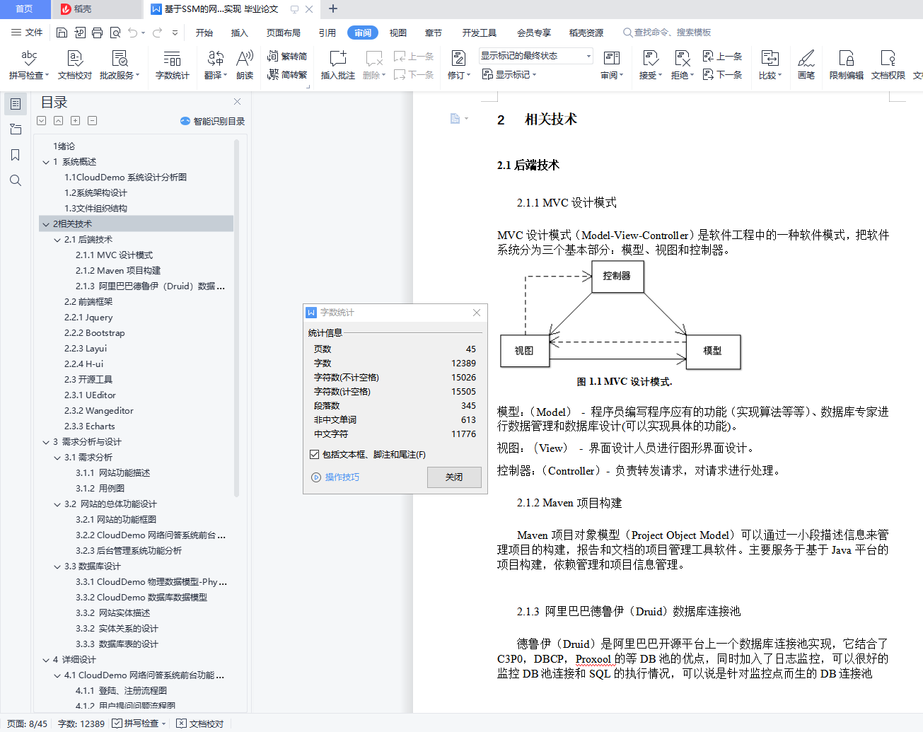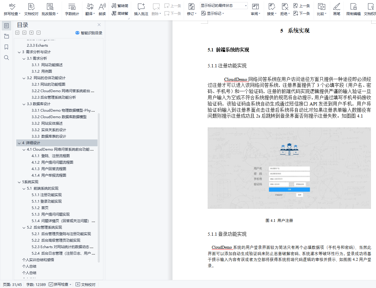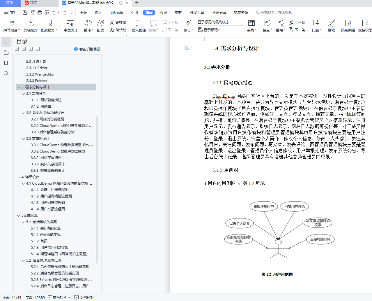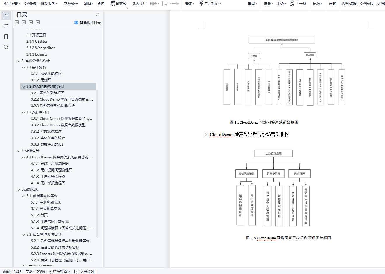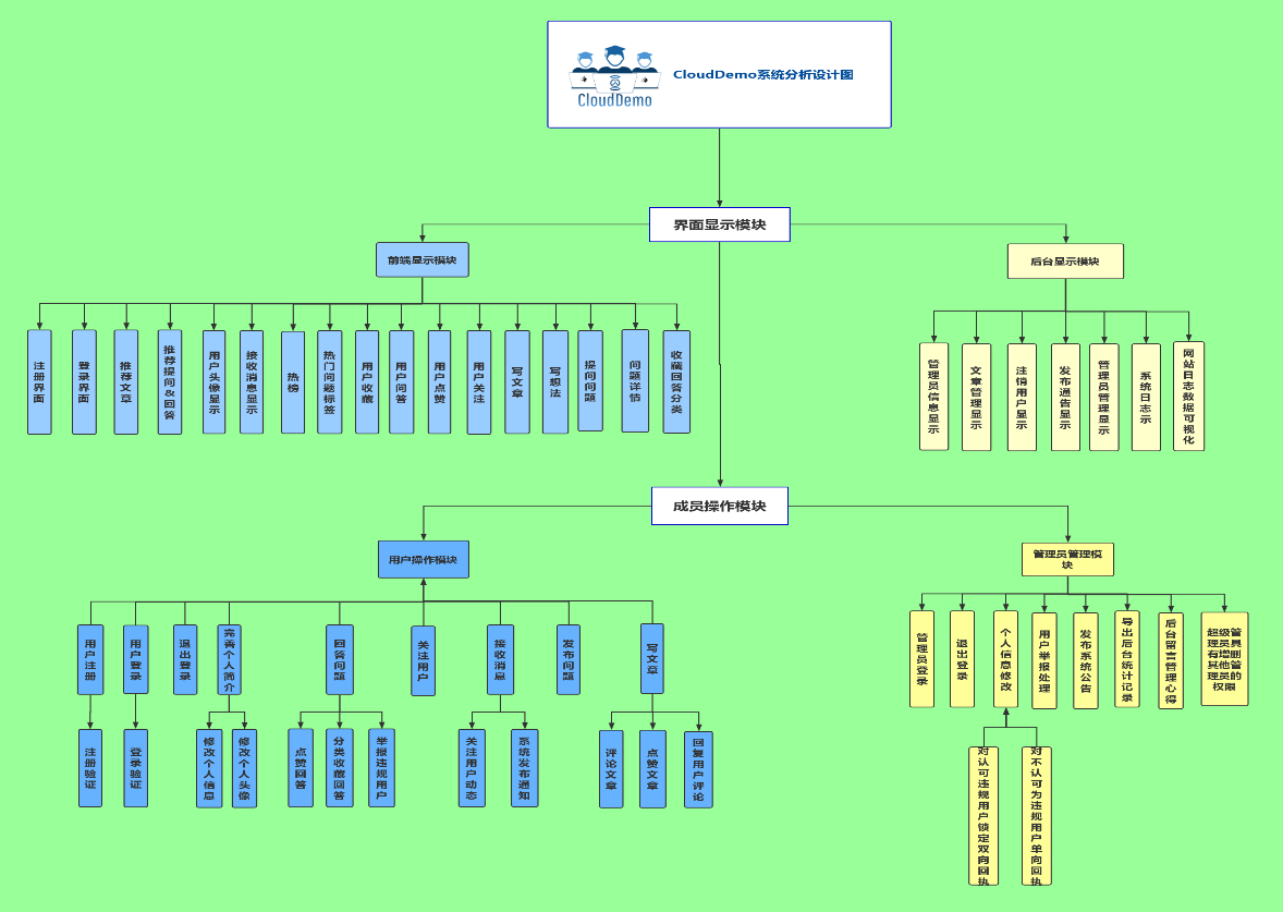 内 容 摘 要CloudDemo是网络问答社区,连接各行各业的用户。用户分享着彼此的知识、经验和见解,为中文互联网源源不断地提供多种多样的信息。通过“CloudDemo网络问答社区”开发让我们更好的学习和掌握此类产品所需要的技术。从而提高我们在JavaEE企业级框架应用技术(Spring、Spring MVC、MyBatis)、Ajax技术 、MySQL数据库、jQuery、前端设计框架的使用以及在软件项目的需求分析、数据库应用能力、概要设计、详细设计能力。与此同时培养我们综合职业素质、培养团队工作的精神和应用软件开发的综合职业能力。使我们经历软件开发综合实训完整的工作过程。关键字:JavaEE;Spring;SpringMVC;MyBatis AjaxAbstractCloudDemo is an online question-and-answer community that connects users from all walks of life.Users share their knowledge, experience and insights, providing a constant stream of diverse information to the Chinese Internet.The development of "CloudDemo online question-and-answer community" enables us to better learn and master the technologies needed for such products.So as to improve our application technology in JavaEE enterprise-level framework (Spring, Spring MVC, MyBatis), Ajax technology, MySQL database, jQuery, front-end design framework, demand analysis, database application ability, outline design and detailed design ability in software projects.At the same time, we cultivate our comprehensive professional quality, team work spirit and comprehensive professional ability of application software development.So that we go through the software development integrated training complete work process.Key Words:JavaEE;Spring;SpringMVC;MyBatis Ajax目 录1 绪论 61 系统概述 71.1 CloudDemo系统设计分析图 71.2 系统架构设计 71.3 文件组织结构 82 相关技术 92.1后端技术 92.1.1 MVC设计模式 92.1.2 Maven项目构建 92.1.3 阿里巴巴德鲁伊(Druid)数据库连接池 92.2前端框架 102.2.1 Jquery 102.2.2 Bootstrap 102.2.3 Layui 102.2.4 H-ui 102.3开源工具 102.3.1 UEditor 102.3.2 Wangeditor 112.3.3 Echarts 113 需求分析与设计 113.1需求分析 113.1.1 网站功能描述 113.1.2 用例图 113.2 网站的总体功能设计 123.2.1网站的功能框图 133.2.2 CloudDemo网络问答系统前台功能分析 143.2.3后台管理系统功能分析 153.3数据库设计 163.3.1 CloudDemo物理数据模型-Physical Data Modal 163.3.2 CloudDemo数据库数据模型 173.3.2 网站实体描述 173.3.2 实体关系的设计 213.3.3 数据库表的设计 224 详细设计 274.1 CloudDemo网络问答系统前台功能流程图 274.1.1 登陆、注册流程图 274.1.2 用户提问问题流程图 284.1.3 用户回答流程图 304.1.4 用户举报流程图 315 系统实现 325.1 前端系统的实现 325.1.1注册功能实现 325.1.1登录功能实现 325.1.2 首页 335.1.3 用户提问问题实现 345.1.4 问题详情页(回答或关注问题)实现 345.2 后台管理系统实现 355.2.1 后台管理员登陆与注册功能实现 355.2.2 后台高级管理员功能实现 365.2.3 Echarts对网站统计的数据动态处理实现 375.2.4 后台日志管理(注册日志、用户操作日志)实现 37