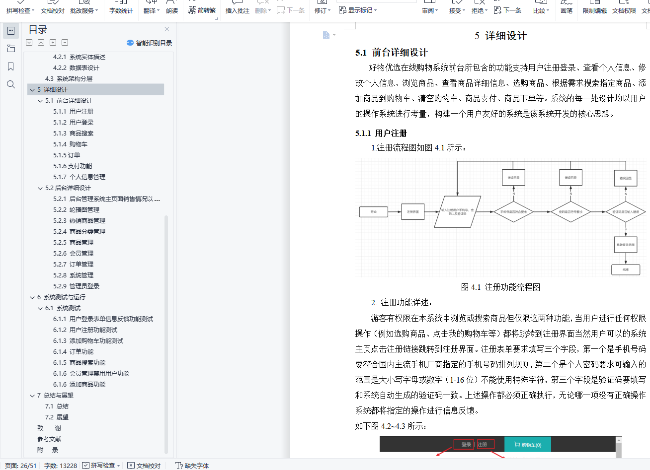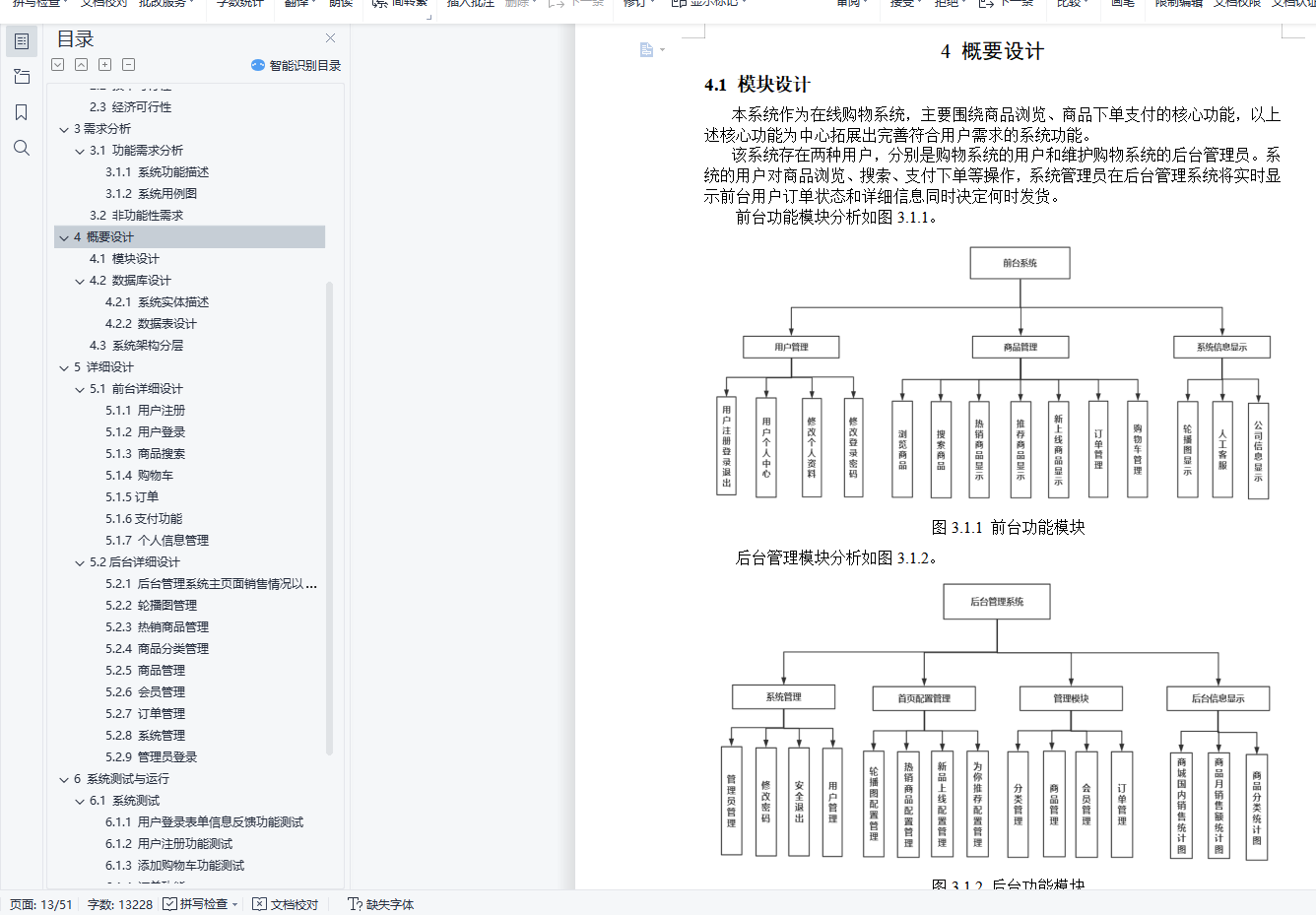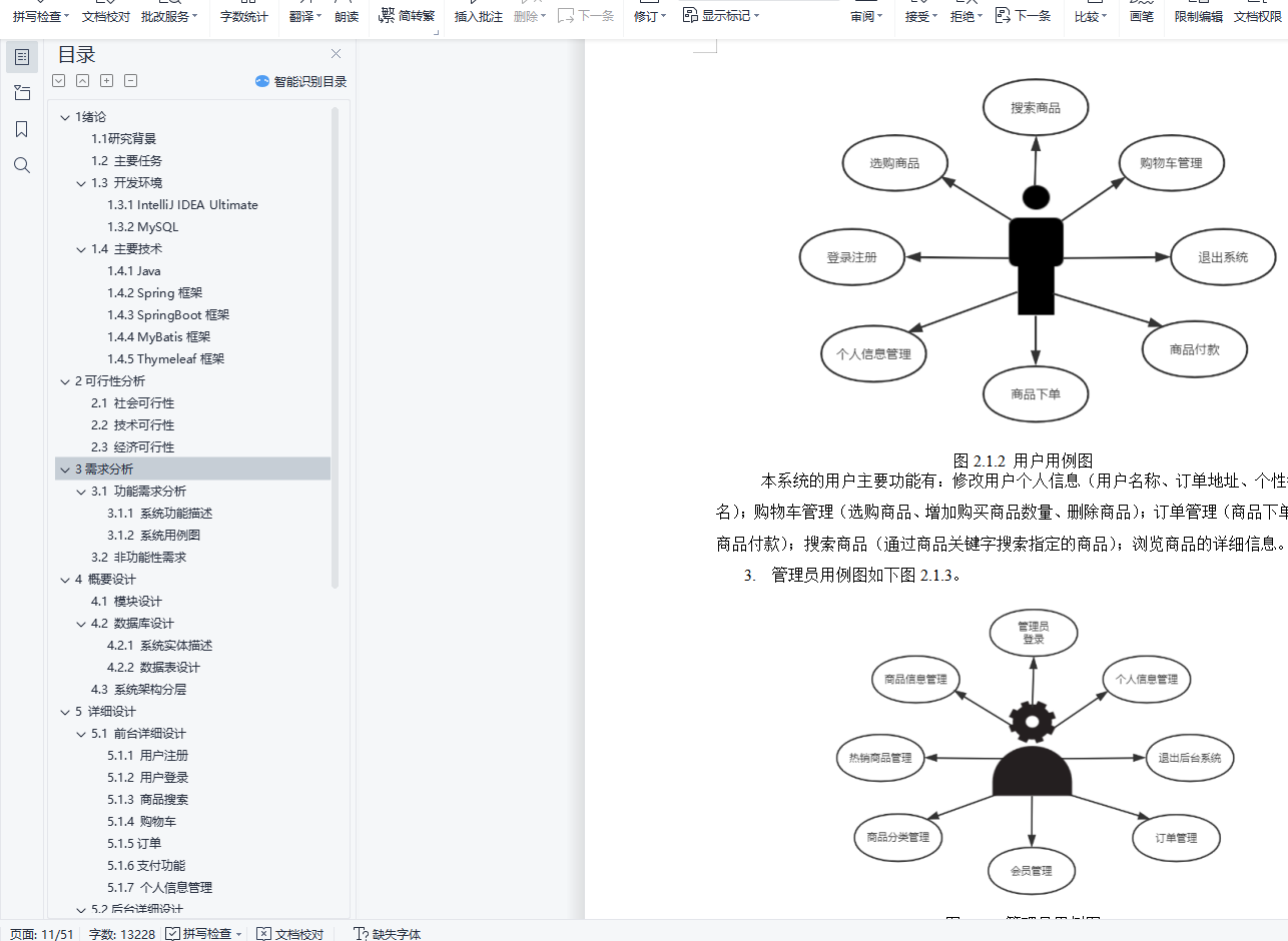 摘 要如今的时代可以被称为“互联网时代”,在互联网+这种社会新形态的背景下各种线上商品经济蓬勃发展。在线购物成为人们购物方式的主流。而如何构建一个高并发、高可用、分布式的在线购物系统成为此次设计开发的初衷。本购物平台融合Spring系列框架、MyBatis、MySQL和Maven项目构建工具等在JDK12的基础上构建而成。按照B2C网站构建原则,该在线购物平台主要分为两个部分,用户操作部分和后台管理部分。在前台用户的操作主要是,用户注册或登录、商品浏览、搜索商品、购物车的添加和查看、订单的结算和支付、网站本身信息的展示等等;在后台管理员管理的操作主要是,商品信息管理、轮播图配置、热销商品配置、分类管理、商品管理、会员管理、订单管理、系统管理、系统监控界面显示等等。本系统通过人性化的界面布局将给网站消费者良好的购物体验,用户可以根据需求搜索相关产品,用户可以利用商品比较功能择优购买,用户可以在商品购买之后加入该商品的讨论论坛分享购买体验等等。通过各种系统优化手段使本系统对于用户而言更友好对于后续开发更易于扩展。关键词:电子商务;购物系统;Spring Boot;MySQLAbstractToday ’s era can be called the “Internet era.” In the context of the Internet + this new social form, various online commodity economies are booming. Online shopping has become the mainstream of people's shopping methods. How to build a highly concurrent, highly available, distributed online shopping system has become the original intention of this design and development.This shopping platform is built on the basis of JDK12 by integrating Spring series frameworks, MyBatis, MySQL and Maven project building tools. According to the principles of B2C website construction, the online shopping platform is mainly divided into two parts, user operation part and background management part. The operations of users at the front desk are mainly user registration or login, product browsing, searching for products, adding and viewing of shopping carts, settlement and payment of orders, display of information on the website itself, etc. The operations managed by the administrator in the background are mainly, Commodity information management, carousel map configuration, hot commodity configuration, classification management, commodity management, member management, order management, system management, system monitoring interface display, etc. This system will give website consumers a good shopping experience through a user-friendly interface layout. Users can search for related products according to their needs. Users can use the product comparison function to choose the best purchase. Users can join the product discussion forum to share the purchase experience after the product is purchased and many more. Through various system optimization methods, the system is more friendly to users and easier to expand for subsequent development.Key Words:E-commerce;Shopping System;Spring Boot;MySQL目 录1 绪论 71.1 研究背景 71.2 主要任务 71.3 开发环境 81.3.1 IntelliJ IDEA Ultimate 81.3.2 MySQL 81.4 主要技术 81.4.1 Java 81.4.2 Spring框架 81.4.3 SpringBoot框架 81.4.4 MyBatis框架 81.4.5 Thymeleaf框架 92可行性分析 102.1 社会可行性 102.2 技术可行性 102.3 经济可行性 103需求分析 113.1 功能需求分析 113.1.1 系统功能描述 113.1.2 系统用例图 123.2 非功能性需求 144 概要设计 154.1 模块设计 154.2 数据库设计 164.2.1 系统实体描述 164.2.2 数据表设计 194.3 系统架构分层 265 详细设计 275.1 前台详细设计 275.1.1 用户注册 275.1.2 用户登录 285.1.3 商品搜索 305.1.4 购物车 315.1.5订单 315.1.6支付功能 325.1.7 个人信息管理 345.2后台详细设计 355.2.1 后台管理系统主页面销售情况以及商品统计图 355.2.2 轮播图管理 365.2.3 热销商品管理 375.2.4 商品分类管理 385.2.5 商品管理 395.2.6 会员管理 405.2.7 订单管理 405.2.8 系统管理 415.2.9 管理员登录 426 系统测试与运行 446.1 系统测试 446.1.1 用户登录表单信息反馈功能测试 446.1.2 用户注册功能测试 456.1.3 添加购物车功能测试 456.1.4 订单功能 466.1.5 商品搜索功能 466.1.6 会员管理禁用用户功能 476.1.6 添加商品功能 477 总结与展望 487.1 总结 487.2 展望 48致 谢 49参考文献 50