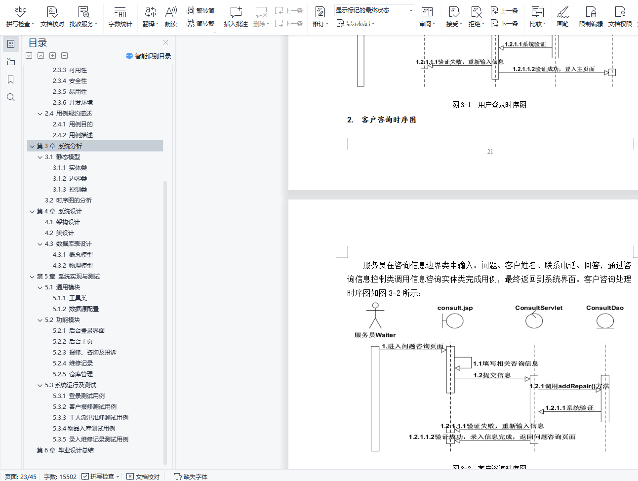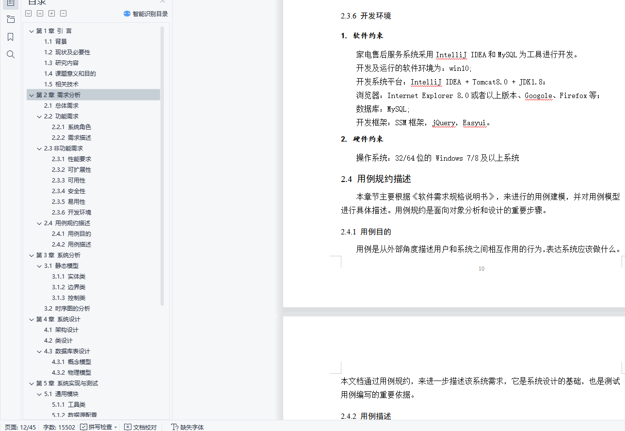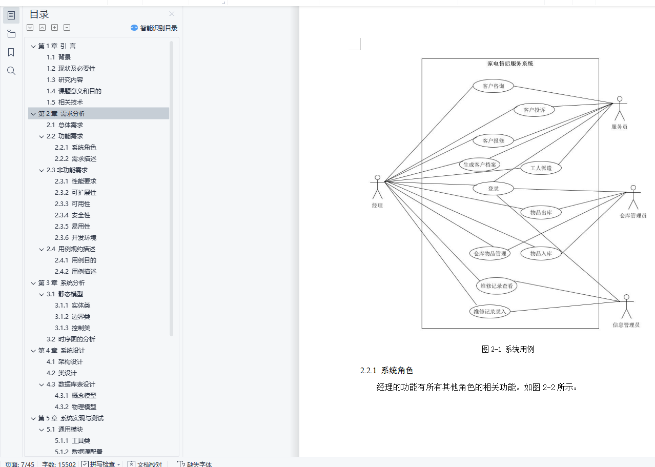 目 录第1章 引 言 11.1 背景 11.2 现状及必要性 11.3 研究内容 11.4 课题意义和目的 21.5 相关技术 2第2章 需求分析 42.1 总体需求 42.2 功能需求 42.2.1 系统角色 52.2.2 需求描述 72.3非功能需求 92.3.1 性能要求 92.3.2 可扩展性 92.3.3 可用性 92.3.4 安全性 102.3.5 易用性 102.3.6 开发环境 102.4 用例规约描述 102.4.1 用例目的 102.4.2 用例描述 11第3章 系统分析 183.1 静态模型 183.1.1 实体类 183.1.2 边界类 193.1.3 控制类 203.2 时序图的分析 21第4章 系统设计 264.1 架构设计 264.2 类设计 264.3 数据库表设计 284.3.1 概念模型 284.3.2 物理模型 32第5章 系统实现与测试 355.1 通用模块 355.1.1 工具类 355.1.2 数据源配置 365.2 功能模块 365.2.1 后台登录界面 365.2.2 后台主页 375.2.3 报修、咨询及投诉 385.2.4 维修记录 385.2.5 仓库管理 385.3系统运行及测试 395.3.1 登录测试用例 395.3.2 客户报修测试用例 405.3.3 工人派出维修测试用例 405.3.4物品入库测试用例 415.3.5 录入维修记录测试用例 42第6章 实训总结 43