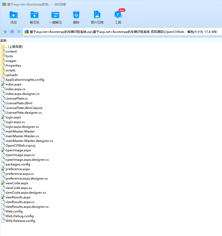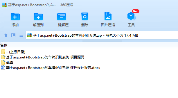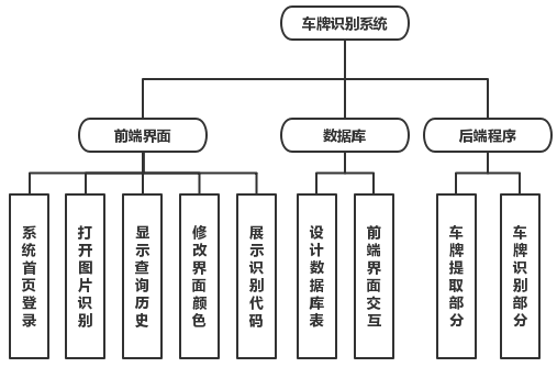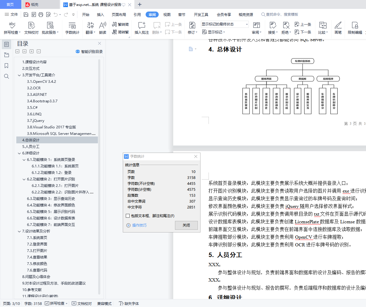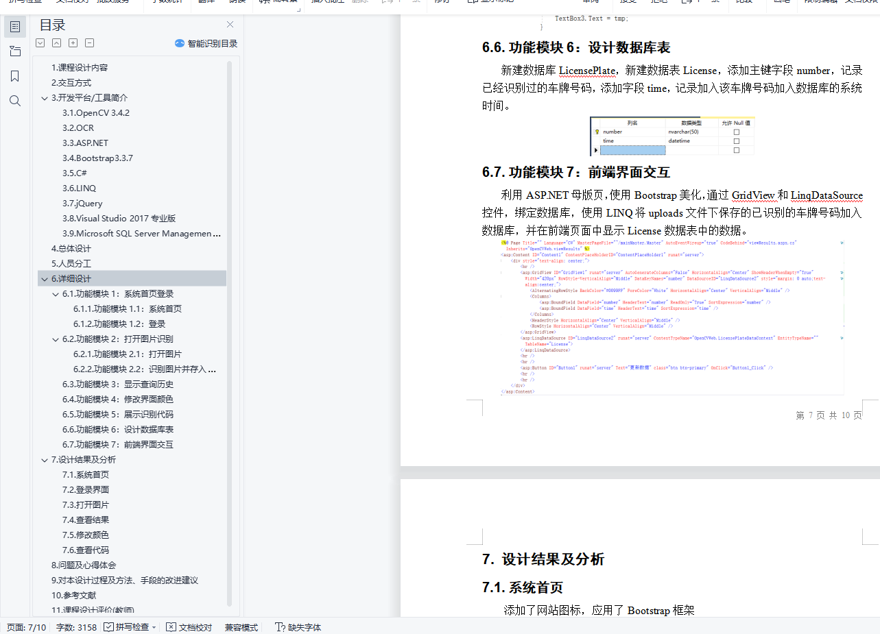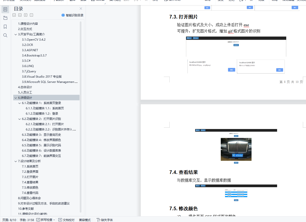 目 录1. 课程设计内容 32. 交互方式 33. 开发平台/工具简介 34. 总体设计 45. 人员分工 56. 详细设计 56.1. 功能模块1:系统首页登录 56.1.1. 功能模块1.1:系统首页 56.1.2. 功能模块1.2:登录 56.2. 功能模块2:打开图片识别 66.2.1. 功能模块2.1:打开图片 66.2.2. 功能模块2.2:识别图片并存入数据库 66.3. 功能模块3:显示查询历史 76.4. 功能模块4:修改界面颜色 76.5. 功能模块5:展示识别代码 76.6. 功能模块6:设计数据库表 86.7. 功能模块7:前端界面交互 87. 设计结果及分析 97.1. 系统首页 97.2. 登录界面 97.3. 打开图片 97.4. 查看结果 107.5. 修改颜色 107.6. 查看代码 108. 问题及心得体会 109. 对本设计过程及方法、手段的改进建议 1110. 参考文献 1111. 课程设计评价(教师) 11车牌识别系统1.课程设计内容车牌识别系统(License Plate Recognition)利用OpenCV实现车牌的提取,使用Tesseract-OCR识别车牌字符,基于ASP.NET和Bootstrap3.3.7编写了一个简单的系统操作界面。2.交互方式打开OpenCV_Web目录,双击OpenCVWeb.sln文件,在Google Chrome运行项目,点击“Start now”进入登录界面,username由用户自定义,password默认为“123456”,登录后主界面左上角设置了菜单栏。点击Menu菜单下的Open Image,打开一张格式为.jpg、.png或者.jpeg且大小在200KB以下的带车牌的图片,显示图片后点击“识别车牌”,运行OpenCV.exe文件,进行车牌识别,并记录在数据库LicensePlate中。点击Menu菜单下的View Results,点击“显示数据”,从后台数据库LicensePlate获取已识别的车牌号码及识别的系统时间,在表格中显示数据。点击Menu菜单下的Exit System,回到登录界面。点击Setting菜单下的Preference,选择提供的颜色,修改标题栏或按钮颜色。点击Setting菜单下的View Code,点击“查看main.cpp”或者“查看template.cpp”,在文本框中显示本系统的C++源码。