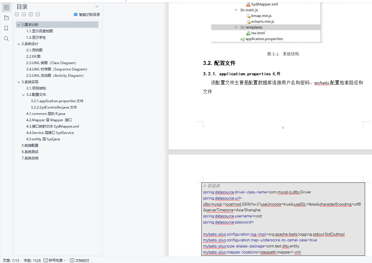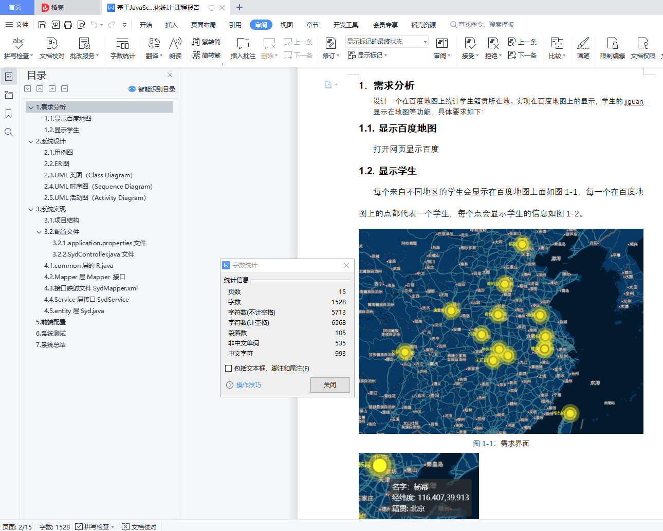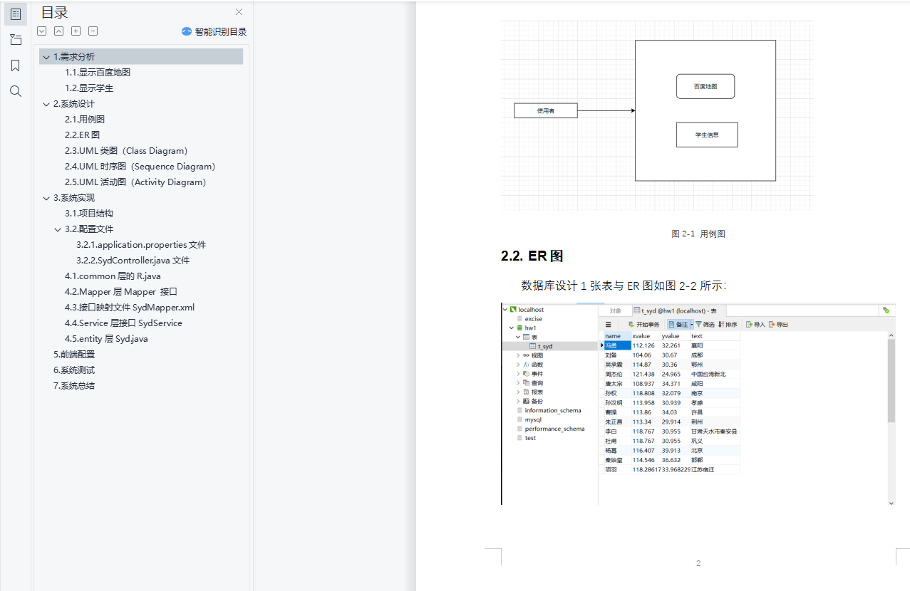 目 录1. 需求分析 11.1. 显示百度地图 11.2. 显示学生 12. 系统设计 22.1. 用例图 22.2. ER图 22.3. UML类图(Class Diagram) 32.4. UML活动图(Activity Diagram) 33. 系统实现 43.1. 项目结构 43.2. 配置文件 53.2.1. application.properties文件 53.2.2. SydController.java文件 64.1. common的R.java 74.2. Mapper层Mapper 84.3. 接口映射文件SydMapper.xml 94.4. Service层接口SydService.java 94.5. entity层Syd.java 105. 系统测试 106. 系统总结 121.需求分析设计一个在百度地图上统计学生籍贯所在地。实现在百度地图上的显示,学生的jiguan 显示在地图等功能,具体要求如下:1.1.显示百度地图打开网页显示百度1.2.显示学生每个来自不同地区的学生会显示在百度地图上面如图1-1,每一个在百度地图上的点都代表一个学生,每个点会显示学生的信息如图1-2。