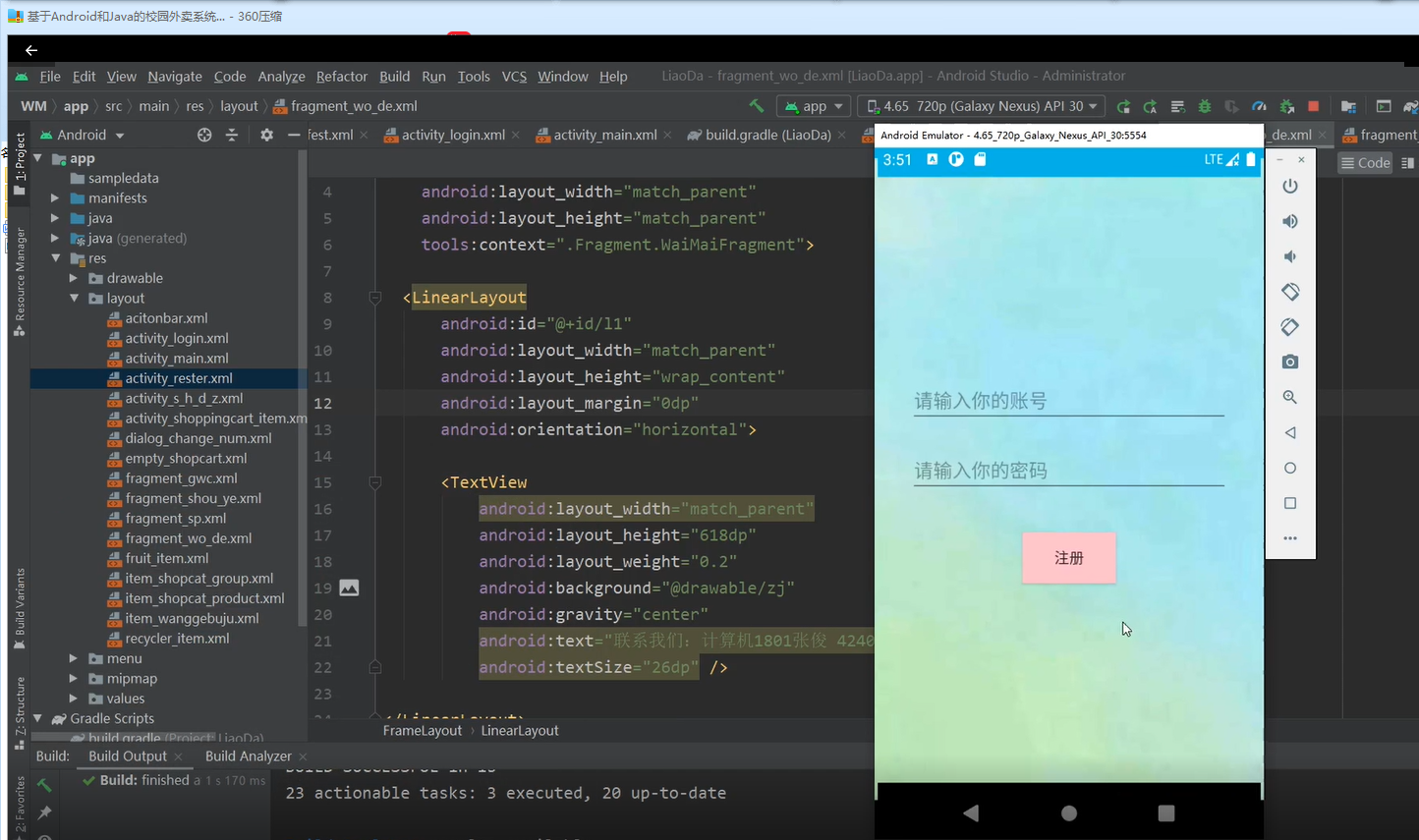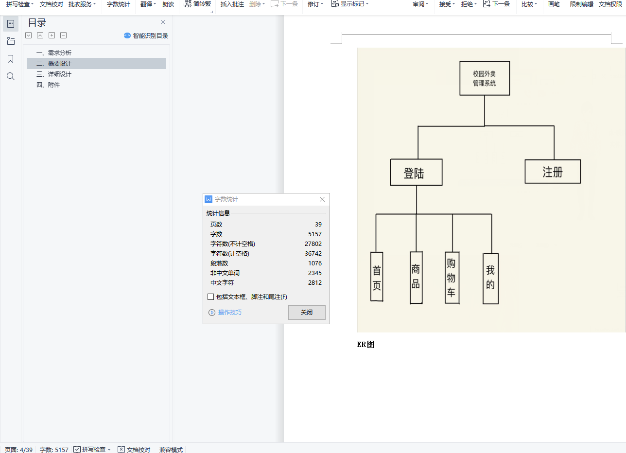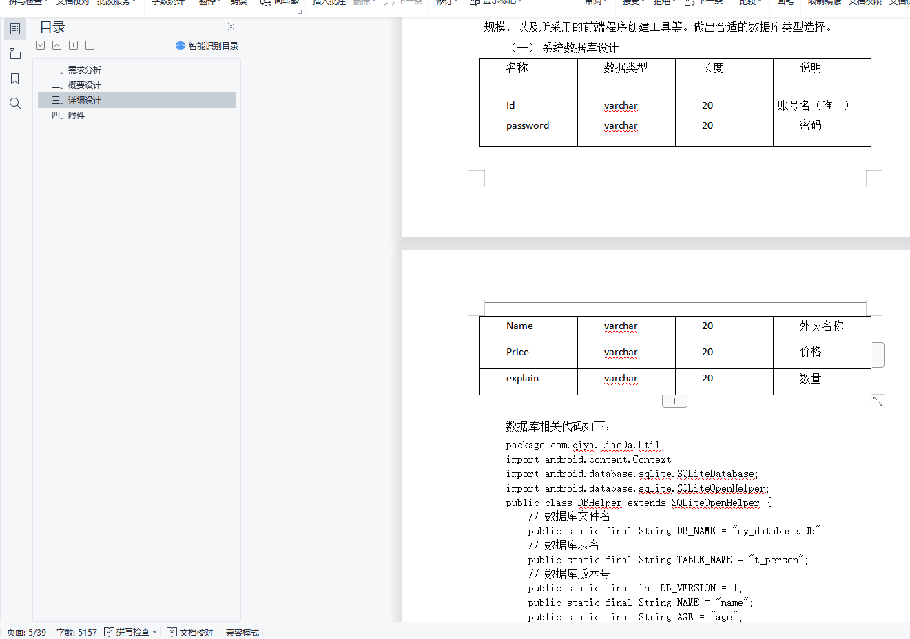 目录一、 需求分析 1二、 概要设计(功能模块图,ER图,表结构) 3三、详细设计(主要模块的代码和截图) 5(一)登陆界面 9(二)注册界面 12(三)首页 15(四)轮换图 18(五)商品界面 21(六)购物车 12(七)我的 13四、附件 13一、需求分析随着5G时代的到来,手机应用越来越普遍,加之国民手机持有量更是爆炸式增长。为了方便Android手机用户能随时随地点到自己喜欢的菜品,尤其是沈阳科技学院的学生,我提出一种操作简便,功能齐全,占用资源少,能为用户节约流量的校园外卖管理系统,于是提出本系统的主要功能。伴随着我国市场经济的高度发展,企业越来越依赖于市场和客户,这种依赖关系已经开始逐步提升到关乎企业生存的高度。如何获得更多客流量,如何通过小的代价而使商家获得更大的知名度,这是使企业得以生存、发展、壮大的关键。年销售过亿的众多电子商务案例让人们看到了更多的商机。与应用场景相当有限的PC(个人电脑)相比,生而具备便携属性的手机给了电商们更大的想象空间。移动电子商务由此产生了。移动电子商务就是利用手机、PDA及掌上电脑等无线终端进行的B2B、B2C或C2C的电子商务。它将因特网、移动通信技术、短距离通信技术及其它信息处理技术完美的结合,使人们可以在任何时间、任何地点进行各种商贸活动,实现随时随地、线上线下的购物与交易、在线电子支付以及各种交易活动、商务活动、金融活动和相关的综合服务活动等。而Android操作系统凭借着自己开放的平台允许任何移动终端厂商加入到Android联盟中,从而使得越来越多的用户倾向于选择操作系统为Android的手机品牌。选择设计基于Android平台的软件,毫无疑问能覆盖更多的群众, 餐饮业在电子商务中还处于形成的初期,传统的餐饮业中,大都是以实际门面形式来进行宣传和交流。作为网络普及化的社会,这还缺少了一些更为现代化的元素。餐饮业是一个个性化、多样化的服务业,而电子商务则最能体现个性化、多样化服务的方式。而且现在大部分电子商务都体现为向大企业服务,结合餐饮这个行业的特点,最终还发展为同小区小店服务的模式。以最贴切的方式,最灵便的服务进入个个网络社区,进入人们的生活。1.2课设目的本项目是一款基于Android手机平台的校园外卖管理系统,使拥有Android手机的用户生活更加方便快捷,使得手机显得更生动灵活化,与人们更为接近,让手机主人随时随地都能吃到自己喜欢的外卖。使人们的生活更加多样化。也使设计者更加熟练Android的技术和其他在市场上的特点。需求界面如下:1、登陆、注册界面2、显示菜品界面3、购物车界面4、购物车界面4、个人信息界面
