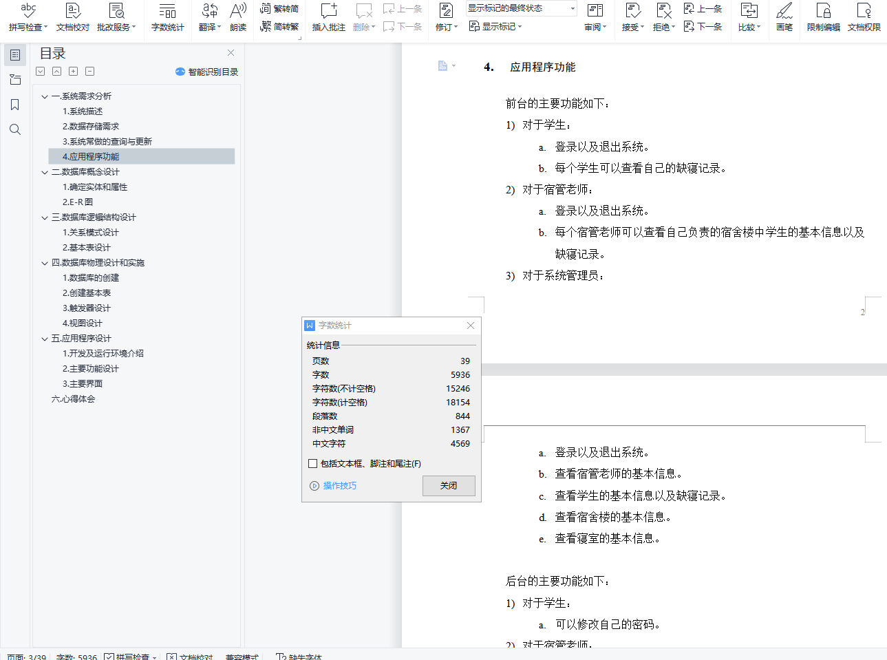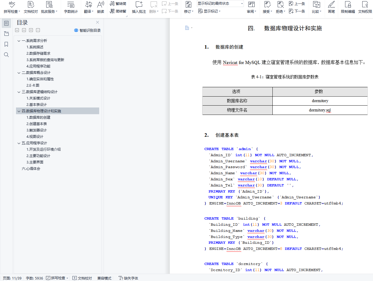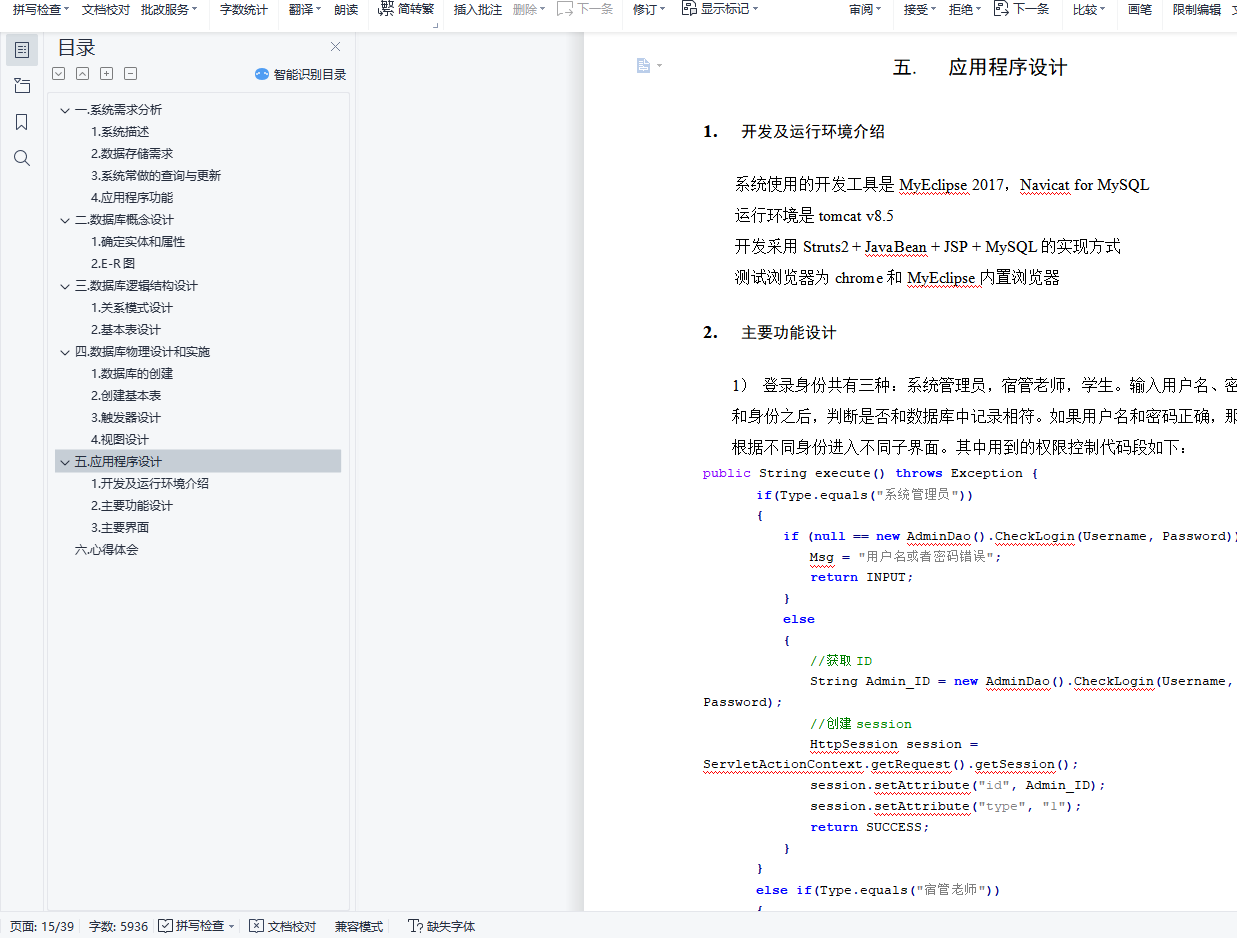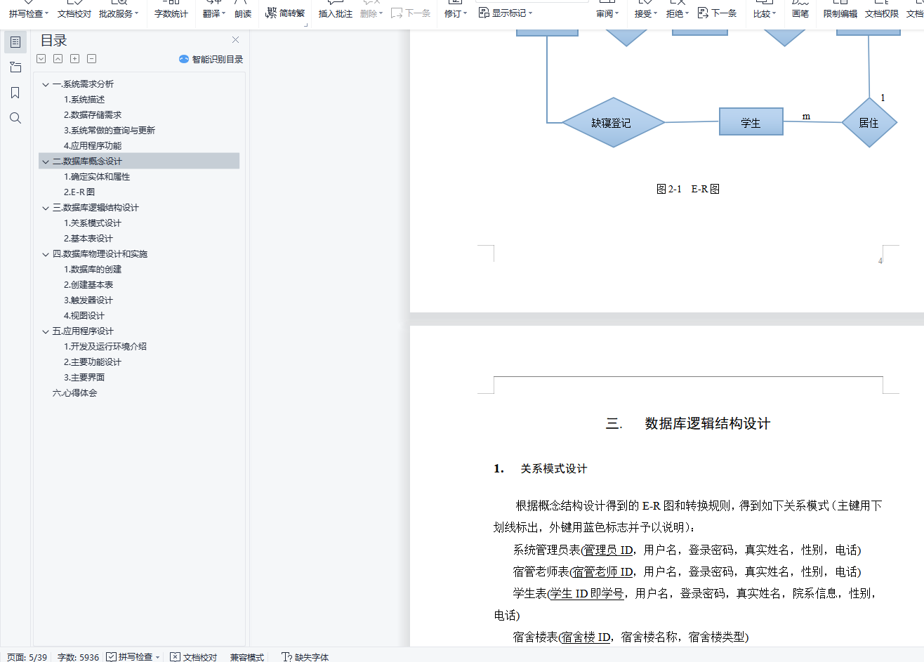 目 录一. 系统需求分析 11. 系统描述 12. 数据存储需求 13. 系统常做的查询与更新 24. 应用程序功能 2二. 数据库概念设计 41. 确定实体和属性 42. E-R图 4三. 数据库逻辑结构设计 51. 关系模式设计 52. 基本表设计 5四. 数据库物理设计和实施 101. 数据库的创建 102. 创建基本表 103. 触发器设计 134. 视图设计 13五. 应用程序设计 141. 开发及运行环境介绍 142. 主要功能设计 143. 主要界面 20六. 心得体会 38一.系统需求分析1.系统描述随着社会的发展以及教育水平的提高,当今社会在校生的数量越来越庞大,使用传统的方式对学生的信息进行管理效率非常低下。在互联网技术高度发达的今天,使用数据库技术对学生的住宿信息进行管理能够使学校对学生信息的管理更加的高效,检索迅速,查找方便,可靠性高,存储量大。此外,使用数据库技术可以使得学生信息出错的可能性大大降低,还可以使学生住宿信息长时间稳定地保存,不易丢失。可见,开发出这样的一个数据库具有很强的显示意义。2.数据存储需求宿舍管理系统数据库需要存储如下信息:系统管理员的用户名,密码,真实姓名,性别,电话;宿管老师的的用户名,密码,真实姓名,性别,电话;学生的学号,用户名,密码,真实姓名,院系信息,性别,电话;宿舍楼的名称,类型;寝室的名称,大小,现居人数;学生缺寝的日期,原因,登记老师是谁;学生的当前状态(入住还是迁出),以及相应的登记时间。各种数据之间的关系:寝室与学生是一对多的关系,一个寝室下可有多名学生;宿舍楼与寝室是一对多的关系,一栋宿舍楼下可有多个寝室;宿管老师与宿舍楼是多对多的关系,一个宿管老师可以负责多个宿舍楼,一个宿舍楼也可以由多个宿管老师负责;宿管老师与学生是多对多的关系,一个宿管老师可以负责多个学生的缺寝情况,一个学生也可以由多个宿管老师负责登记缺寝信息;系统管理员可以获取所有的数据信息,拥有最高的权限。
