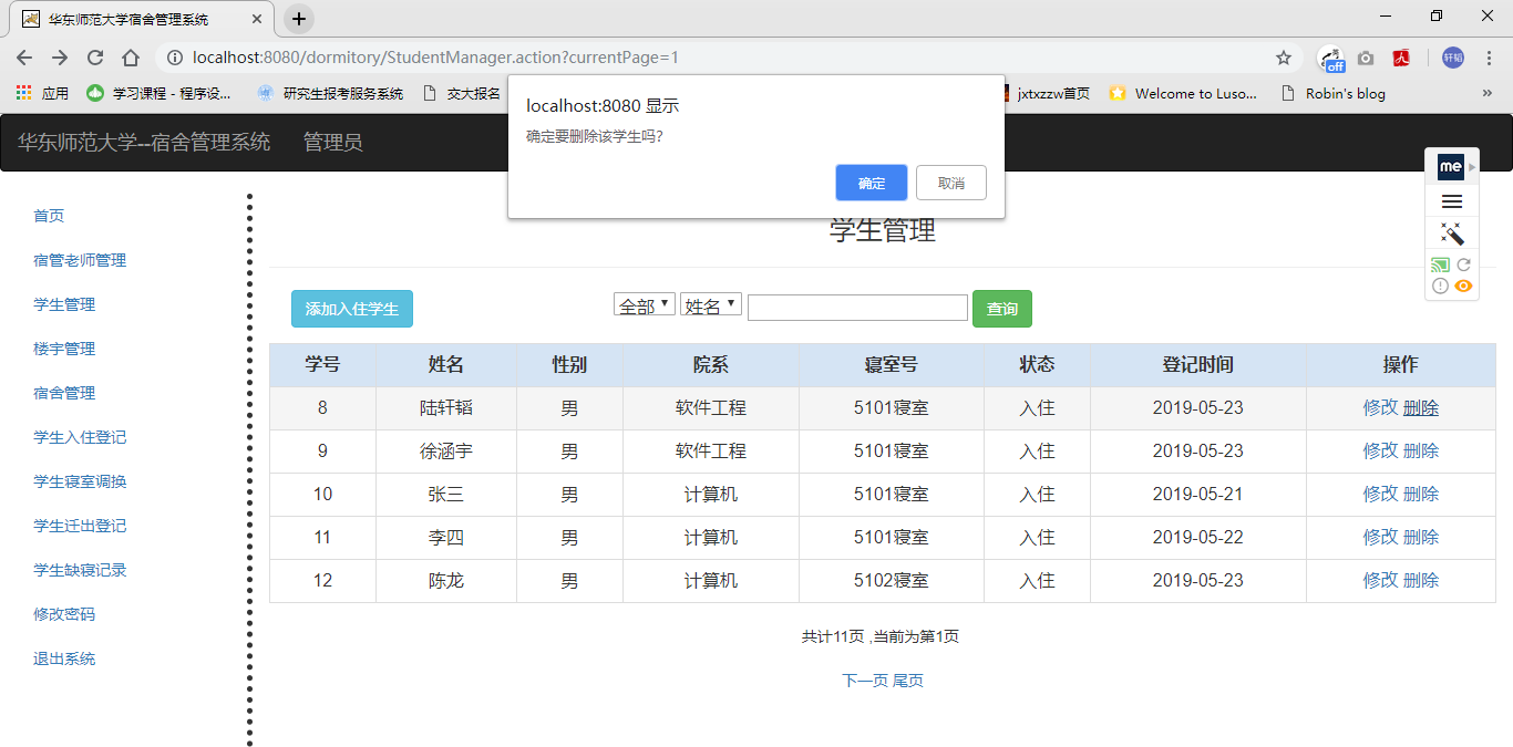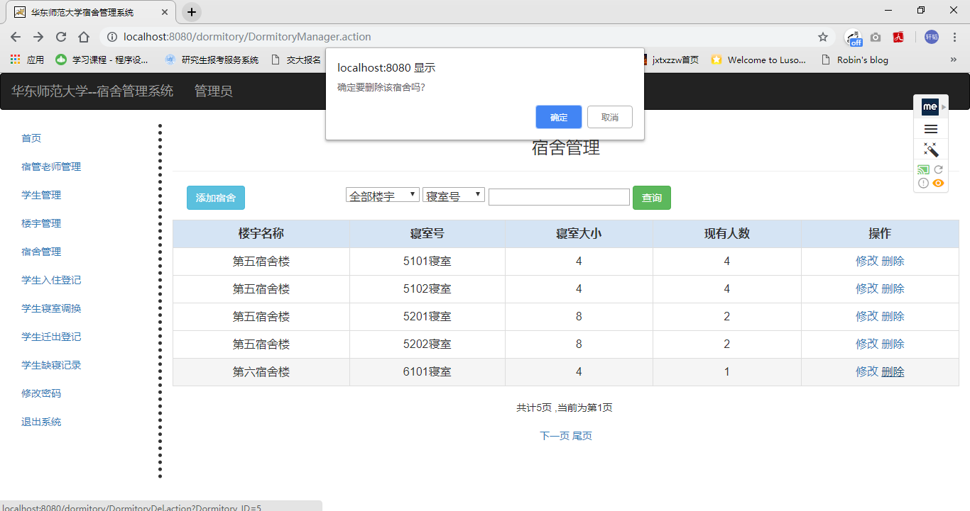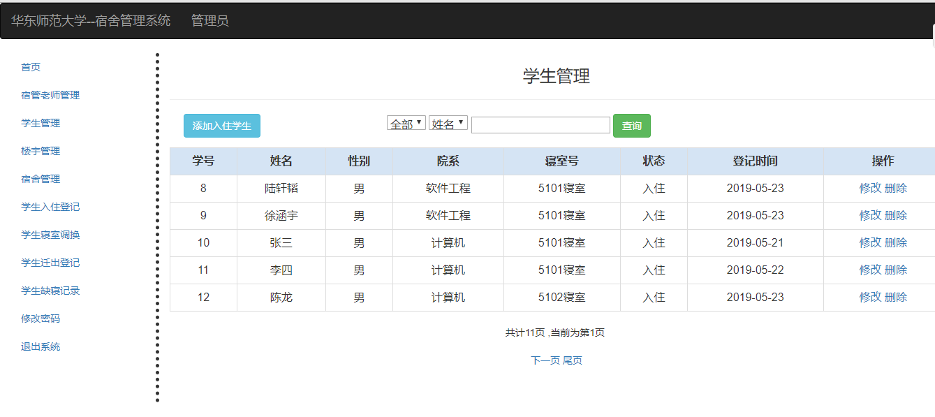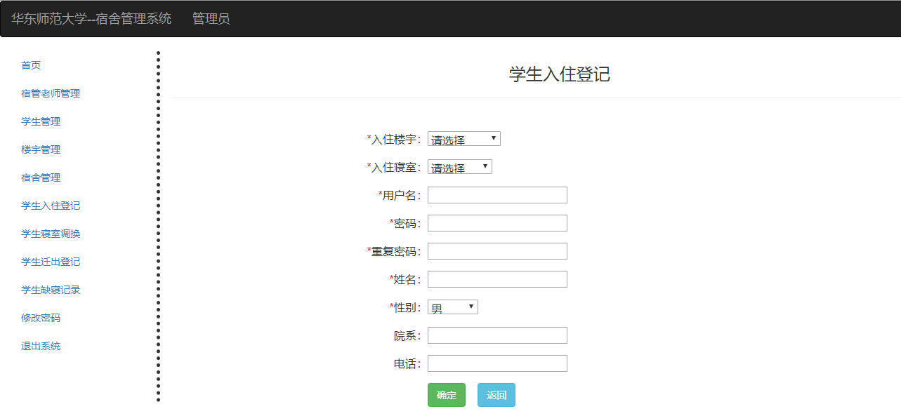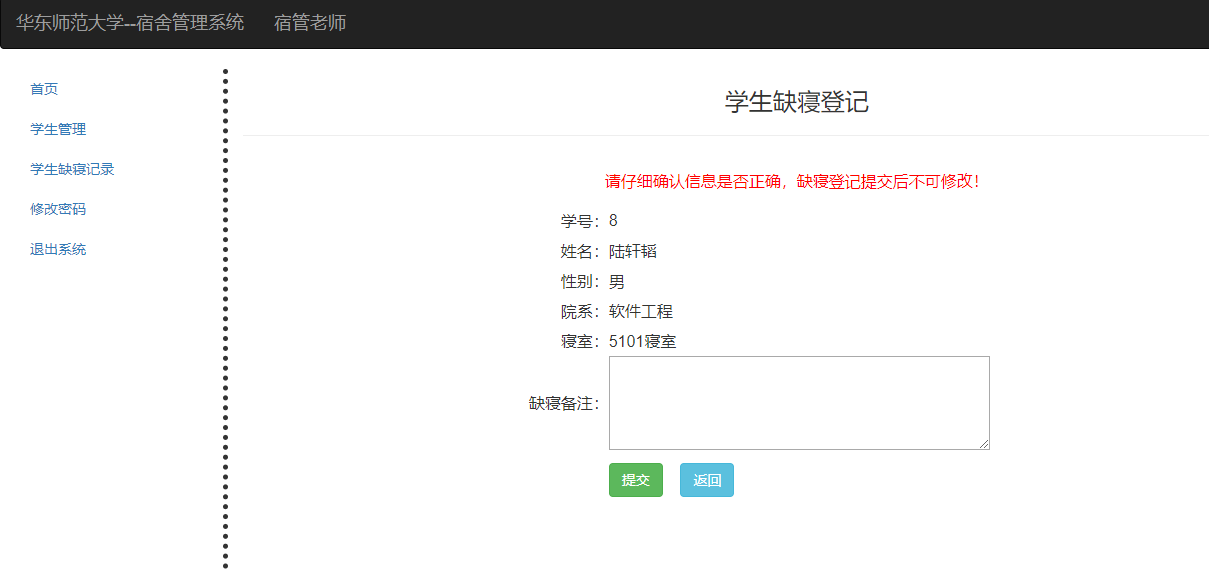目 录一. 系统需求分析 11. 系统描述 12. 数据存储需求 13. 系统常做的查询与更新 24. 应用程序功能 2二. 数据库概念设计 41. 确定实体和属性 42. E-R图 4三. 数据库逻辑结构设计 51. 关系模式设计 52. 基本表设计 5四. 数据库物理设计和实施 101. 数据库的创建 102. 创建基本表 103. 触发器设计 134. 视图设计 13五. 应用程序设计 141. 开发及运行环境介绍 142. 主要功能设计 143. 主要界面 20六. 心得体会 38一.系统需求分析1.系统描述随着社会的发展以及教育水平的提高,当今社会在校生的数量越来越庞大,使用传统的方式对学生的信息进行管理效率非常低下。在互联网技术高度发达的今天,使用数据库技术对学生的住宿信息进行管理能够使学校对学生信息的管理更加的高效,检索迅速,查找方便,可靠性高,存储量大。此外,使用数据库技术可以使得学生信息出错的可能性大大降低,还可以使学生住宿信息长时间稳定地保存,不易丢失。可见,开发出这样的一个数据库具有很强的显示意义。2.数据存储需求宿舍管理系统数据库需要存储如下信息:系统管理员的用户名,密码,真实姓名,性别,电话;宿管老师的的用户名,密码,真实姓名,性别,电话;学生的学号,用户名,密码,真实姓名,院系信息,性别,电话;宿舍楼的名称,类型;寝室的名称,大小,现居人数;学生缺寝的日期,原因,登记老师是谁;学生的当前状态(入住还是迁出),以及相应的登记时间。各种数据之间的关系:寝室与学生是一对多的关系,一个寝室下可有多名学生;宿舍楼与寝室是一对多的关系,一栋宿舍楼下可有多个寝室;宿管老师与宿舍楼是多对多的关系,一个宿管老师可以负责多个宿舍楼,一个宿舍楼也可以由多个宿管老师负责;宿管老师与学生是多对多的关系,一个宿管老师可以负责多个学生的缺寝情况,一个学生也可以由多个宿管老师负责登记缺寝信息;系统管理员可以获取所有的数据信息,拥有最高的权限。