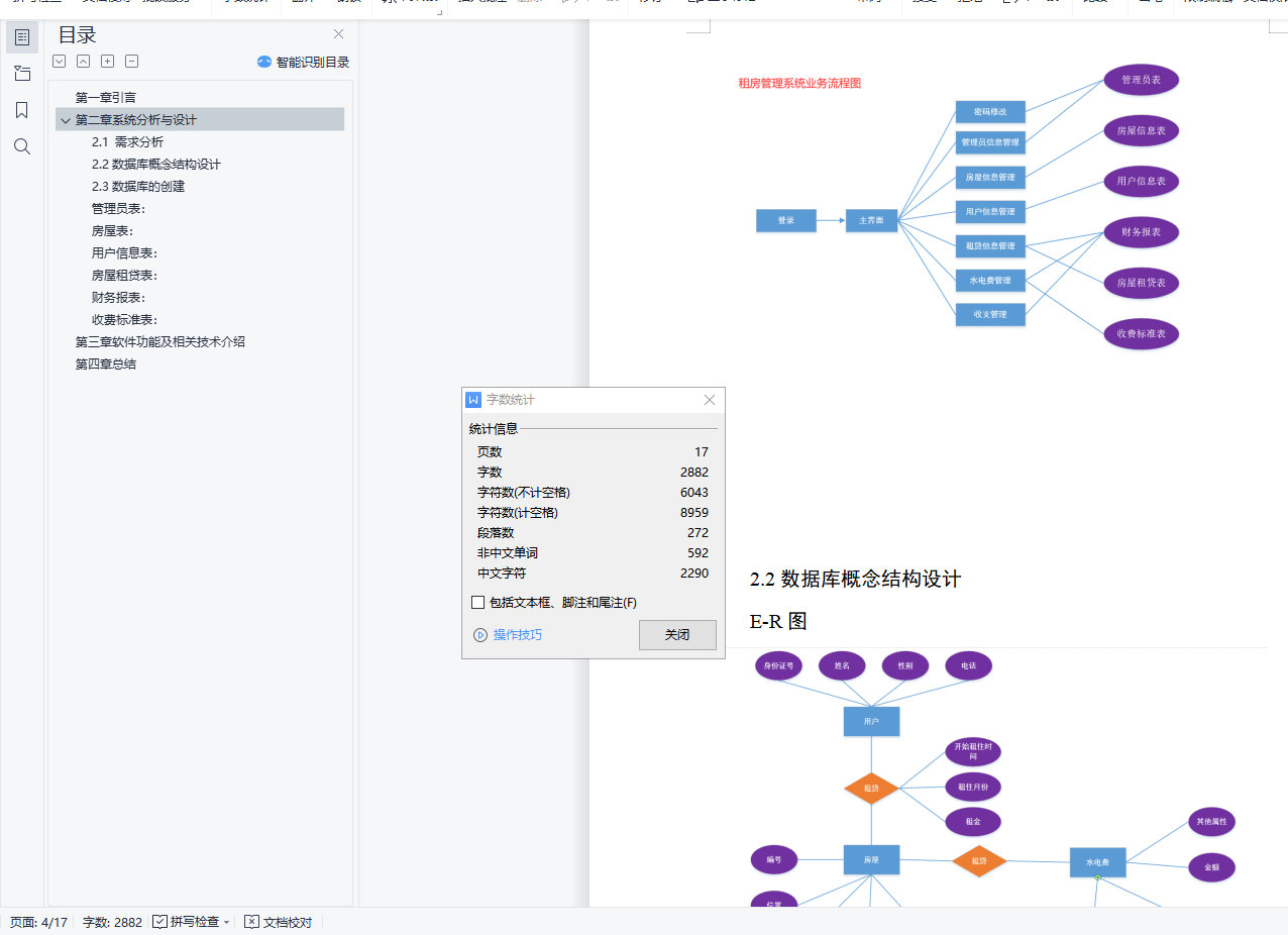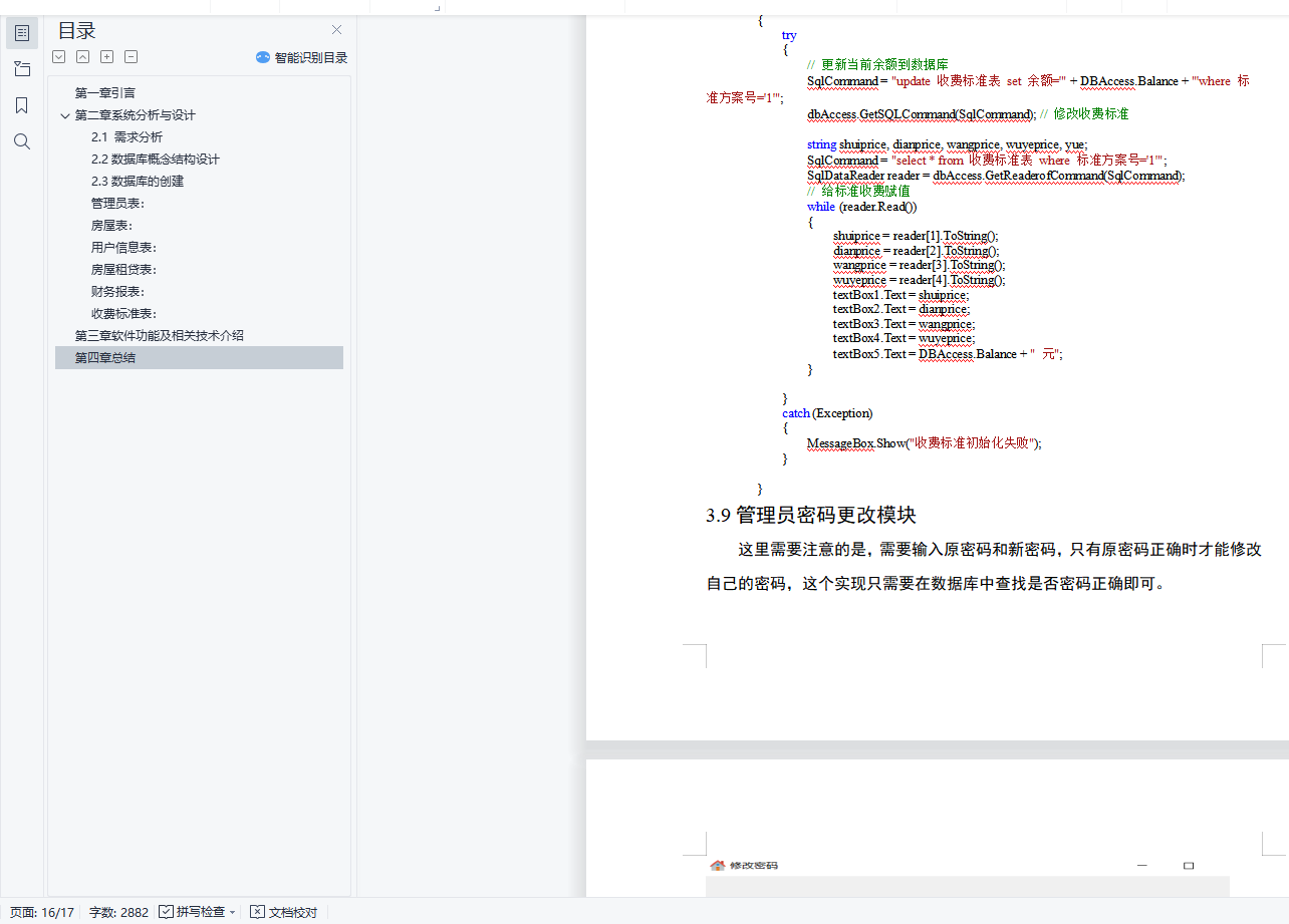 目录第一章 引言 3第二章 系统分析与设计 42.1 需求分析 4设计流程图: 42.2数据库概念结构设计 5E-R图 52.3数据库的创建 6管理员表: 6房屋表: 7用户信息表: 7房屋租贷表: 7财务报表: 7收费标准表: 8第三章 软件功能及相关技术介绍 93.1登录模块 9点击登录按钮事件: 93.2主界面模块 103.3房屋信息管理模块 113.4用户信息管理模块 133.5租贷信息管理模块 143.6水电费信息管理模块 143.7财务收支管理模块 153.7管理员信息管理模块 163.8收费标准设置模块 163.9管理员密码更改模块 17第四章 总结 17