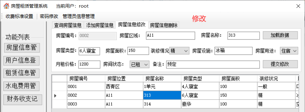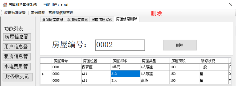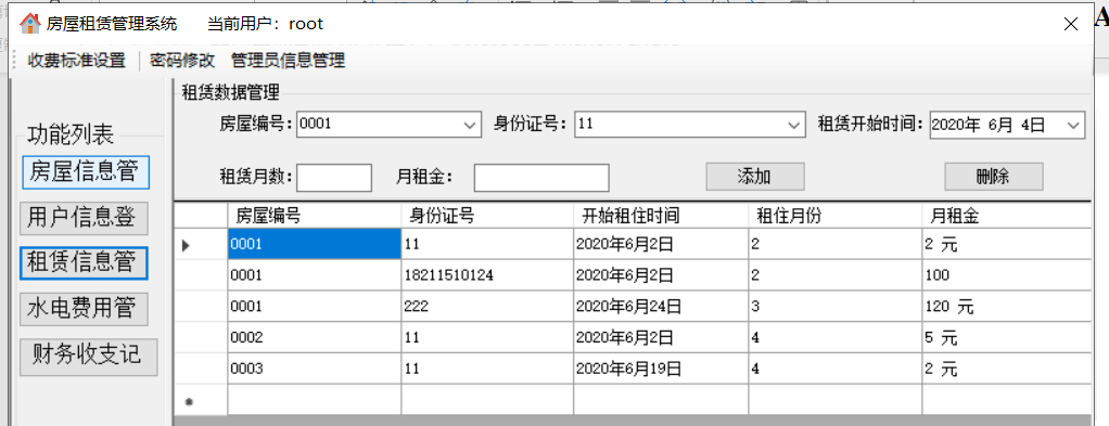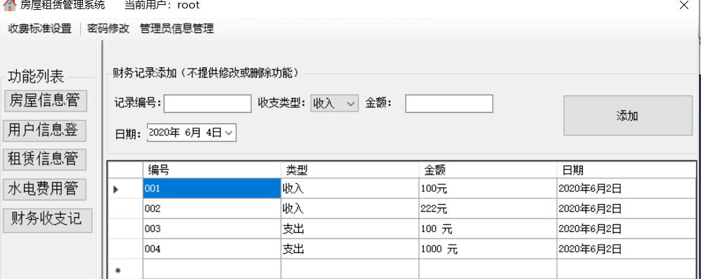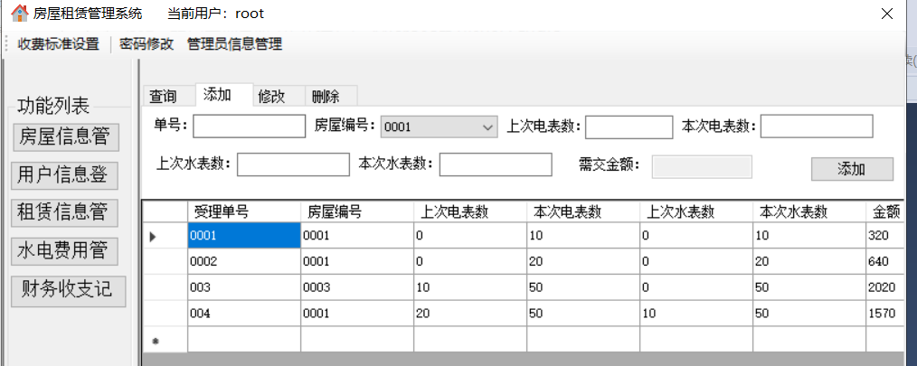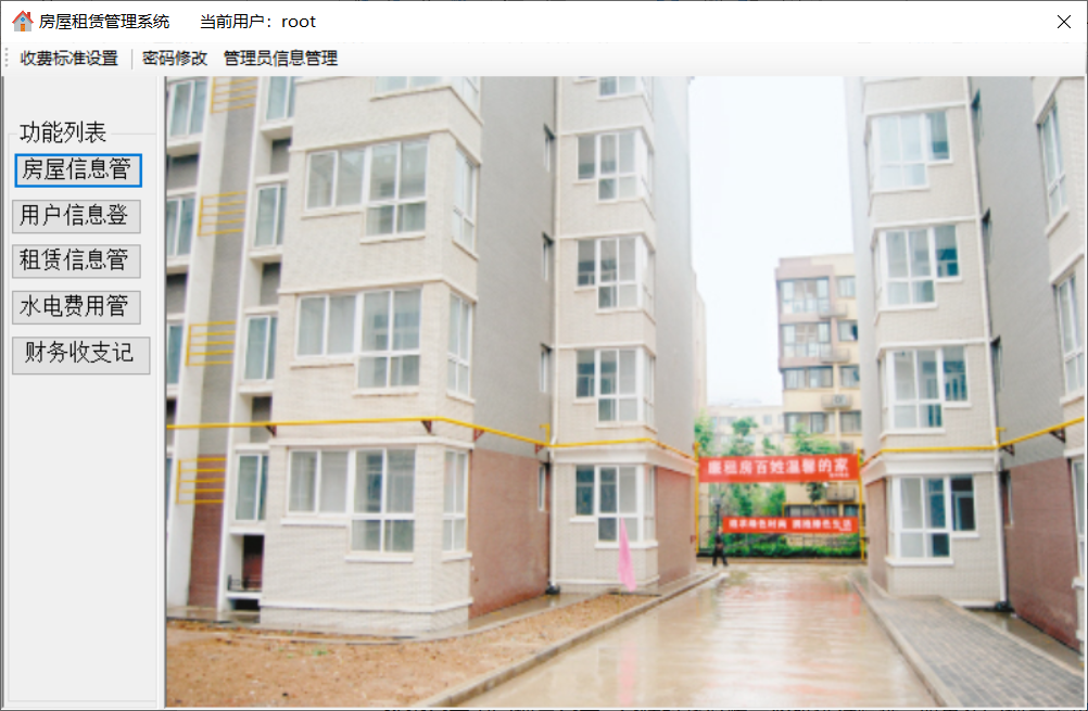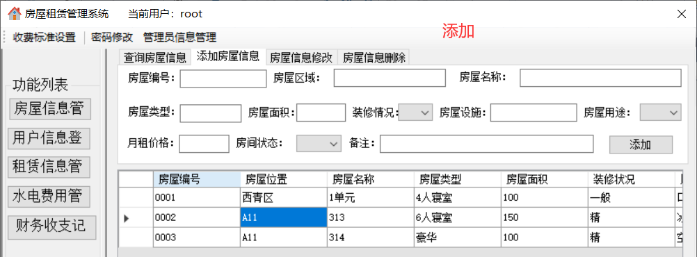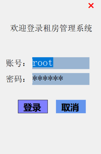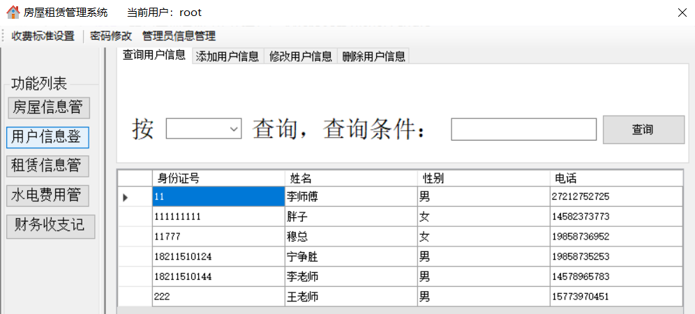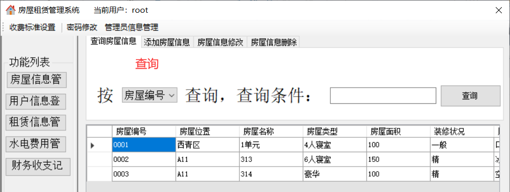 通过对任务的分析,可以发现运行的系统要能实现以下的功能:(1)登录管理:实现以正确的员工号、密码和登录人员身份才能登陆系统的功能,正确登录之后才能进行之后的管理。(2)房屋信息管理:包括添加新的房屋信息、修改房屋信息、查询房屋信息、删除房屋信息。(3)用户信息管理:包括添加新的用户信息、修改用户信息、查询用户信息、删除用户信息。(4)租赁信息管理:包括查询某个房屋的租赁状况、添加租赁关系、删除租赁关系。(5)水电费用管理:包括水电费用的查询、添加、修改、删除。(6)财务收支记录:添加公司的财务记录(不允许修改和删除)。(7)收费项目设置:设置水费、电费、物业费、宽带费单价及财务余额。(8)管理员信息维护/密码修改:若登陆用户为超级管理员(admin),则可以管理其他员工的信息,否则就只有修改自己密码的权限。