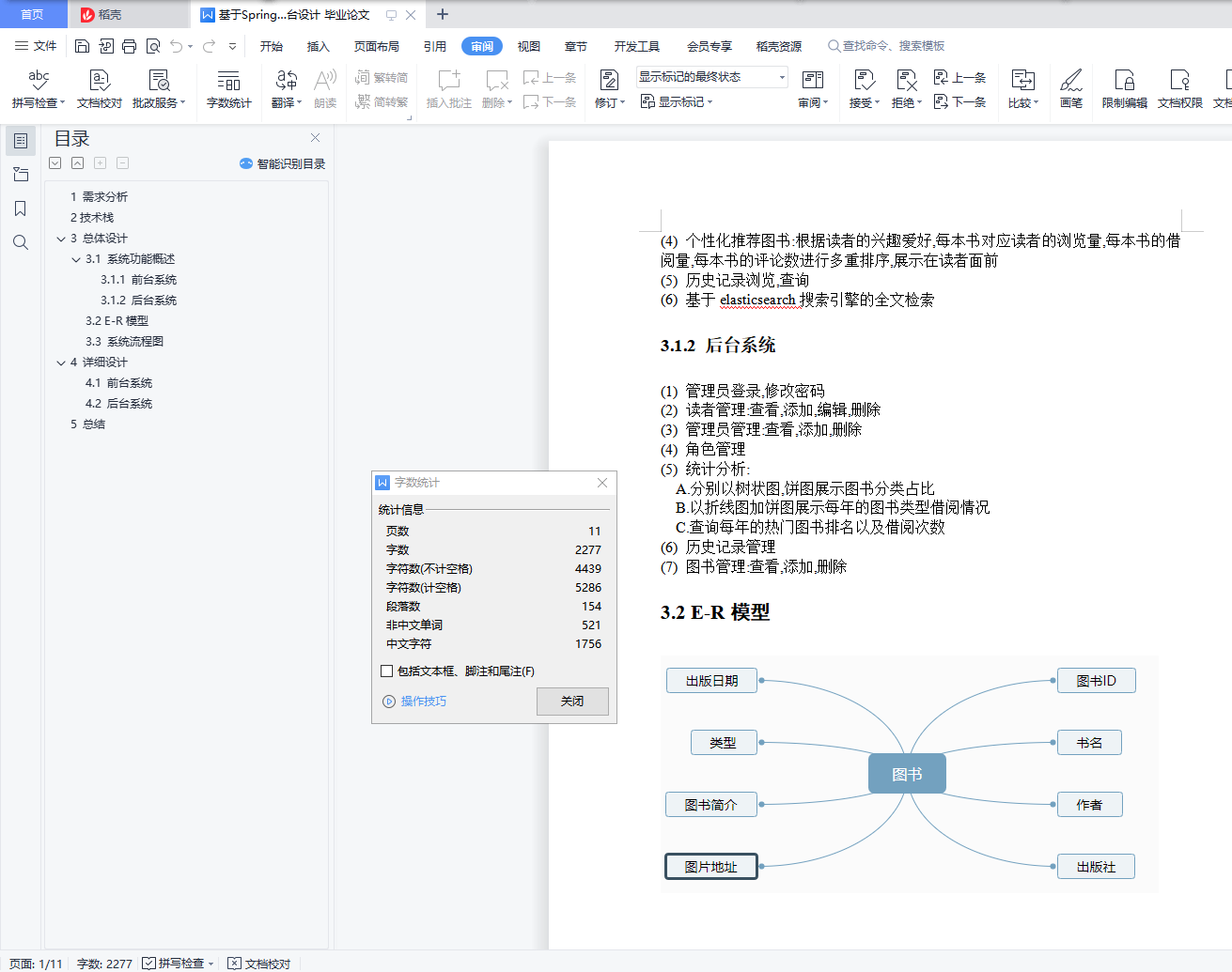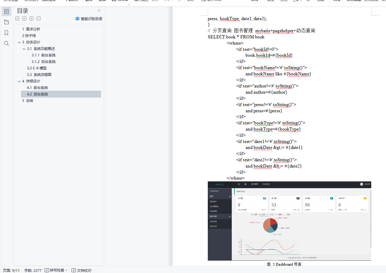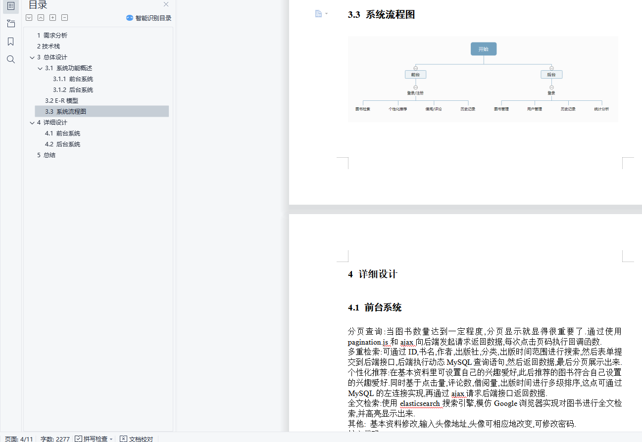 目录1 需求分析 12技术栈 13 总体设计 13.1 系统功能概述 13.1.1 前台系统 13.1.2 后台系统 23.2 E-R模型 23.3 系统流程图 44 详细设计 54.1 前台系统 54.2 后台系统 85 总结 101 需求分析图书借阅管理系统是模拟学校图书馆实现的一个具有前后台的web系统.对于读者,能够提供全文检索,个性化推荐,借阅等功能.对于管理员,能够提供可视化数据分析,信息管理等功能.2技术栈前端: Layui,jQuery,echarts后端:Spring Boot,MyBatis,elasticsearch,thymeleaf(一个模板引擎,代替jsp)开发工具:IDEA,HBuilder,postman,Navicat for MySQL项目管理工具:Maven3 总体设计3.1 系统功能概述3.1.1 前台系统(1) 读者登录,注册,修改密码(2) 基本资料查看,修改(3) 图书查询(复杂查询),仿京东商城以图片卡片形式分页展示,可点击每本书的评价数进行评价,点击卡片查看详细图书信息以及借阅(4) 个性化推荐图书:根据读者的兴趣爱好,每本书对应读者的浏览量,每本书的借阅量,每本书的评论数进行多重排序,展示在读者面前(5) 历史记录浏览,查询(6) 基于elasticsearch搜索引擎的全文检索3.1.2 后台系统(1) 管理员登录,修改密码(2) 读者管理:查看,添加,编辑,删除(3) 管理员管理:查看,添加,删除(4) 角色管理(5) 统计分析:A.分别以树状图,饼图展示图书分类占比B.以折线图加饼图展示每年的图书类型借阅情况C.查询每年的热门图书排名以及借阅次数(6) 历史记录管理(7) 图书管理:查看,添加,删除