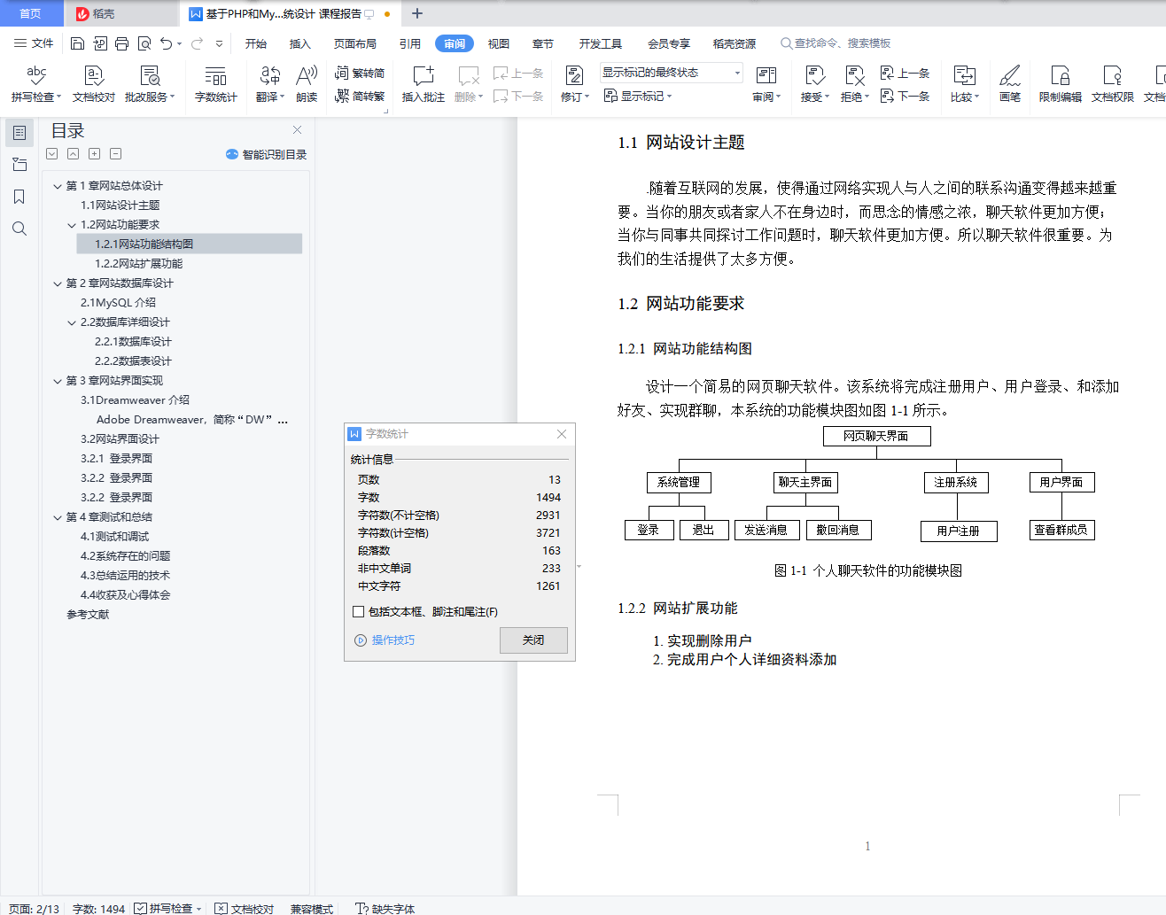 目 录第1章 网站总体设计 21.1 网站设计目标 21.2 网站功能要求 21.2.1 网站功能结构图 21.2.2 网站扩展功能 2第2章 网站数据库设计 32.1 MySQL介绍 32.2 数据库详细设计 32.2.1 数据库设计 32.2.2 数据表设计 3第3章 网站界面实现 43.1 DreamWear介绍 43.2 网站界面设计 43.2.1 登录界面 4第4章 测试和总结 54.1 测试和调试 54.2 系统存在的问题及解决方案 54.3 收获及心得体会 5参考文献 6致谢 7成绩考核(由指导教师填写) 8第1章网站总体设计1.1网站设计主题.随着互联网的发展,使得通过网络实现人与人之间的联系沟通变得越来越重要。当你的朋友或者家人不在身边时,而思念的情感之浓,聊天软件更加方便;当你与同事共同探讨工作问题时,聊天软件更加方便。所以聊天软件很重要。为我们的生活提供了太多方便。1.2网站功能要求1.2.1网站功能结构图设计一个简易的网页聊天软件。该系统将完成注册用户、用户登录、和添加好友、实现群聊,本系统的功能模块图如图1-1所示。