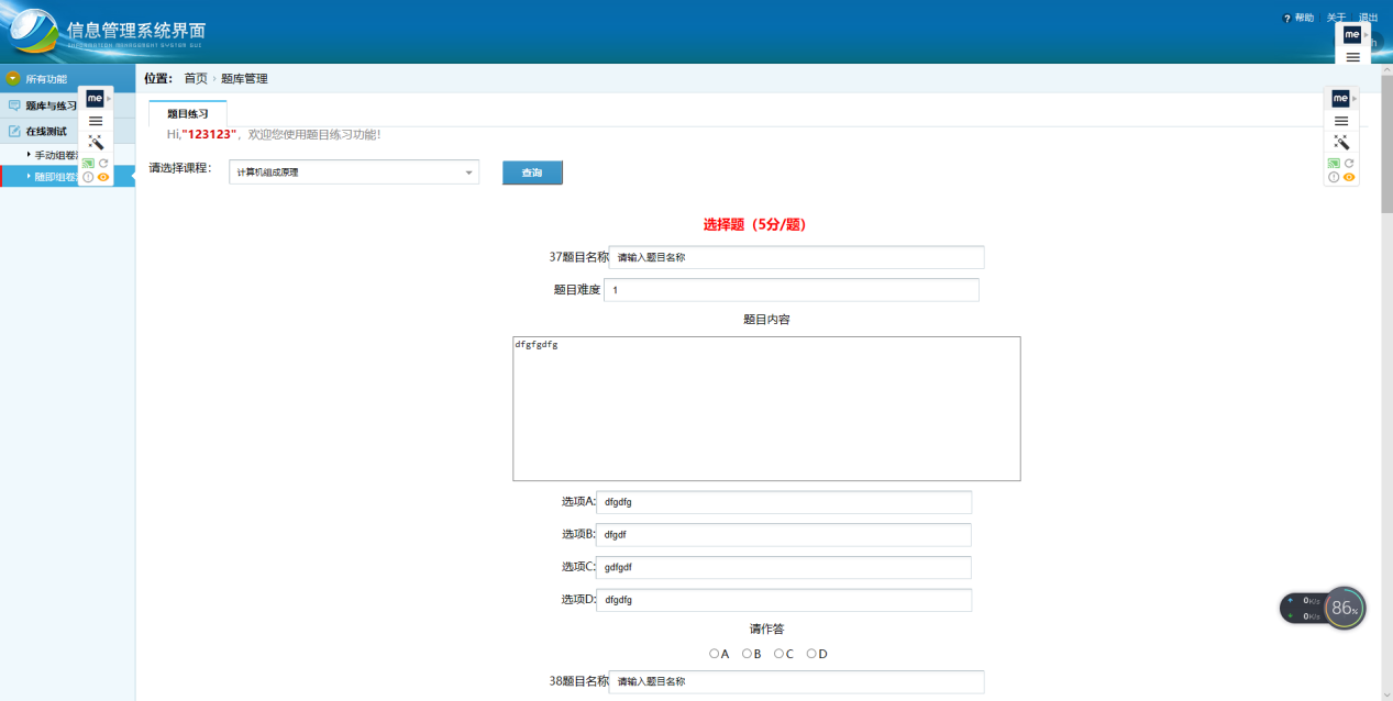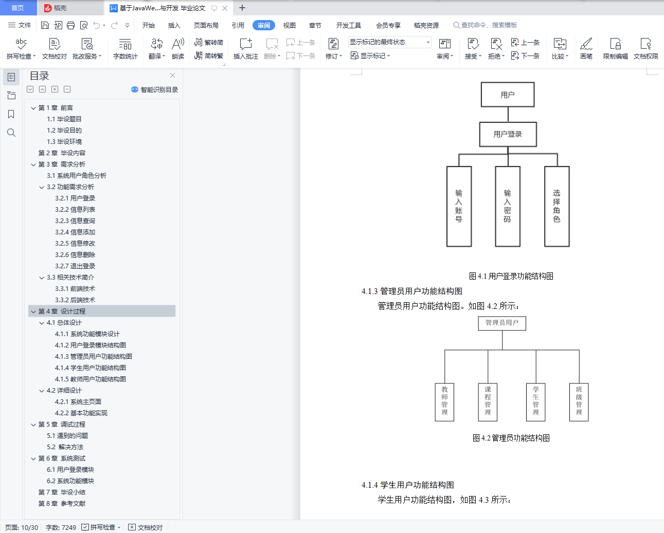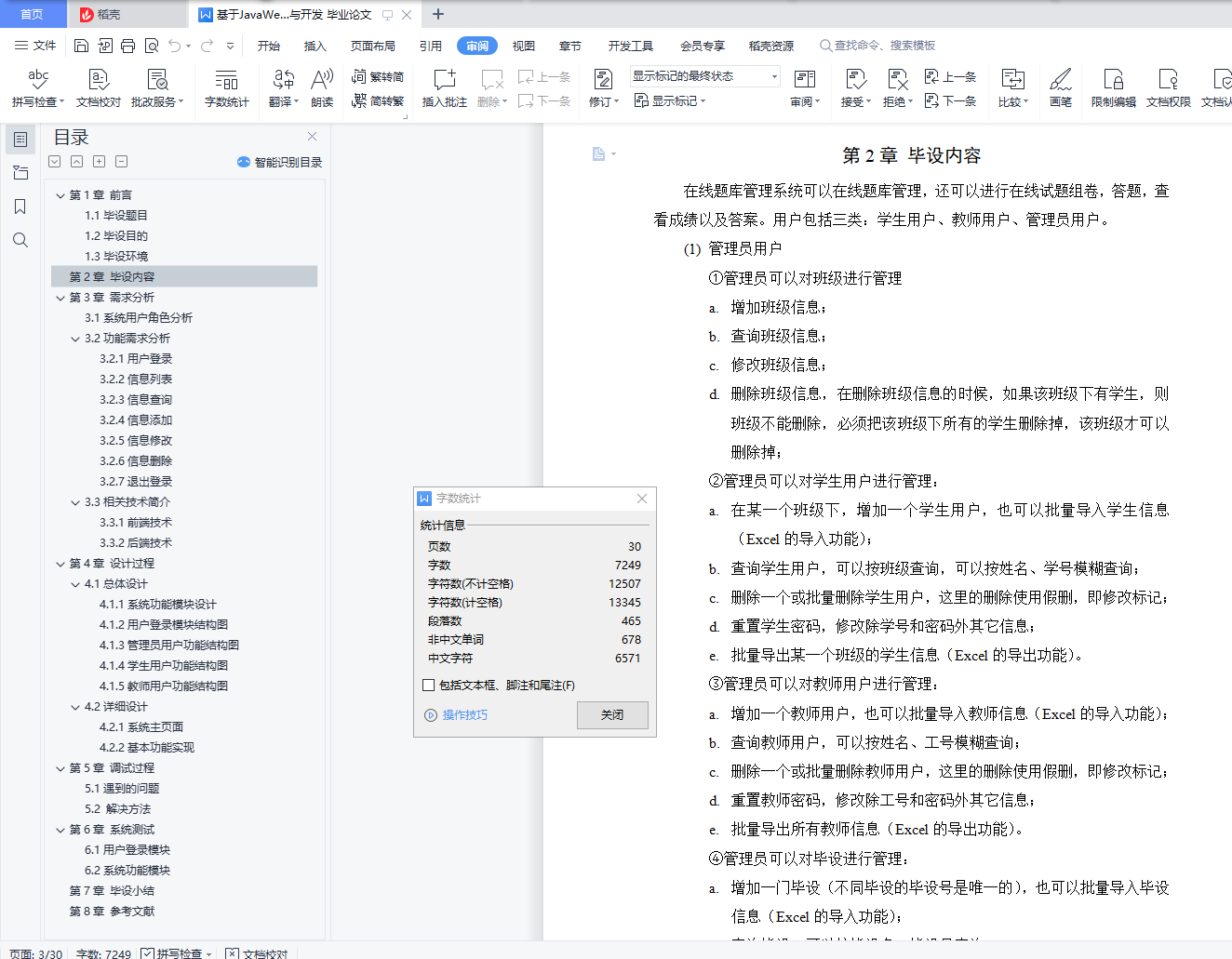目录第1章 前言 21.1毕设题目 21.2毕设目的 21.3毕设环境 3第2章 毕设内容 3第3章 需求分析 63.1系统用户角色分析 63.2功能需求分析 63.2.1用户登录 63.2.2信息列表 73.2.3信息查询 73.2.4信息添加 73.2.5信息修改 73.2.6信息删除 73.2.7退出登录 73.3相关技术简介 73.3.1前端技术 73.3.2后端技术 8第4章 设计过程 94.1总体设计 94.1.1系统功能模块设计 94.1.2用户登录模块结构图 104.1.3管理员用户功能结构图 104.1.4学生用户功能结构图 114.1.5教师用户功能结构图 114.2详细设计 124.2.1系统主页面 124.2.2基本功能实现 12第5章 调试过程 245.1遇到的问题 245.2 解决方法 24第6章 系统测试 256.1用户登录模块 25256.2系统功能模块 2626第7章 毕设小结 29第8章 参考文献 301.3毕设环境1)硬件环境:机房:计算机系多媒体专业机房电脑:双核高性能主机网络:1000Mbps校园网2)开发环境:操作系统:Windows开发工具:MyEclipse+Eclispe ADT容器: Tomcat中间件: JDK数据库: MySQL第2章 毕设内容在线题库管理系统可以在线题库管理,还可以进行在线试题组卷,答题,查看成绩以及答案。用户包括三类:学生用户、教师用户、管理员用户。(1)管理员用户①管理员可以对班级进行管理a.增加班级信息;b.查询班级信息;c.修改班级信息;d.删除班级信息,在删除班级信息的时候,如果该班级下有学生,则班级不能删除,必须把该班级下所有的学生删除掉,该班级才可以删除掉;②管理员可以对学生用户进行管理:a.在某一个班级下,增加一个学生用户,也可以批量导入学生信息(Excel的导入功能);b.查询学生用户,可以按班级查询,可以按姓名、学号模糊查询;c.删除一个或批量删除学生用户,这里的删除使用假删,即修改标记;d.重置学生密码,修改除学号和密码外其它信息;e.批量导出某一个班级的学生信息(Excel的导出功能)。③管理员可以对教师用户进行管理:a.增加一个教师用户,也可以批量导入教师信息(Excel的导入功能);b.查询教师用户,可以按姓名、工号模糊查询;c.删除一个或批量删除教师用户,这里的删除使用假删,即修改标记;d.重置教师密码,修改除工号和密码外其它信息;e.批量导出所有教师信息(Excel的导出功能)。④管理员可以对毕设进行管理:a.增加一门毕设(不同毕设的毕设号是唯一的),也可以批量导入毕设信息(Excel的导入功能);b.查询毕设,可以按毕设名、毕设号查询;c.删除一个或批量删除毕设,这里的删除使用假删,即修改标记;d.批量导出所有毕设信息(Excel的导出功能)。(2) 教师用户①教师可以对毕设进行管理(毕设分为系统所有毕设和该教师所管理的毕设):a.教师用户可以查询到系统中所有毕设,可以按毕设名、毕设号查询;b.教师用户可以将查询到的某一门毕设添加到自己管理的毕设中;c. 增加一门毕设(不同毕设的毕设号是唯一的),同时添加到自己管理的毕设中;d.在自己管理的毕设中,删除一个毕设。②教师可以对班级和学生进行管理:a.教师可以在某一门毕设下添加一个已存在的班级;b.教师可以在某一门毕设下移除班级;c.查询学生用户,对于学生可以按班级查询,可以按姓名、学号查询;d.批量导出某一个班级的学生信息(Excel的导出功能)。③对题库进行管理(题库可以按知识点划分):a.教师用户可以对某一门毕设下进行题库导入;b.对某一门毕设的题库新增、编辑、管理。④组卷功能:a.手动组卷功能;b.随机组卷功能。⑤试卷分析功能(使用ECharts报表)(3)学生用户①学生用户可以注册新的用户,已注册的用户可以登录。②学生用户可以分毕设查看发布的各种题库(必须该毕设下有所在班级),进行下载。③题库练习功能a.顺序练习功能:针对单个或多个知识点来选题;b.错题练习功能:考试或练习中答错题目,系统自动添加;(选做)c.智能抽题功能:针对所学过的多个科目,以及过去的练习情况结合,智能筛选来选题, 适合阶段性复习(选做)。④学生用户可以查看教师发布的试卷,在线测试,提交后查看成绩和总分。⑤个人知识掌握分析功能(使用ECharts报表)。