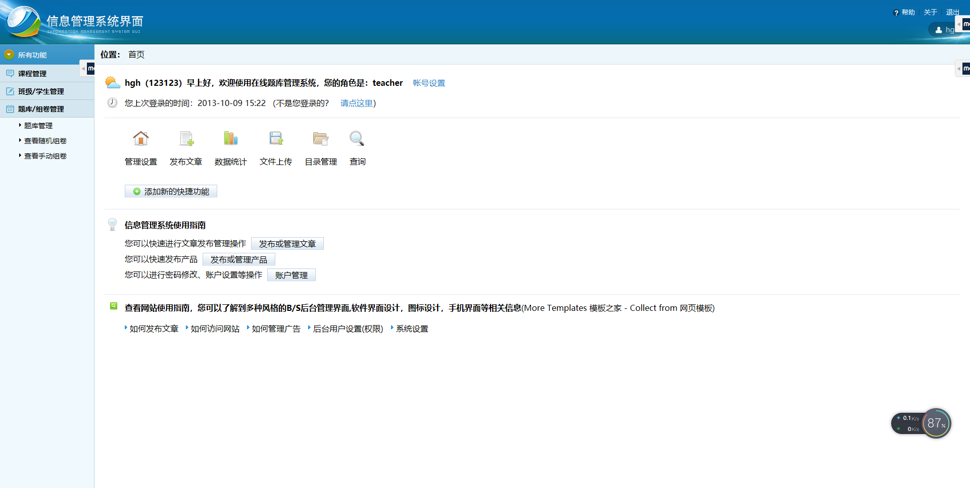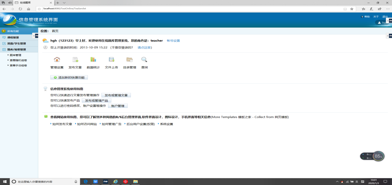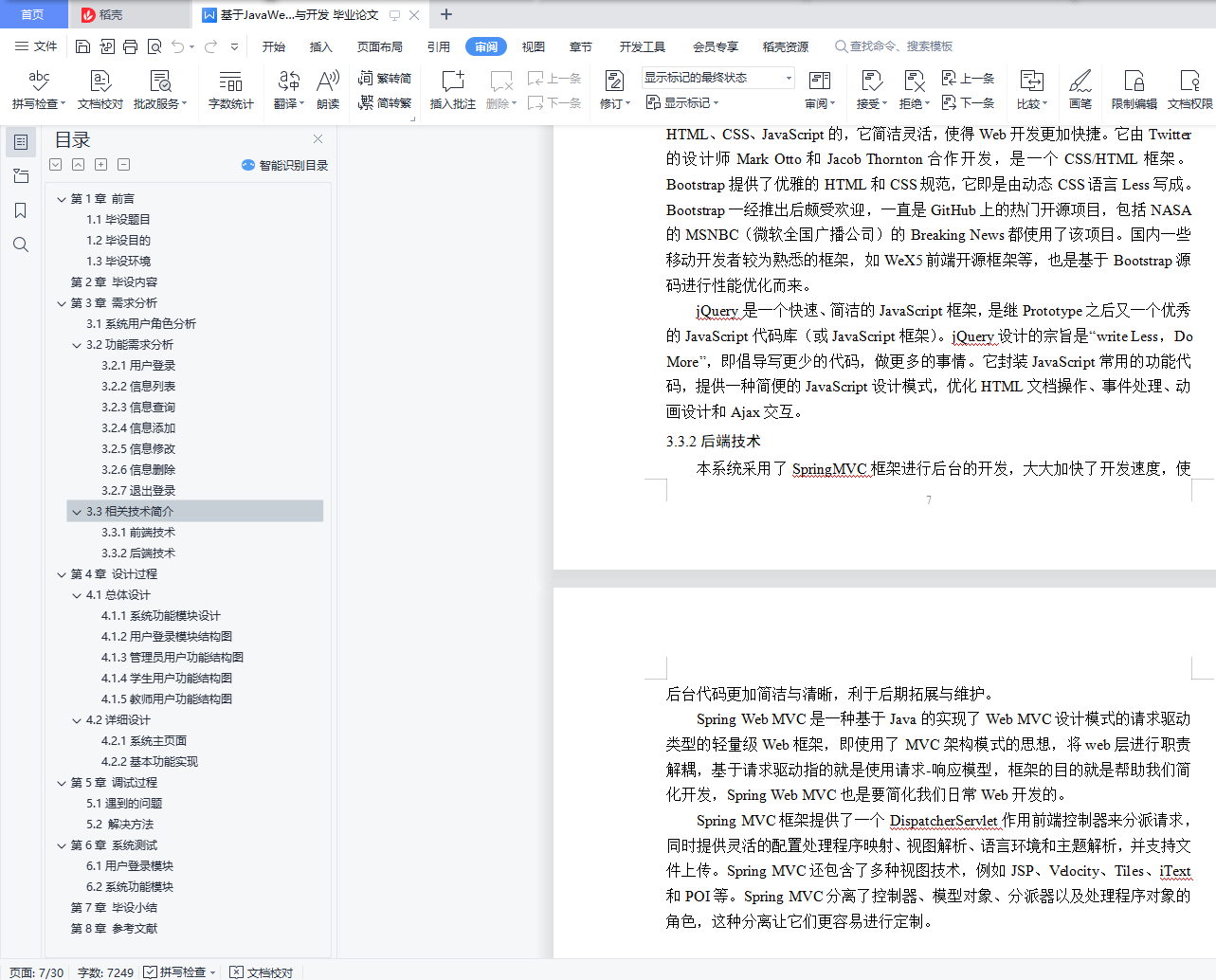 目录第1章 前言 21.1毕设题目 21.2毕设目的 21.3毕设环境 3第2章 毕设内容 3第3章 需求分析 63.1系统用户角色分析 63.2功能需求分析 63.2.1用户登录 63.2.2信息列表 73.2.3信息查询 73.2.4信息添加 73.2.5信息修改 73.2.6信息删除 73.2.7退出登录 73.3相关技术简介 73.3.1前端技术 73.3.2后端技术 8第4章 设计过程 94.1总体设计 94.1.1系统功能模块设计 94.1.2用户登录模块结构图 104.1.3管理员用户功能结构图 104.1.4学生用户功能结构图 114.1.5教师用户功能结构图 114.2详细设计 124.2.1系统主页面 124.2.2基本功能实现 12第5章 调试过程 245.1遇到的问题 245.2 解决方法 24第6章 系统测试 256.1用户登录模块 25256.2系统功能模块 2626第7章 毕设小结 29第8章 参考文献 301.3毕设环境1)硬件环境:机房:计算机系多媒体专业机房电脑:双核高性能主机网络:1000Mbps校园网2)开发环境:操作系统:Windows开发工具:MyEclipse+Eclispe ADT容器: Tomcat中间件: JDK数据库: MySQL第2章 毕设内容在线题库管理系统可以在线题库管理,还可以进行在线试题组卷,答题,查看成绩以及答案。用户包括三类:学生用户、教师用户、管理员用户。(1)管理员用户①管理员可以对班级进行管理a.增加班级信息;b.查询班级信息;c.修改班级信息;d.删除班级信息,在删除班级信息的时候,如果该班级下有学生,则班级不能删除,必须把该班级下所有的学生删除掉,该班级才可以删除掉;②管理员可以对学生用户进行管理:a.在某一个班级下,增加一个学生用户,也可以批量导入学生信息(Excel的导入功能);b.查询学生用户,可以按班级查询,可以按姓名、学号模糊查询;c.删除一个或批量删除学生用户,这里的删除使用假删,即修改标记;d.重置学生密码,修改除学号和密码外其它信息;e.批量导出某一个班级的学生信息(Excel的导出功能)。③管理员可以对教师用户进行管理:a.增加一个教师用户,也可以批量导入教师信息(Excel的导入功能);b.查询教师用户,可以按姓名、工号模糊查询;c.删除一个或批量删除教师用户,这里的删除使用假删,即修改标记;d.重置教师密码,修改除工号和密码外其它信息;e.批量导出所有教师信息(Excel的导出功能)。④管理员可以对毕设进行管理:a.增加一门毕设(不同毕设的毕设号是唯一的),也可以批量导入毕设信息(Excel的导入功能);b.查询毕设,可以按毕设名、毕设号查询;c.删除一个或批量删除毕设,这里的删除使用假删,即修改标记;d.批量导出所有毕设信息(Excel的导出功能)。(2) 教师用户①教师可以对毕设进行管理(毕设分为系统所有毕设和该教师所管理的毕设):a.教师用户可以查询到系统中所有毕设,可以按毕设名、毕设号查询;b.教师用户可以将查询到的某一门毕设添加到自己管理的毕设中;c. 增加一门毕设(不同毕设的毕设号是唯一的),同时添加到自己管理的毕设中;d.在自己管理的毕设中,删除一个毕设。②教师可以对班级和学生进行管理:a.教师可以在某一门毕设下添加一个已存在的班级;b.教师可以在某一门毕设下移除班级;c.查询学生用户,对于学生可以按班级查询,可以按姓名、学号查询;d.批量导出某一个班级的学生信息(Excel的导出功能)。③对题库进行管理(题库可以按知识点划分):a.教师用户可以对某一门毕设下进行题库导入;b.对某一门毕设的题库新增、编辑、管理。④组卷功能:a.手动组卷功能;b.随机组卷功能。⑤试卷分析功能(使用ECharts报表)(3)学生用户①学生用户可以注册新的用户,已注册的用户可以登录。②学生用户可以分毕设查看发布的各种题库(必须该毕设下有所在班级),进行下载。③题库练习功能a.顺序练习功能:针对单个或多个知识点来选题;b.错题练习功能:考试或练习中答错题目,系统自动添加;(选做)c.智能抽题功能:针对所学过的多个科目,以及过去的练习情况结合,智能筛选来选题, 适合阶段性复习(选做)。④学生用户可以查看教师发布的试卷,在线测试,提交后查看成绩和总分。⑤个人知识掌握分析功能(使用ECharts报表)。