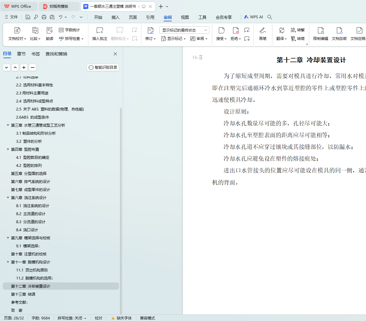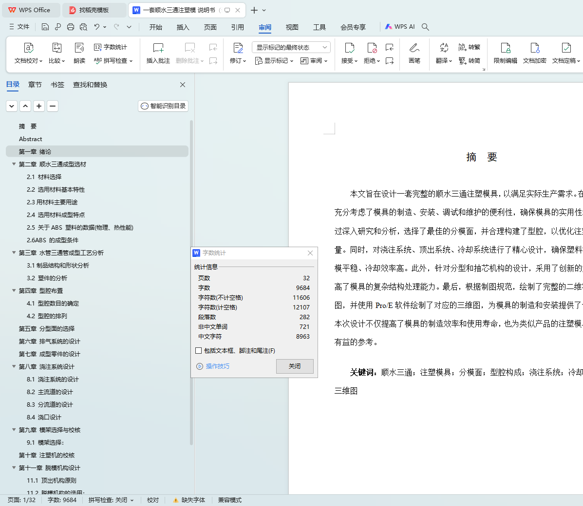 本文旨在设计一套完整的顺水三通注塑模具,以满足实际生产需求。在设计过程中,充分考虑了模具的制造、安装、调试和维护的便利性,确保模具的实用性和可靠性。通过深入研究和分析,选择了最佳的分模面,并合理构建了型腔,以优化注塑件的成型质量。同时,对浇注系统、顶出系统、冷却系统进行了精心设计,确保塑料流动均匀、脱模平稳、冷却效率高。此外,针对分型和抽芯机构的设计,采用了创新的解决方案,提高了模具的复杂结构处理能力。最后,根据制图规范,绘制了完整的二维零件图和装配图,并使用Pro/E软件绘制了对应的三维图,为模具的制造和安装提供了详细的指导。本次设计不仅提高了模具的制造效率和使用寿命,也为类似产品的注塑模具设计提供了有益的参考。