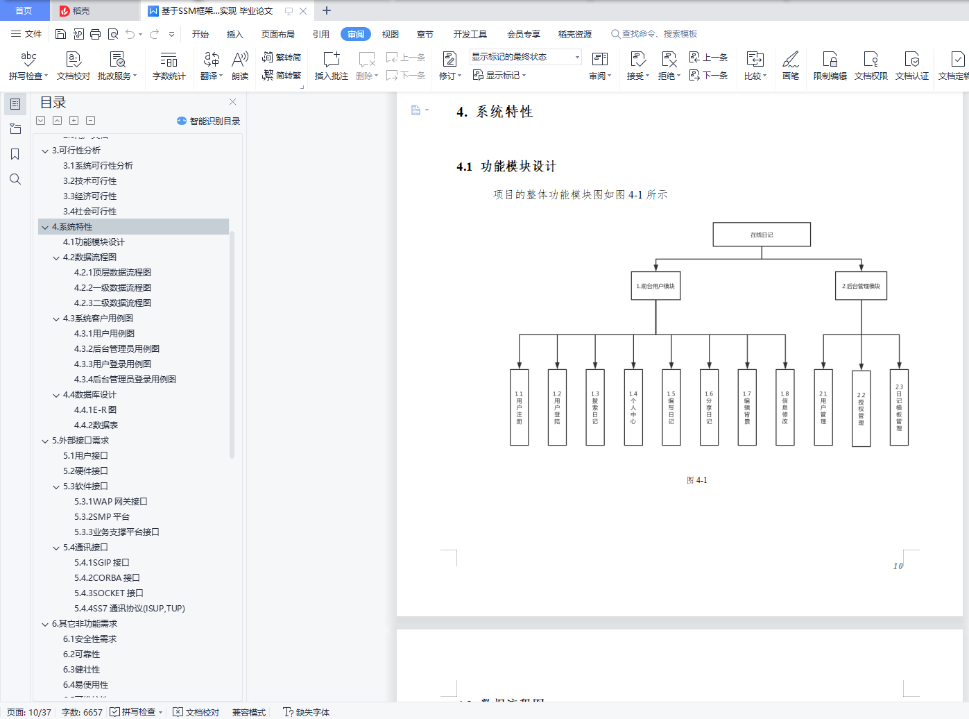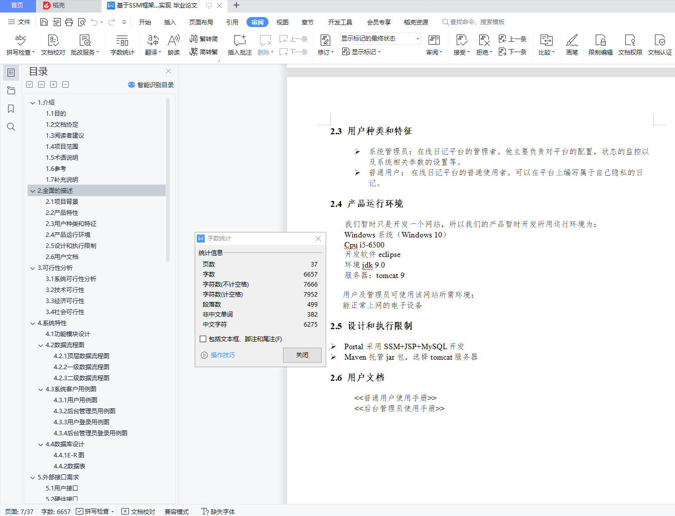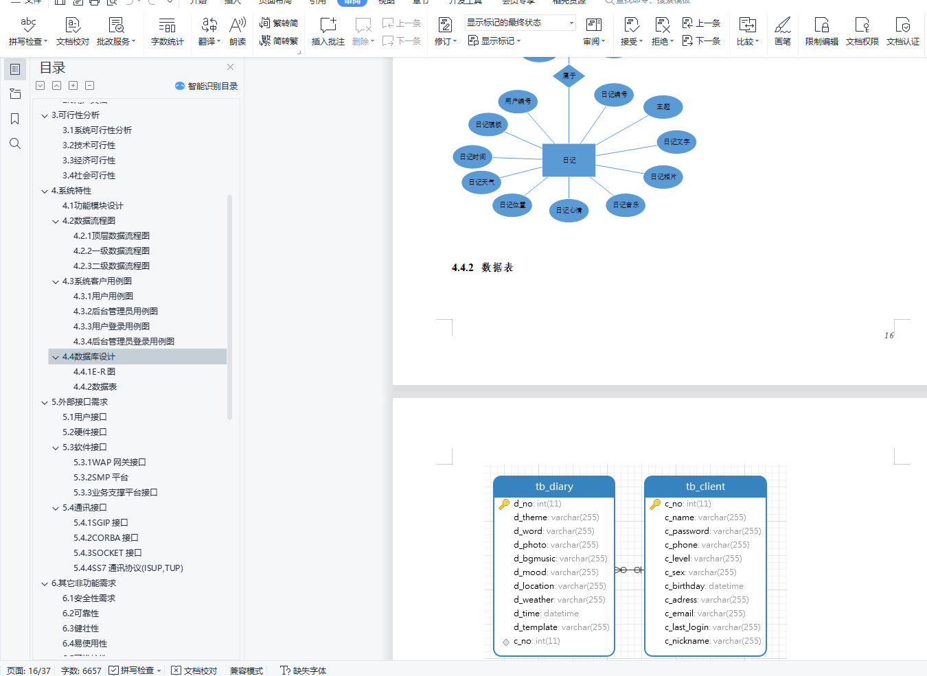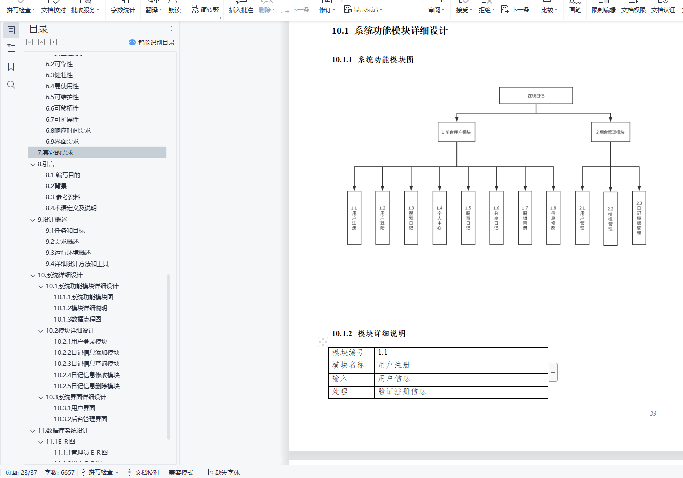 目录1. 介绍 41.1 目的 41.2 文档协定 41.3 阅读者建议 41.4 项目范围 41.5 术语说明 51.6 参考 51.7 补充说明 52. 全面的描述 62.1 项目背景 62.2 产品特性 62.3 用户种类和特征 72.4 产品运行环境 72.5 设计和执行限制 72.6 用户文档 73. 可行性分析 83.1 系统可行性分析 83.2 技术可行性 83.3 经济可行性 83.4 社会可行性 94. 系统特性 94.1 功能模块设计 94.2 数据流程图 104.2.1 顶层数据流程图 104.2.2 一级数据流程图 104.2.3 二级数据流程图 114.3 系统客户用例图 124.3.1 用户用例图 124.3.2 后台管理员用例图 134.3.3 用户登录用例图 134.3.4 后台管理员登录用例图 144.4 数据库设计 144.4.1 E-R图 144.4.2 数据表 155. 外部接口需求 165.1 用户接口 165.2 硬件接口 165.3 软件接口 175.3.1 WAP网关接口 175.3.2 SMP平台 175.3.3 业务支撑平台接口 175.4 通讯接口 175.4.1 SGIP接口 175.4.2 CORBA接口 175.4.3 SOCKET接口 175.4.4 SS7通讯协议(ISUP,TUP) 176. 其它非功能需求 186.1 安全性需求 186.2 可靠性 186.3 健壮性 186.4 易使用性 186.5 可维护性 186.6 可移植性 196.7 可扩展性 196.8 响应时间需求 196.9 界面需求 197. 其它的需求 198. 引言 208.1 编写目的 208.2 背景 208.3 参考资料 208.4 术语定义及说明 209. 设计概述 219.1 任务和目标 219.2 需求概述 219.3 运行环境概述 219.4 详细设计方法和工具 2110. 系统详细设计 2210.1 系统功能模块详细设计 2210.1.1 系统功能模块图 2210.1.2 模块详细说明 2210.1.3 数据流程图 2510.2 模块详细设计 2610.2.1 用户登录模块 2610.2.2 日记信息添加模块 2810.2.3 日记信息查询模块 2910.2.4 日记信息修改模块 3010.2.5 日记信息删除模块 3110.3 系统界面详细设计 3210.3.1 用户界面 3210.3.2 后台管理界面 3311. 数据库系统设计 3311.1 E-R图 3311.1.1 管理员E-R图 3311.1.2 用户E-R图 3311.1.3 日记E-R图 3411.1.4 数据库E-R图 3411.2 数据表 3612. 非功能性设计 36