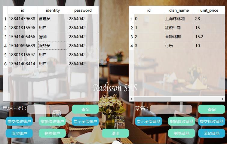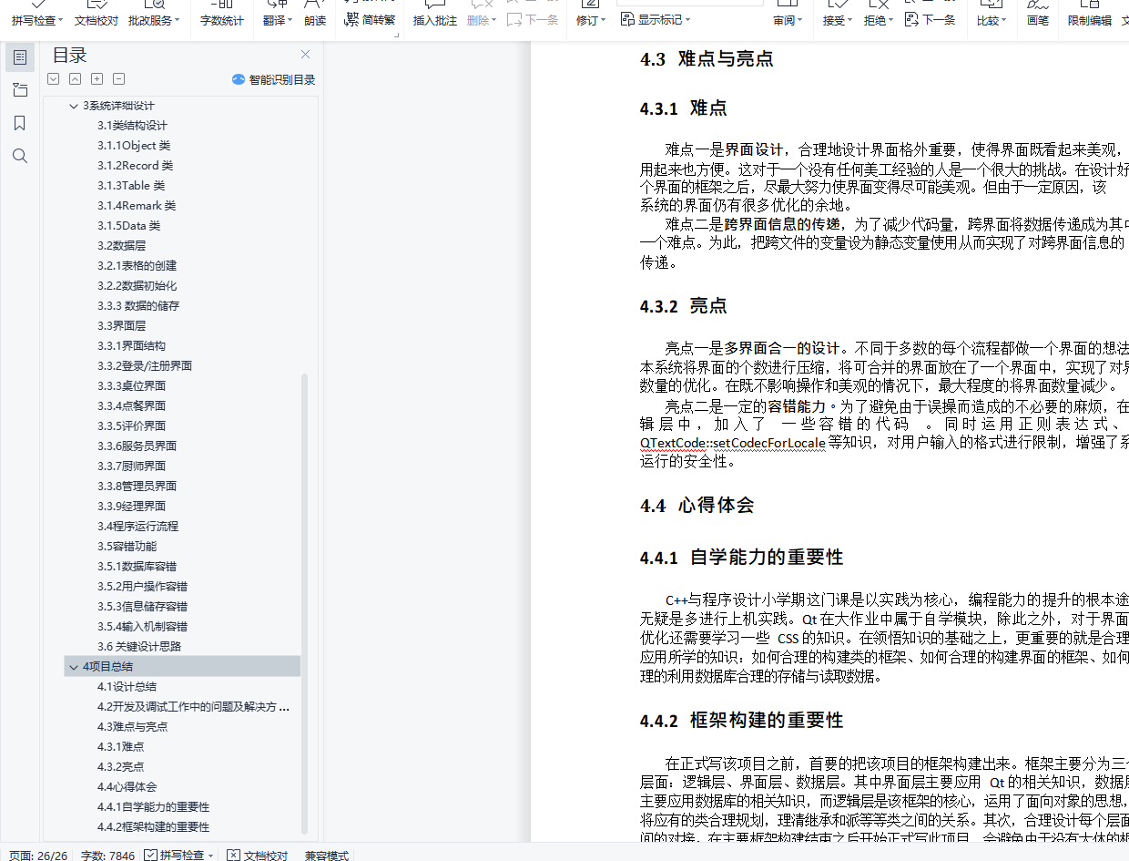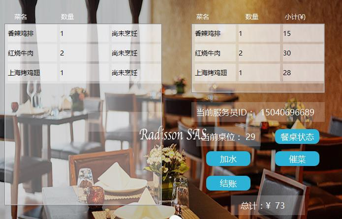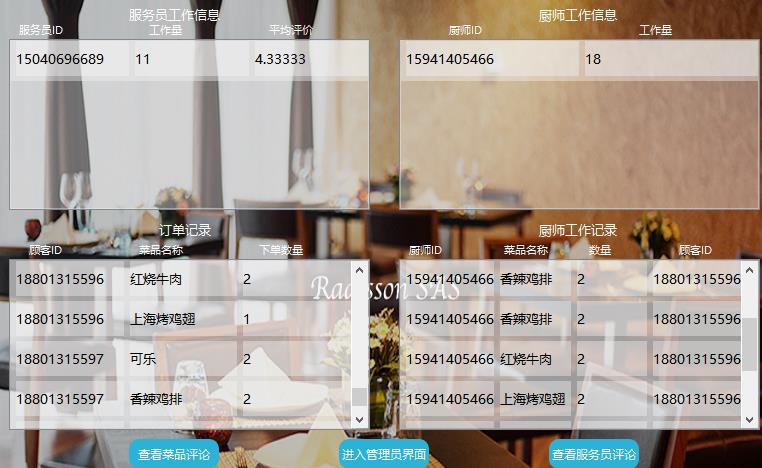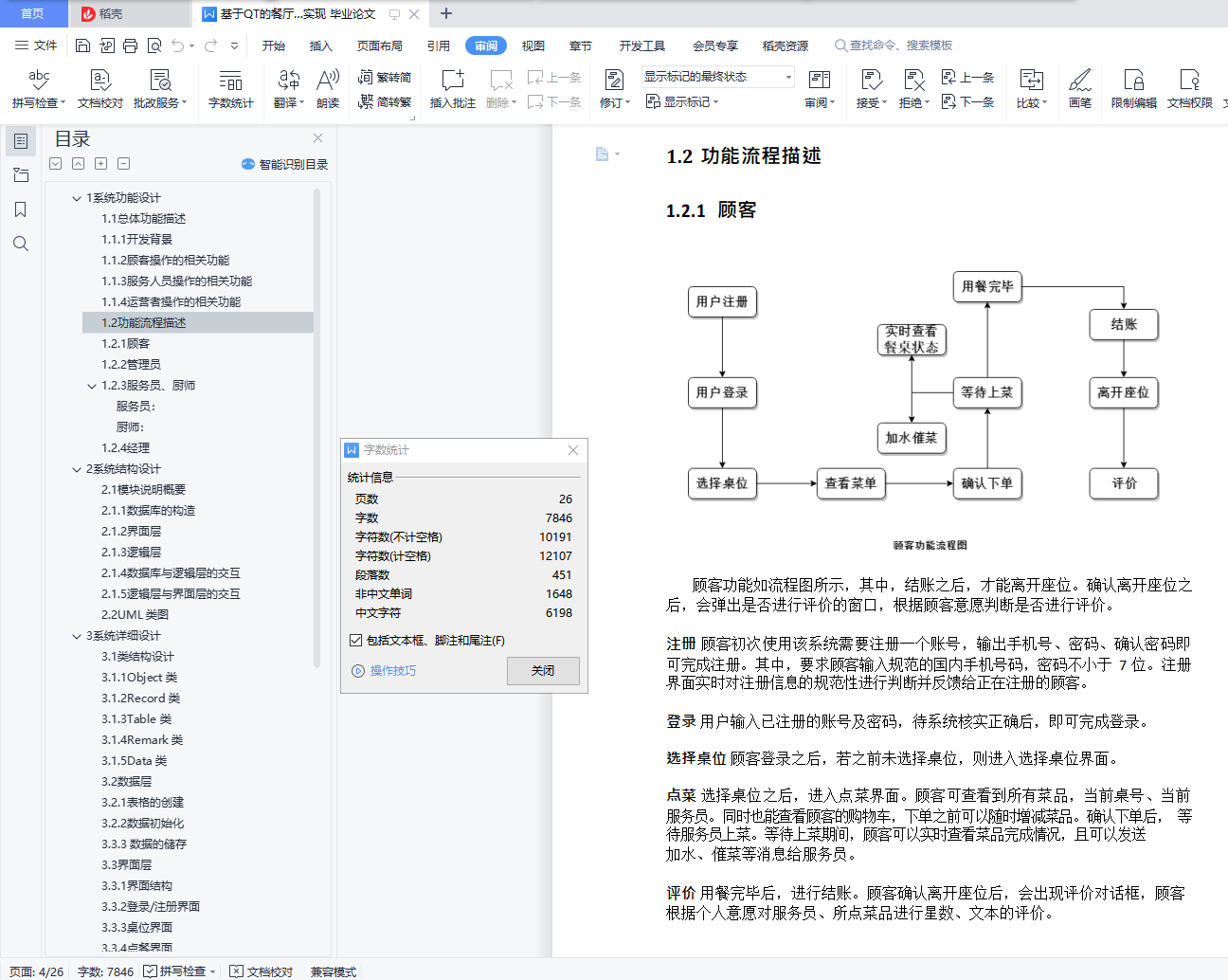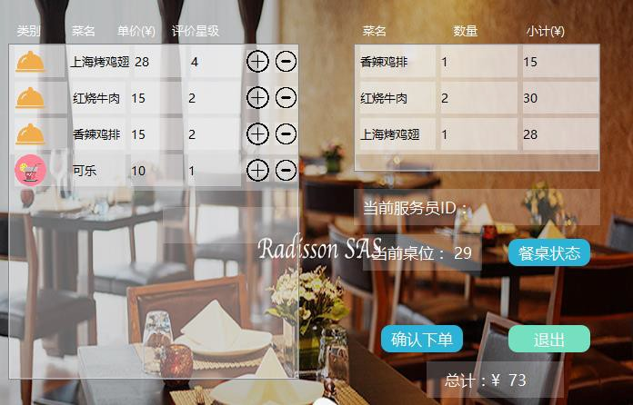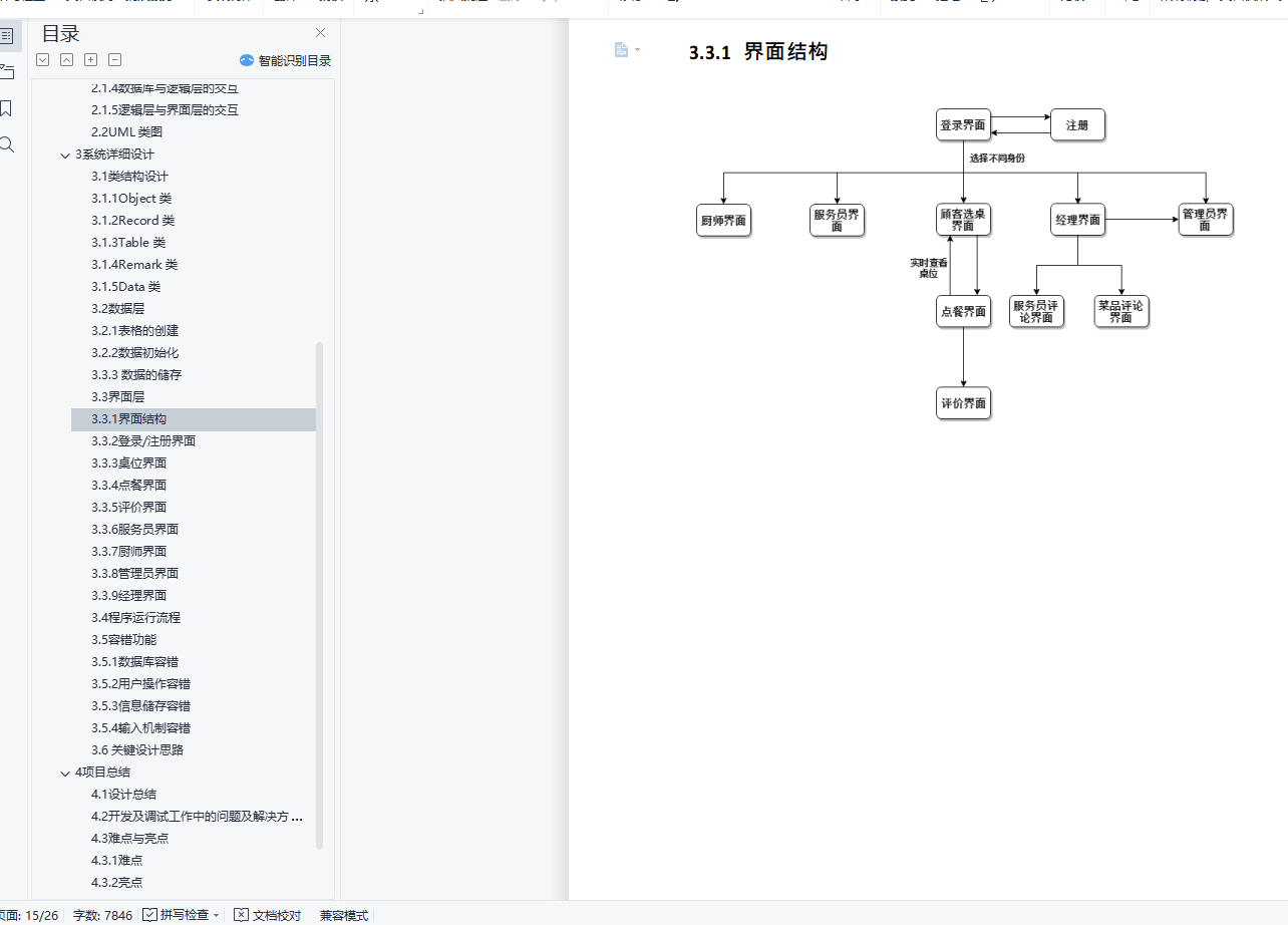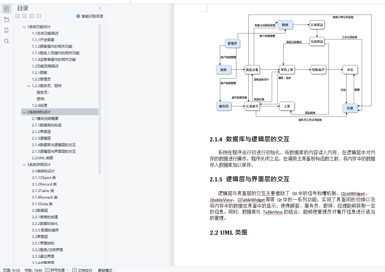 目 录1系统功能设计 41.1总体功能描述 41.1.1开发背景 41.1.2顾客操作的相关功能 41.1.3服务人员操作的相关功能 41.1.4运营者操作的相关功能 41.2功能流程描述 51.2.1顾客 51.2.2管理员 61.2.3服务员、厨师 71.2.4经理 82系统结构设计 82.1模块说明概要 82.1.1数据库的构造 82.1.2界面层 92.1.3逻辑层 92.1.4数据库与逻辑层的交互 102.1.5逻辑层与界面层的交互 102.2UML 类图 103系统详细设计 133.1类结构设计 133.1.1Object 类 133.1.2Record 类 143.1.3Table 类 143.1.4Remark 类 143.1.5Data 类 143.2数据层 143.2.1表格的创建 143.2.2数据初始化 153.3.3 数据的储存 153.3界面层 163.3.1界面结构 163.3.2登录/注册界面 173.3.3桌位界面 183.3.4点餐界面 203.3.5评价界面 213.3.6服务员界面 223.3.7厨师界面 223.3.8管理员界面 233.3.9经理界面 243.4程序运行流程 253.5容错功能 253.5.1数据库容错 253.5.2用户操作容错 253.5.3信息储存容错 253.5.4输入机制容错 253.6关键设计思路 264项目总结 264.1设计总结 264.2开发及调试工作中的问题及解决方法 264.3难点与亮点 274.3.1 难点 274.3.2 亮点 274.4心得体会 274.4.1自学能力的重要性 274.4.2框架构建的重要性 275相关问题的说明 281系统功能设计1.1总体功能描述1.1.1开发背景随着信息时代的飞速发展,人们的生活水平不断提高,餐饮业的消费持续增长。传统的单纯靠人工管理日常运作、人工记录顾客的点菜、人工通知厨师所需做的菜品、人工结账等等的以人工为主导的方式早已无法满足新时代的需求。所以,一套基于互联网的高效的餐厅服务与管理系统应时而生。如此不但能提高工作效率,也避免了传统方式会产生的不必要的麻烦,同时也方便了管理者对餐厅的运营。1.1.2顾客操作的相关功能用户若以顾客身份登录,如果有账号密码,可直接输入登录,或注册之后再进行登录。登录成功后,会进入到座位选择界面,选择座位结束后,进入到点餐界面。顾客可以浏览菜品的名称、单价、平均评价星数(5 星满)。点餐结束后, 待服务员、厨师认领。认领成功后,顾客可发送催菜、加水等消息于服务员。用餐完毕后进行结账并离开桌位。确认离开座位后,顾客可以选择性对服务员和已点的菜品进行评价。