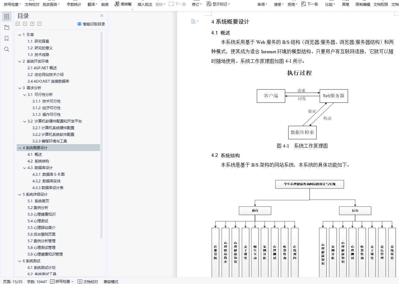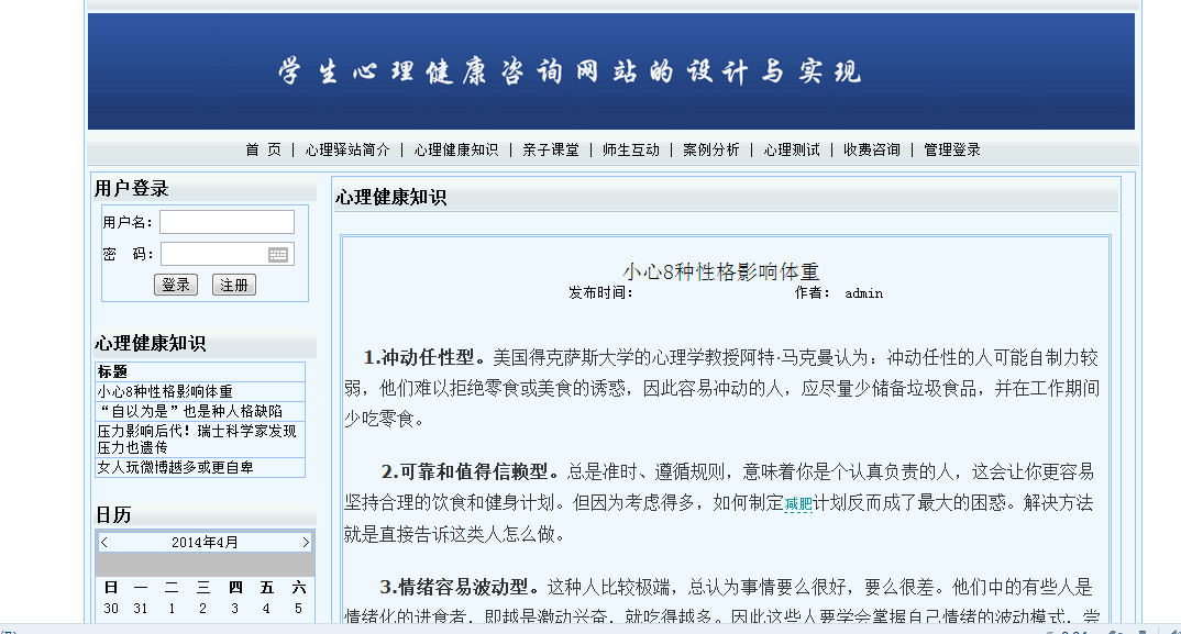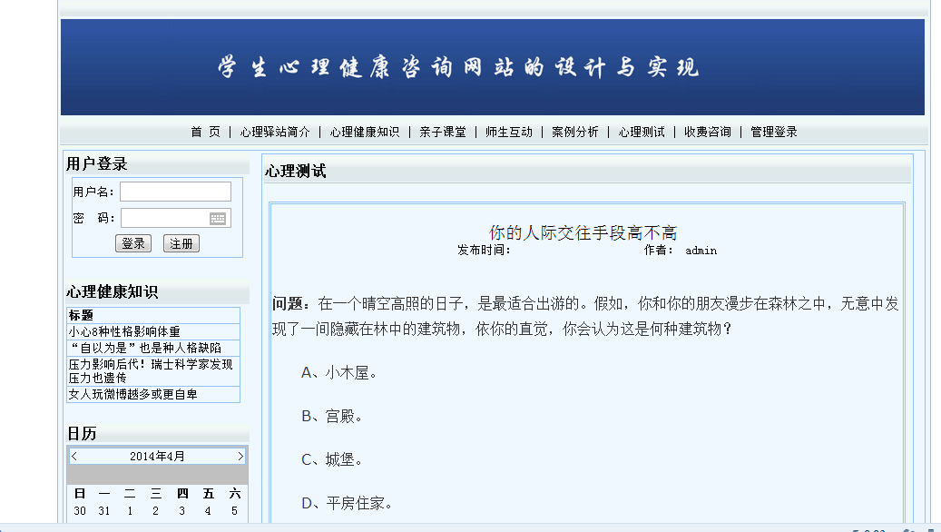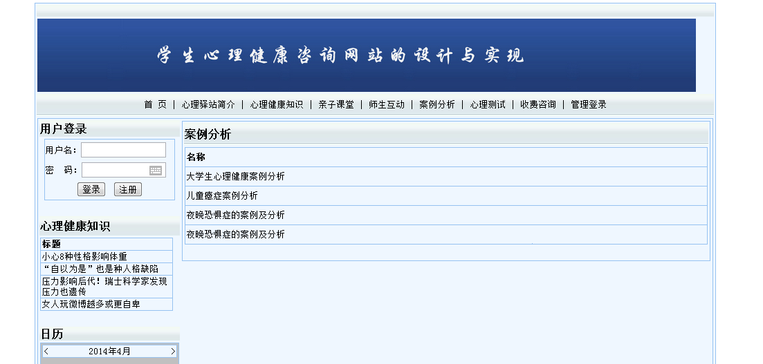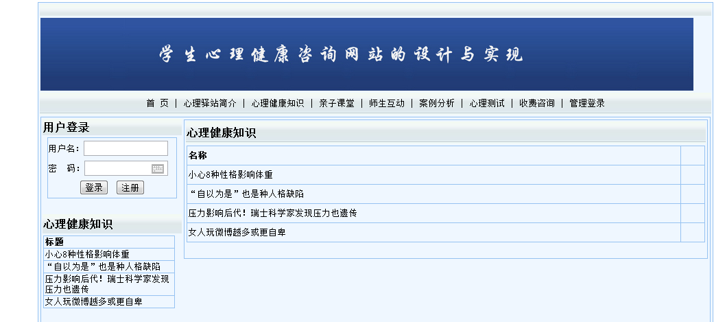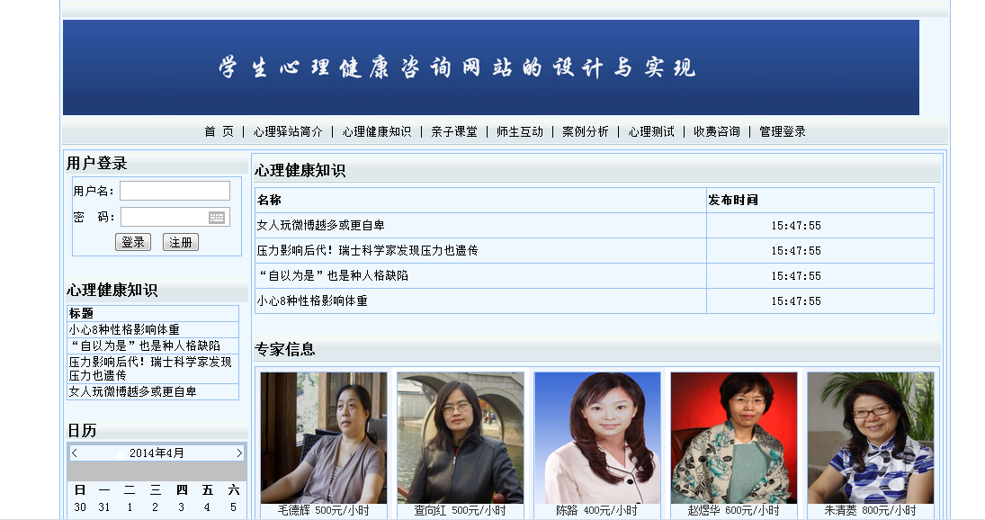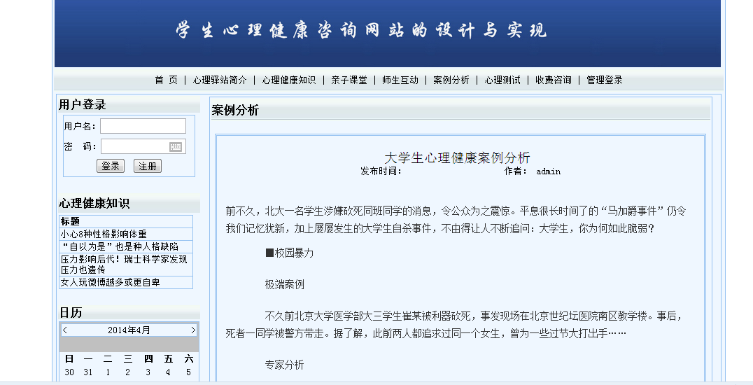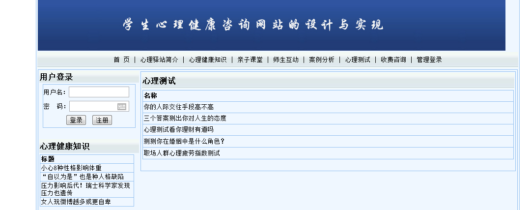 摘 要随着社会的发展,人们的生活节奏越来越快,相对压力也越来越大。在这么大的压力下会出现一些心理问题。学生和家长如何拥有健康的心态?所以更好的学习是本研究的主要内容。本设计利用VS2008搭建网络校园心理健康管理平台设计,力图让所有学生在线了解有关该心理健康的一些信息。本文从理论和实践两个角度,对具有数据挖掘能力的学生校园心理健康管理平台的设计与实现进行了设计和分析。论文首先比较详细的介绍了面向对象分析设计的相关概念和技术。特别深入介绍了本系统所使用的知识,包括:面向对象的分析和设计流程; VS2008在系统中使用的技术的性质,它的结构框架以及如何使用它。然后,对课程体系的可行性进行了分析,明确了课程体系的设计思路、设计目标和总体结构。最后详细介绍了系统主页面、数据库和应用程序的设计和实现。根据系统需要的功能,使用MicrosoftSQL Server 2008 Express创建数据库后台,选择功能强大的Microsoft Visual Studio2008作为开发工具,严格遵循软件工程开发原则,使用面向对象。方法论、详细设计和分析完善了系统。关键词:心理健康;管理平台;心理咨询;ASP.NET;SQL Server数据库目 录1 引言 11.1 研究背景 11.2 研究的意义 11.3 技术线路 22 系统开发环境 42.1 ASP.NET概述 42.2 动态网站技术介绍 52.4 ADO.NET连接数据库 53 需求分析 73.1 可行性分析 73.1.1 技术可行性 73.1.2 经济可行性 73.1.3 操作可行性 73.2 计算机软硬件配置和开发平台 83.2.1计算机系统硬件配置 83.2.2计算机系统软件配置 83.2.3编程环境与工具 84系统概要设计 104.1 概述 104.2 系统结构 104.3 数据库设计 114.3.1 数据库E-R图 114.3.2 数据库实体 114.3.3数据库设计表 125系统详细设计 155.1 系统首页 155.2案例分析 165.3心理健康知识 175.4心理测试 185.5心理驿站简介 195.6后台登陆页面 195.7案例分析管理 205.8心理测试管理 215.9心理健康知识管理 226系统测试 236.1系统测试计划 236.2 系统测试工具 236.3系统测试方法和测试类型 236.4系统测试的目的和原则 246.5系统测试效果 247 总结 28参考文献 29致 谢 30