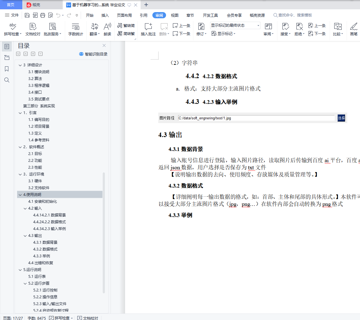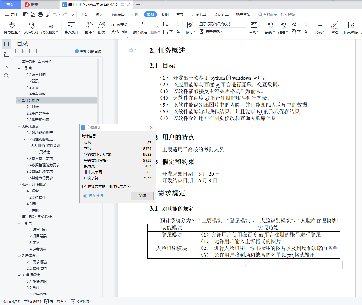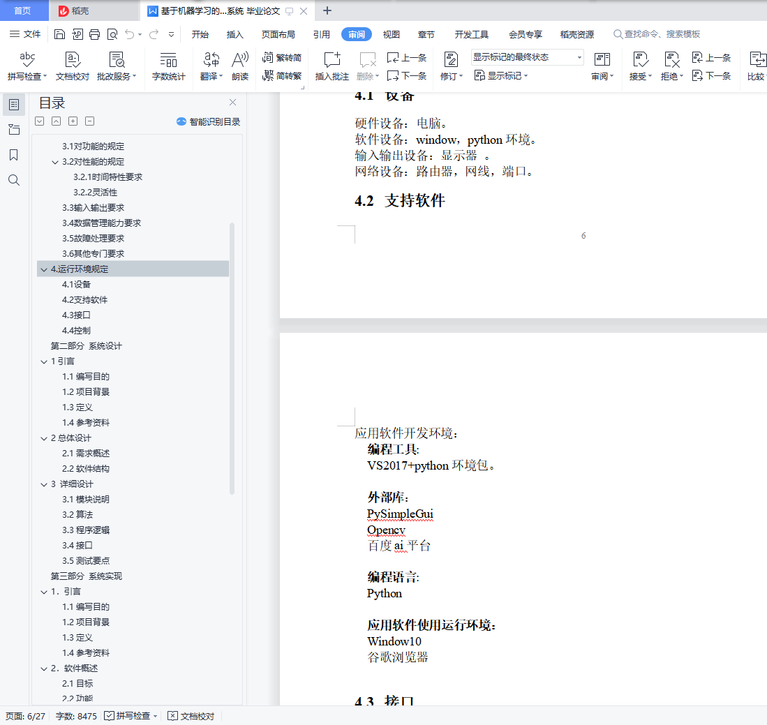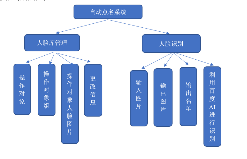 目录第一部分 需求分析 31. 引言 31.1 编写目的 31.2 背景 31.3 定义 31.4 参考资料 42. 任务概述 42.1 目标 42.2 用户的特点 42.3 假定和约束 43. 需求规定 43.1 对功能的规定 43.2 对性能的规定 53.2.1 时间特性要求 53.2.2 灵活性 53.3 输入输出要求 53.4 数据管理能力要求 53.5 故障处理要求 63.6 其他专门要求 64. 运行环境规定 64.1 设备 64.2 支持软件 64.3 接口 74.4 控制 7第二部分 系统设计 81 引言 81.1 编写目的 81.2 项目背景 81.3 定义 81.4 参考资料 92 总体设计 92.1需求概述 9(1) 需要能够使用在百度ai平台注册的账号进行访问 92.2 软件结构 93 详细设计 103.1 模块说明 103.2 算法 123.3 程序逻辑 121313131313143.4接口 143.5测试要点 14第三部分 系统实现 141.引言 141.1编写目的 141.2项目背景 151.3定义 151.4参考资料 162.软件概述 162.1目标 162.2功能 162.3性能 163.运行环境 163.1硬件 163.2支持软件 174.使用说明 174.1安装和初始化 174.2输入 174.4.1 4.2.1数据背景 174.4.2 4.2.2数据格式 174.4.3 4.2.3输入举例 174.3输出 184.3.1数据背景 184.3.2数据格式 184.3.3举例 184.4出错和恢复 195.运行说明 205.1运行表 205.2运行步骤 205.2.1运行控制 205.2.2操作信息 205.2.3输入/输出文件 245.2.4启动或恢复过程 246.非常规过程 247.操作命令一览表 248.程序文件(或命令文件)和数据文件一览表 249. 用户操作举例 25第四部分 总结 27第一部分 需求分析1.引言1.1编写目的本文档用于指导软件开发者为开发软件工程课程设计项目,进一步定制软件开发的细节问题,以达到具体化软件开发工作,保证软件的开发质量、需求的完整与可追溯性的目的。它说明了本产品的各项功能需求、性能需求和数据要求,明确标识各功能的实现过程,阐述实用背景及范围,提供客户解决问题或达到目标所需的条件或权能,提供一个度量和遵循的标准。1.2背景随着人工智能技术的日渐成熟,越来越多的重复且耗费时间的操作被人工智能应用代替,在课堂上,老师往往要在教学时间里抽出一部分来进行考勤,即拖延了教学进度,也不利于课堂秩序的正常进行,因此有必要开发出一款基于机器学习的人脸点名系统,来因对这样的挑战,并且有效降低老师或是教务员的负担。