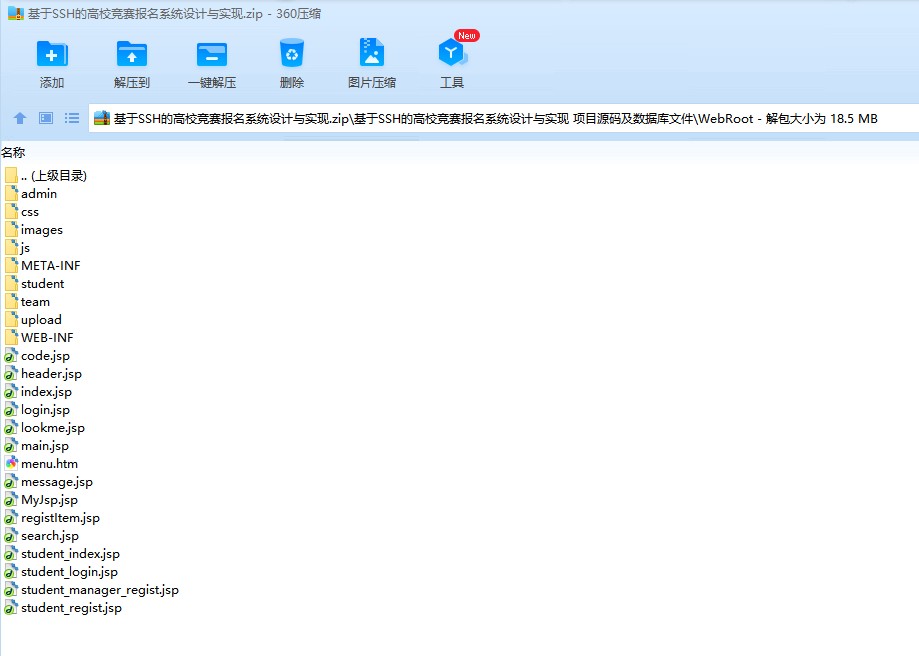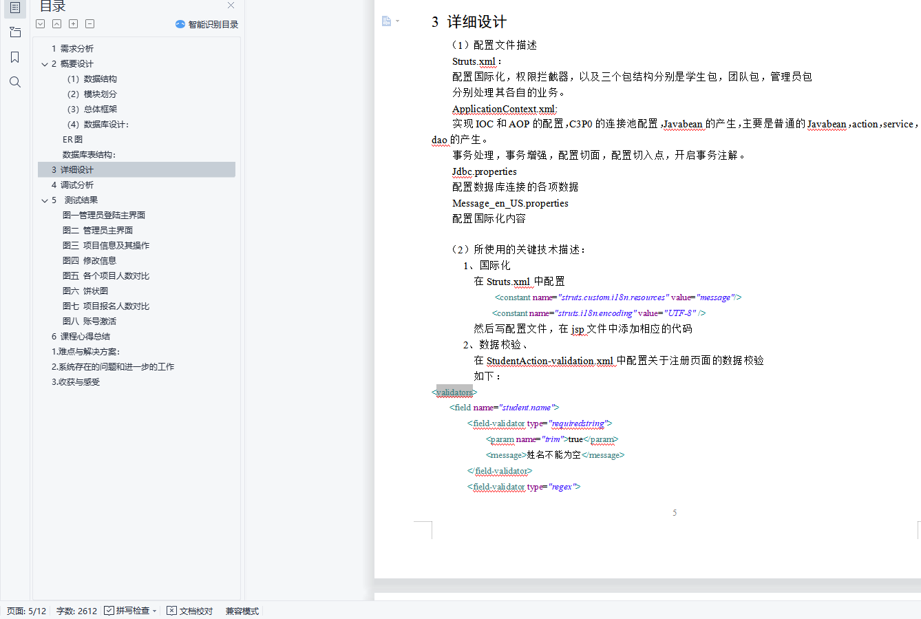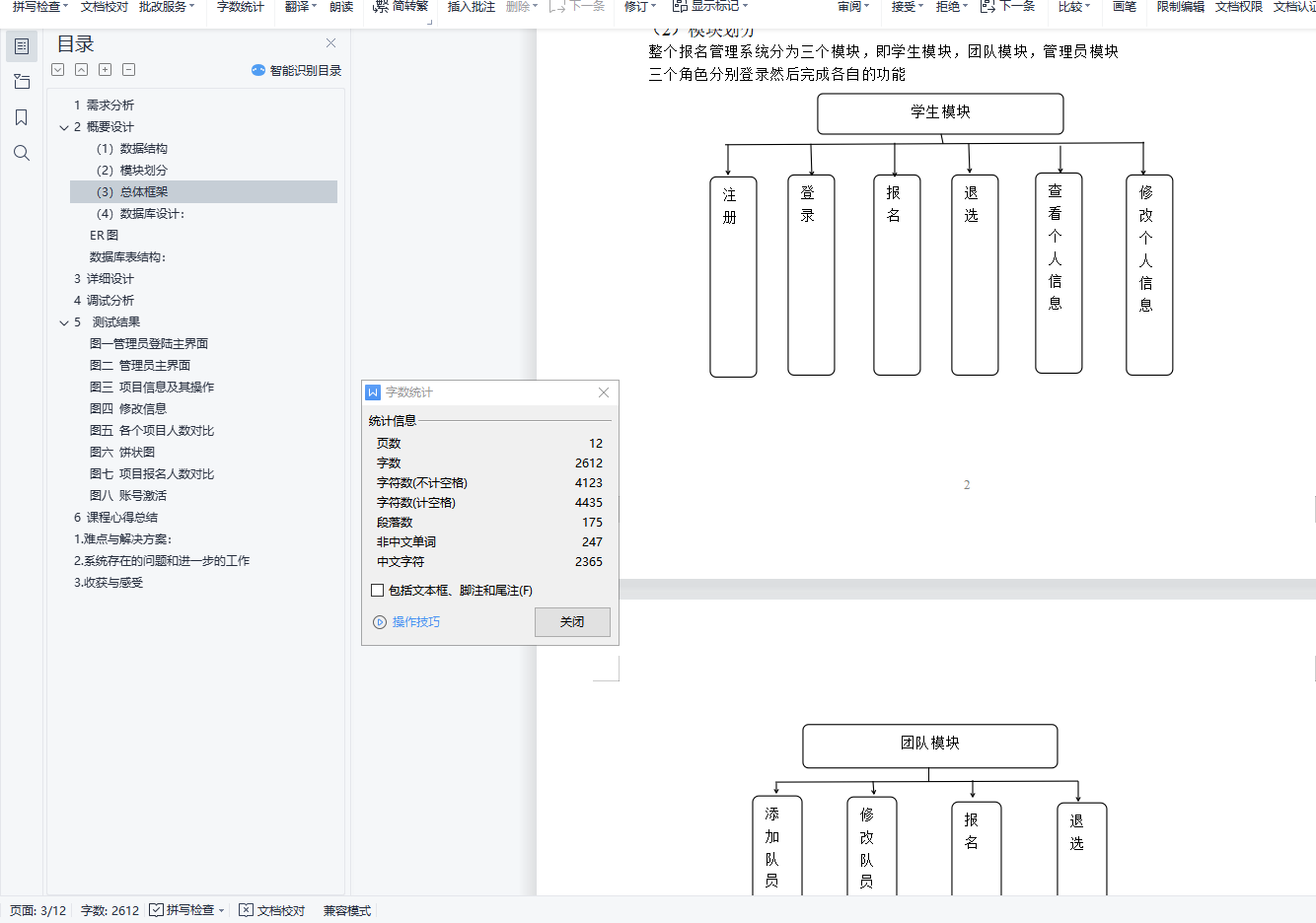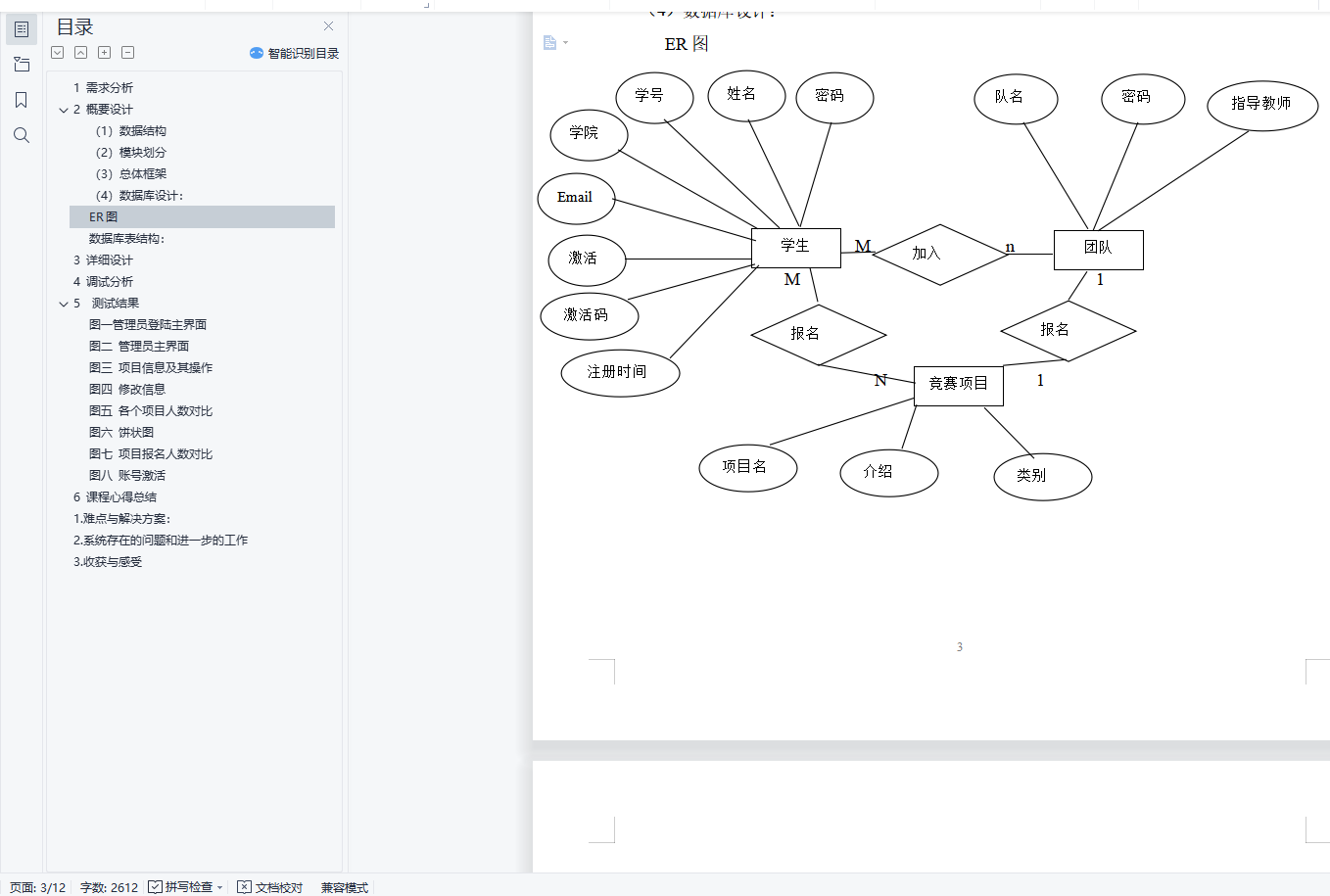 目录1 需求分析 12 概要设计 1(1)数据结构 1(2) 模块划分 2(3) 总体框架 2(4)数据库设计: 2ER图 2数据库表结构: 33 详细设计 44 调试分析 65 测试结果 7图一管理员登陆主界面 7图二 管理员主界面 7图三 项目信息及其操作 8图四 修改信息 8图五 各个项目人数对比 9图六 饼状图 9图七 项目报名人数对比 10图八 账号激活 106 课程心得总结 111.难点与解决方案: 112.系统存在的问题和进一步的工作 113.收获与感受 111 需求分析开发一个高校竞赛报名管理系统,采用Web方式,由前台和后台管理两个部分组成。前台作为与用户 直接交互的可视化界面,后台管理的维护工作主要由系统管理员进行,包括完成对数据的保护和修改。使之能提供以下基本功能:(1).实现管理人员的登录界面以及拥有管理的功能。(2).实现学生注册、登录、选择报名项目,修改报名信息,取消报名等功能。(3).实现竞赛项目的增删改查管理等。(4).实现比赛团队的注册登录。扩展功能:(1)简单的权限处理 (2)报表打印功能(3)统计功能