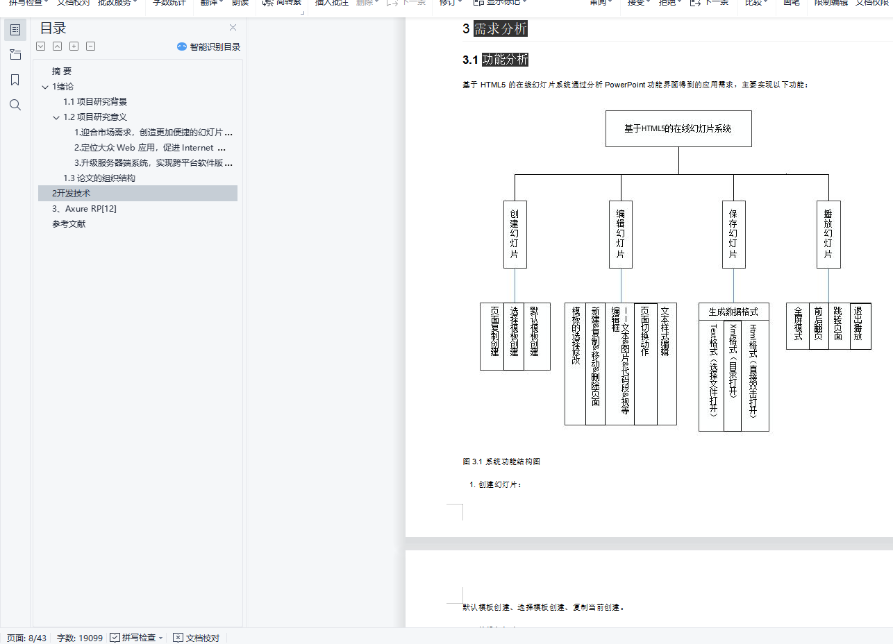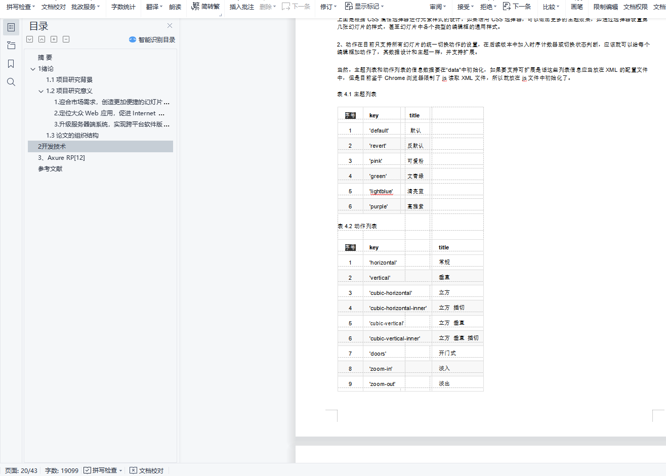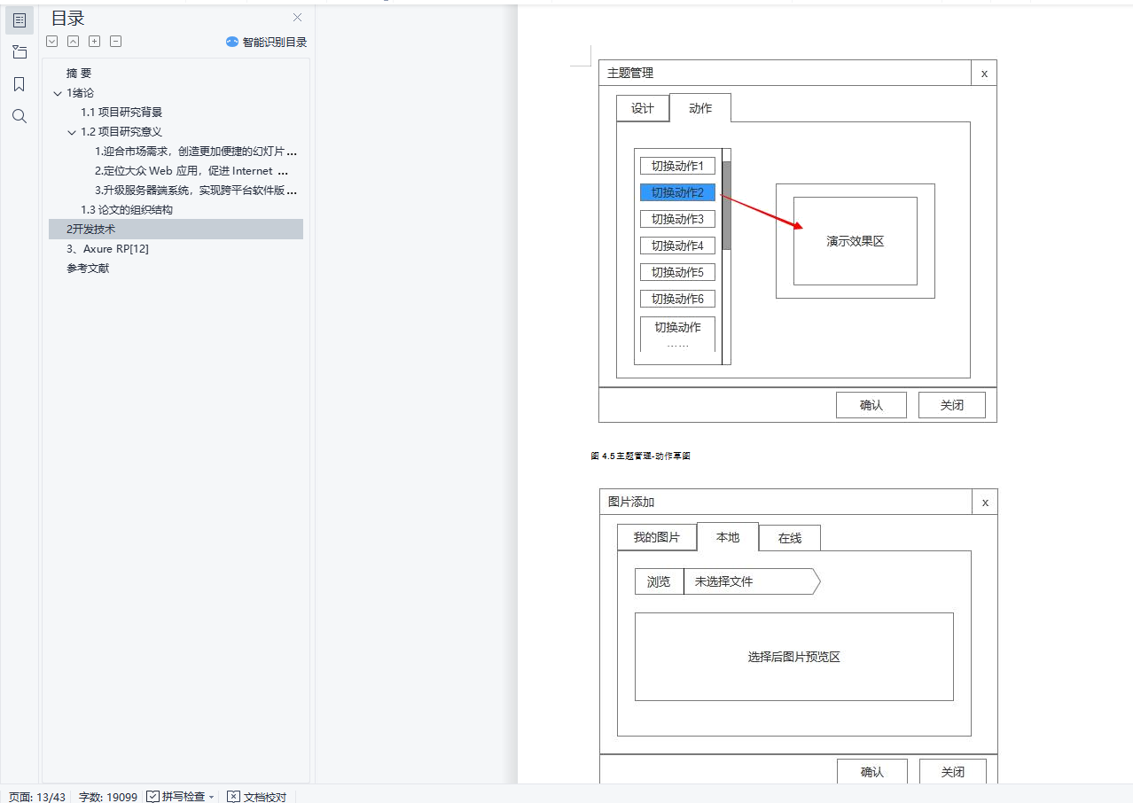 目录摘 要 11 绪论 11.1 项目研究背景 11.2 项目研究意义 31. 迎合市场需求,创造更加便捷的幻灯片使用环境 32. 定位大众 Web 应用,促进 Internet Web 系统的发展进程 43. 升级服务器端系统,实现跨平台软件版本同步和环境的统一 41.3 论文的组织结构 42 开发技术 43、Axure RP[12] 6参考文献 42摘 要进入新世纪以来,信息技术产业迅猛发展,已经逐渐深入到了日常生活的方方面面。通过幻灯片这类的演示文稿软件,能更好、更直观的表达出演讲者所要表达的主题和主要内容,使演讲者有了它在演讲的时候能实现更有秩序和更完美的演讲,提高沟通交流的效率。目前,不论是在科学教育、商业展示、产品说明、比赛演讲等各个方面,都是依赖幻灯片类软件,以实现有效的表达。HTML5 作为 Web 时代的新星,拥有更高的可用性和更好的体验效果,并且对 HTML 标签和一些属性进行了良好的扩展,使得前端拥有更加丰富的功能。特别是在多媒体方面,HTML5 给出了更简便稳定的实现方案,可以很好的代替 FLASH 和 Silverlight。 HTML5 被设计出来,致力于打造一个无缝的网络环境,不管是在 PC 端,还是移动端,都能完美兼容,使得基于它的应用能够有较好的移植性。基于 HTML5 的在线幻灯片系统,利用 Sublime Text 编辑器和 Fierfox Developer Edition 工具,实现了在线幻灯片系统的编辑模块、保存模块和播放模块。它拥有简洁清爽的界面,自然流畅的体验和全面实用的功能,利用 RequireJS 实现面向模块的架构,有良好的兼容性和扩展性。基于 HTML5 的在线幻灯片系统,仅仅通过浏览器实现幻灯片的编辑、保存、演示,让你摆脱用 U 盘携带存储和系统软件环境的限制。关键词: HTML5; Sublime Text; RequireJS; 在线幻灯片