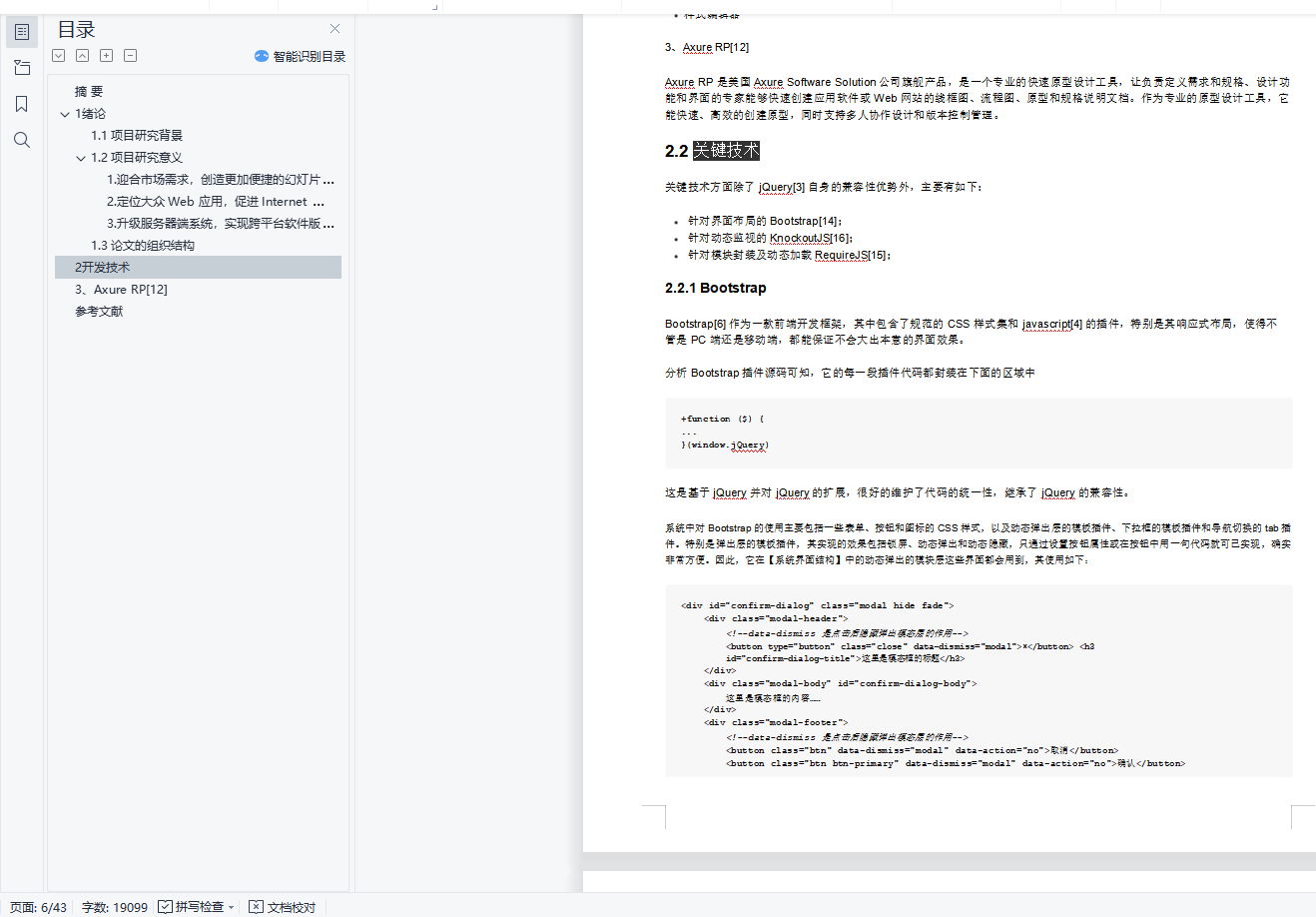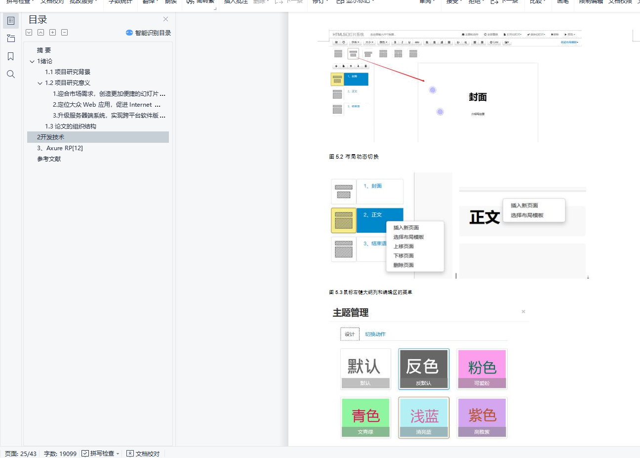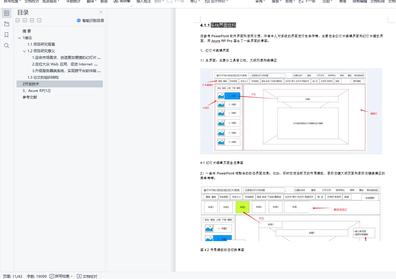目录摘 要 11 绪论 11.1 项目研究背景 11.2 项目研究意义 31. 迎合市场需求,创造更加便捷的幻灯片使用环境 32. 定位大众 Web 应用,促进 Internet Web 系统的发展进程 43. 升级服务器端系统,实现跨平台软件版本同步和环境的统一 41.3 论文的组织结构 42 开发技术 43、Axure RP[12] 6参考文献 42摘 要进入新世纪以来,信息技术产业迅猛发展,已经逐渐深入到了日常生活的方方面面。通过幻灯片这类的演示文稿软件,能更好、更直观的表达出演讲者所要表达的主题和主要内容,使演讲者有了它在演讲的时候能实现更有秩序和更完美的演讲,提高沟通交流的效率。目前,不论是在科学教育、商业展示、产品说明、比赛演讲等各个方面,都是依赖幻灯片类软件,以实现有效的表达。HTML5 作为 Web 时代的新星,拥有更高的可用性和更好的体验效果,并且对 HTML 标签和一些属性进行了良好的扩展,使得前端拥有更加丰富的功能。特别是在多媒体方面,HTML5 给出了更简便稳定的实现方案,可以很好的代替 FLASH 和 Silverlight。 HTML5 被设计出来,致力于打造一个无缝的网络环境,不管是在 PC 端,还是移动端,都能完美兼容,使得基于它的应用能够有较好的移植性。基于 HTML5 的在线幻灯片系统,利用 Sublime Text 编辑器和 Fierfox Developer Edition 工具,实现了在线幻灯片系统的编辑模块、保存模块和播放模块。它拥有简洁清爽的界面,自然流畅的体验和全面实用的功能,利用 RequireJS 实现面向模块的架构,有良好的兼容性和扩展性。基于 HTML5 的在线幻灯片系统,仅仅通过浏览器实现幻灯片的编辑、保存、演示,让你摆脱用 U 盘携带存储和系统软件环境的限制。关键词: HTML5; Sublime Text; RequireJS; 在线幻灯片