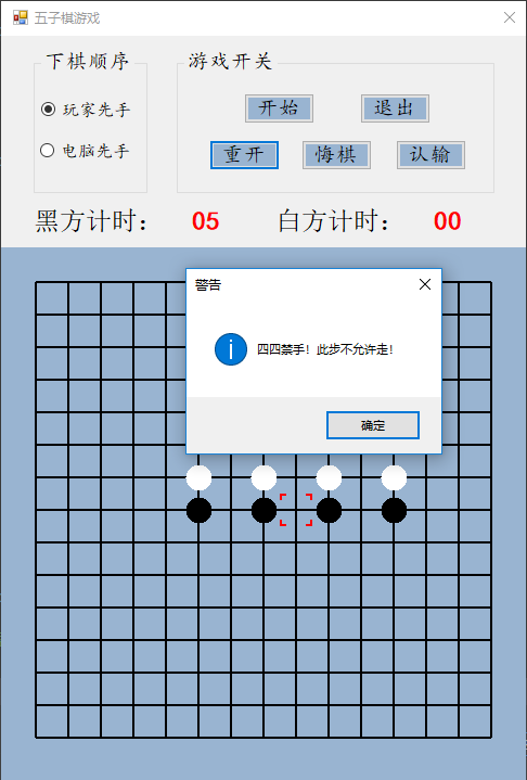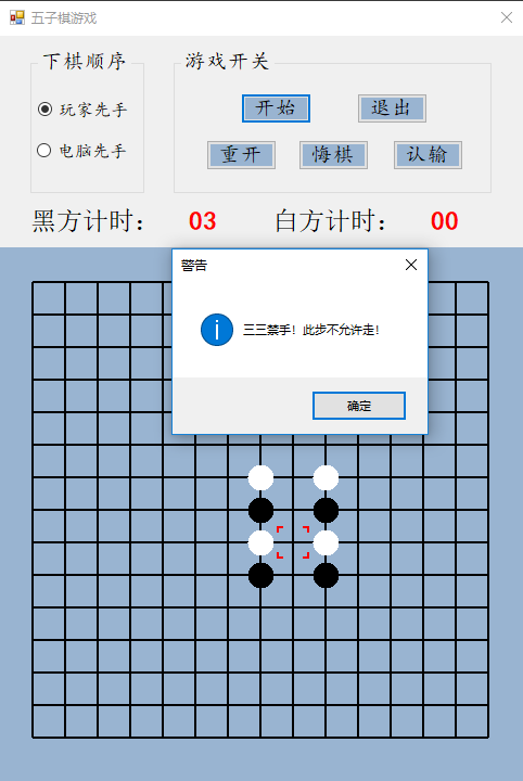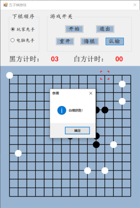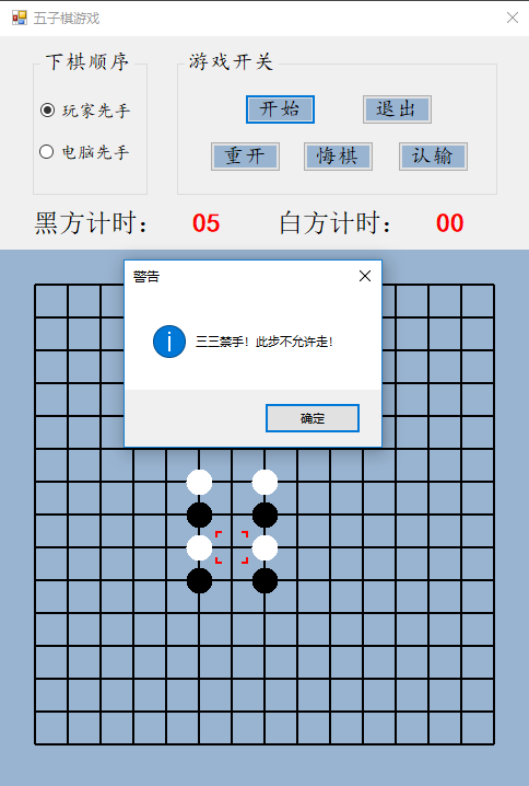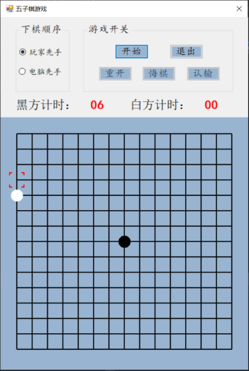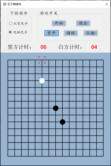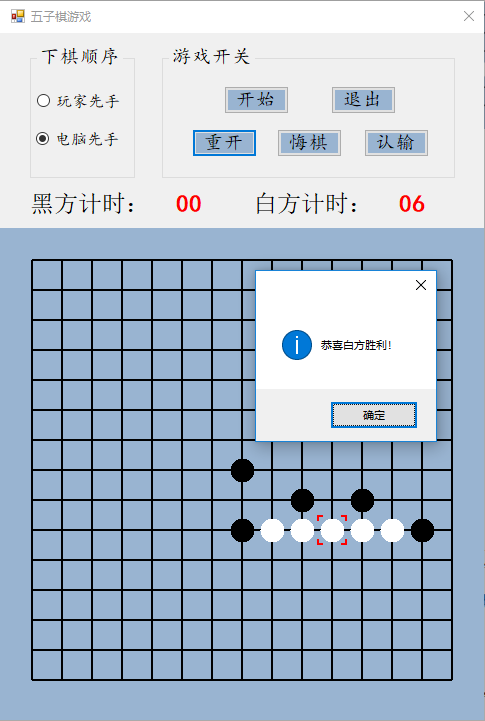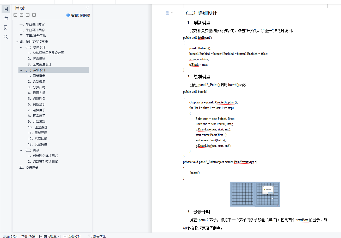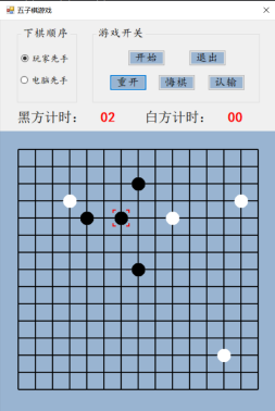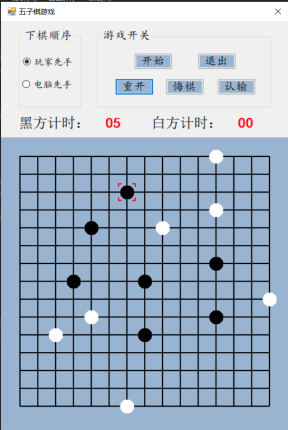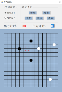 设计说明书学院 计算机学院 班别 电子照片姓名 学号电话 其它成员教师评价 难度 完成情况 答辩情况 毕业报告 综合成绩优( )良( )中( )及格( )不及格( ) 优( )良( )中( )及格( )不及格( ) 优( )良( )中( )及格( )不及格( ) 优( )良( )中( )及格( )不及格( ) 优( )良( )中( )及格( )不及格( )主要工作内容 1.负责了整理报告、总结代码等工作;2.负责了程序界面的设计和控件的使用;3.负责了五子棋的棋盘和棋子的绘制;4.负责了全局变量及相关函数的设计;5.负责了计时器的函数设计;6.负责了鼠标移动时跟踪光标的设计;7.参与了电脑自动落子及判断胜负的函数设计;8.参与了玩家落子、悔棋及禁手的设计;9.参与了总体设计。团队分工:组长:陈淑婷 组员:邱子豪毕业名称 C#程序设计 指导教师 黄敏毕业设计题目 五子棋游戏毕业设计时间 第7周至第8周目 录一、 毕业设计内容 3二、 毕业设计目的 3三、 工具/准备工作 3四、 设计步骤和方法 3(一) 总体设计 31. 总体设计思路及设计图 32. 界面设计 43. 全局变量设计 4(二) 详细设计 51. 刷新棋盘 52. 绘制棋盘 53. 分步计时 54. 显示光标 65. 判断胜负 86. 判断禁手 107. 电脑落子 158. 玩家落子 189. 开始游戏 1910. 退出游戏 2011. 重新开局 2012. 玩家认输 2113. 玩家悔棋 22(三) 测试 231. 判断胜负模块测试 232. 判断禁手模块测试 23五、 心得体会 24一、毕业设计内容在Visual Studio 2015 平台上,开发一个“五子棋游戏”的Windows Form应用程序,题目要求:1.整体规划,即画出棋盘和显示出“游戏开始”、“悔棋”、“退出游戏”等按钮。2.游戏界面的具体实现,即有绝对坐标与相对坐标、又有界面的颜色与大小和各部分所处的位置。3.在鼠标在棋盘上经过的时候,可以看出光标在那里;4.正常落棋子,不会覆盖已有棋子。5.记录游戏中棋子的落子过程,并且允许悔棋6.判断双方输赢,先走出五子连珠的一方赢7.先下者落子时不允许走禁手。二、毕业设计目的综合运用c#.net知识,在vs 2015 平台上,进行控制台应用程序和简单Windows Form应用程序的开发;初步熟悉开发一个Windows软件的流程。三、工具/准备工作Microsoft Visual Studio 2015,PC机一台,上网查找资料,相关参考书籍。
