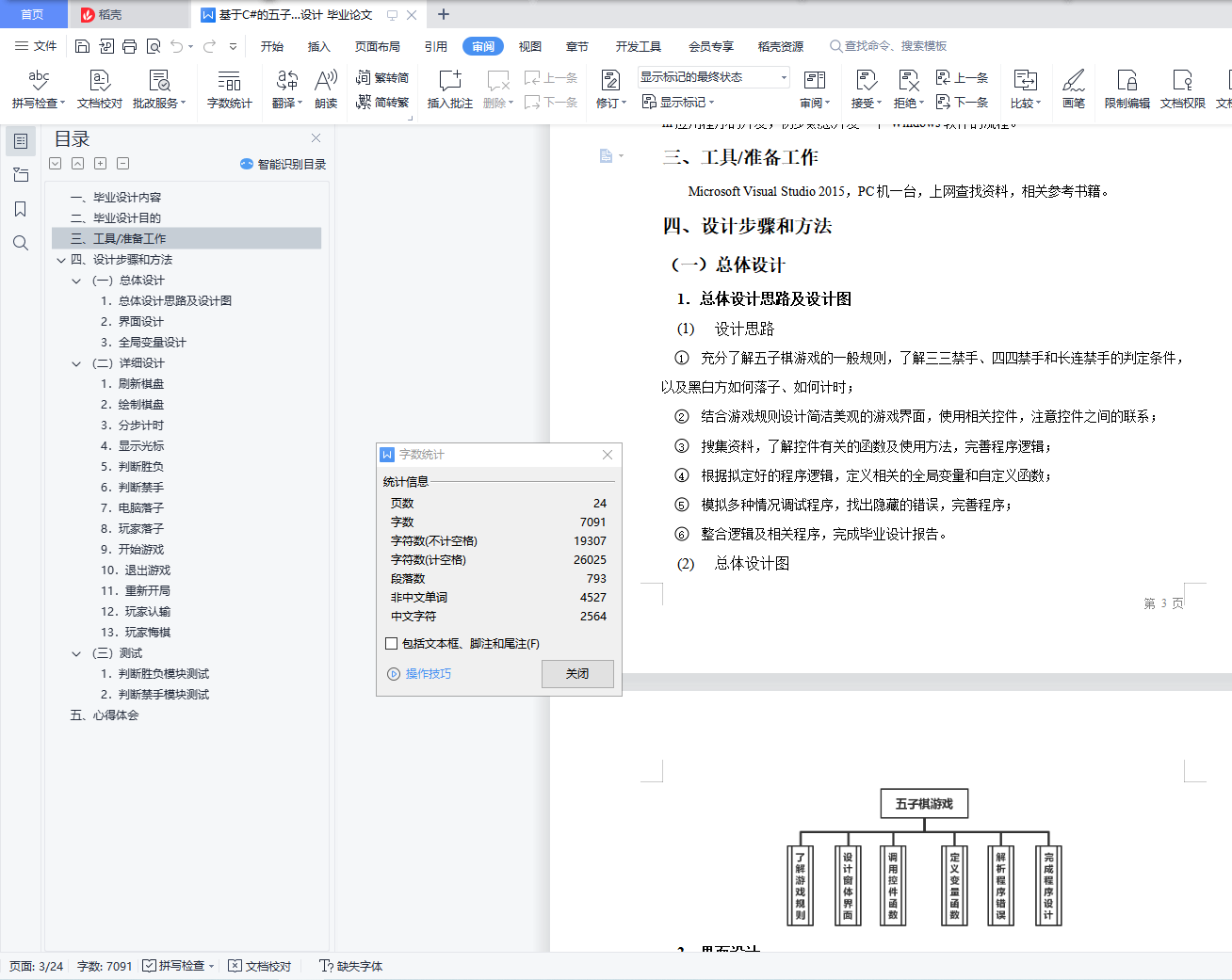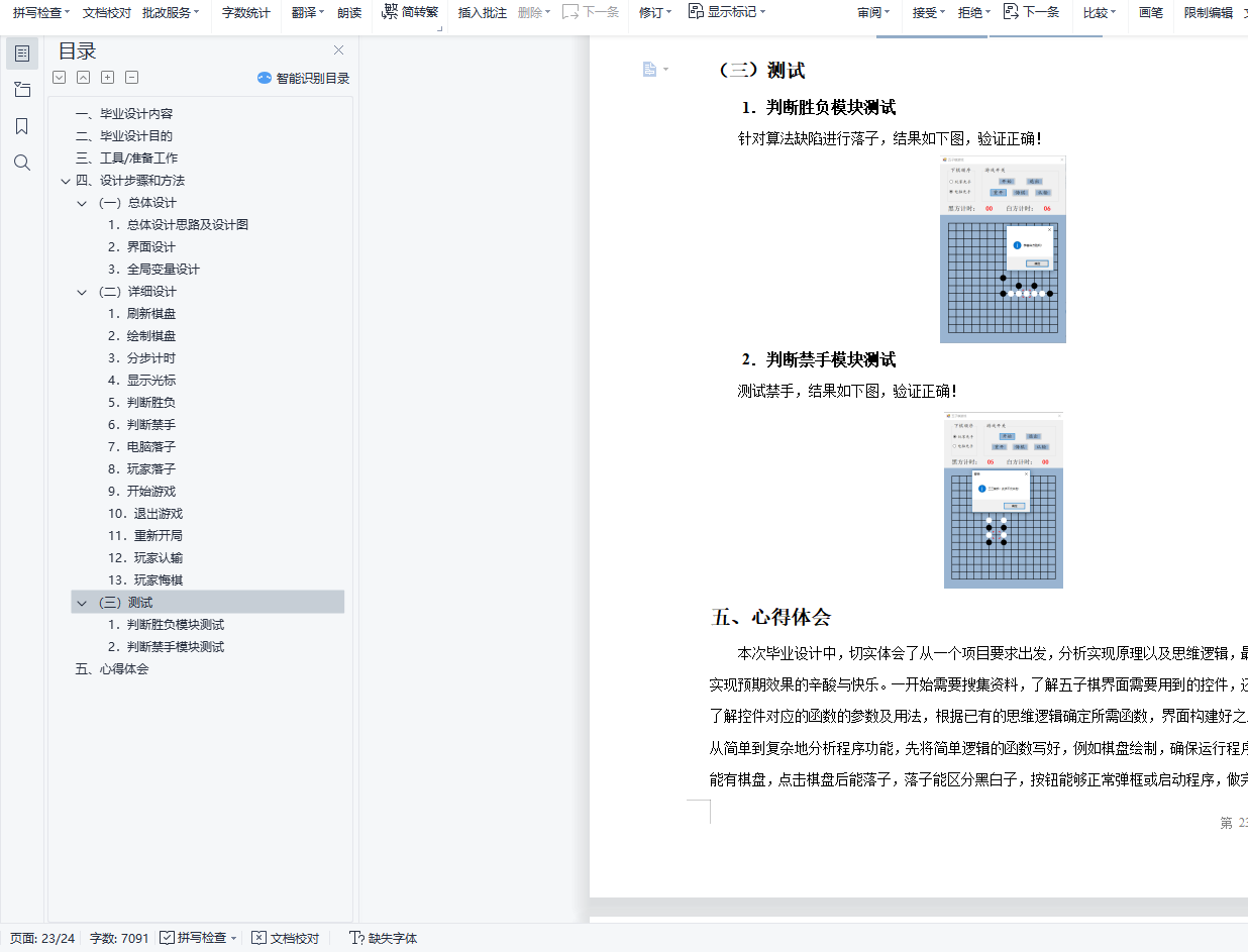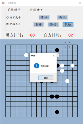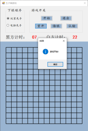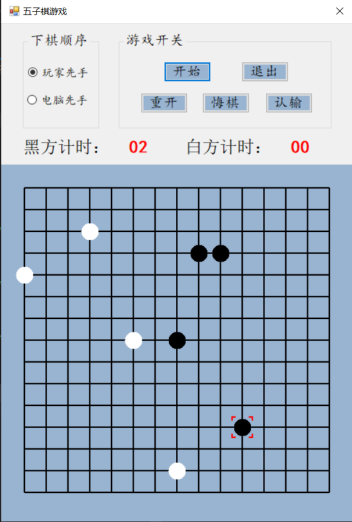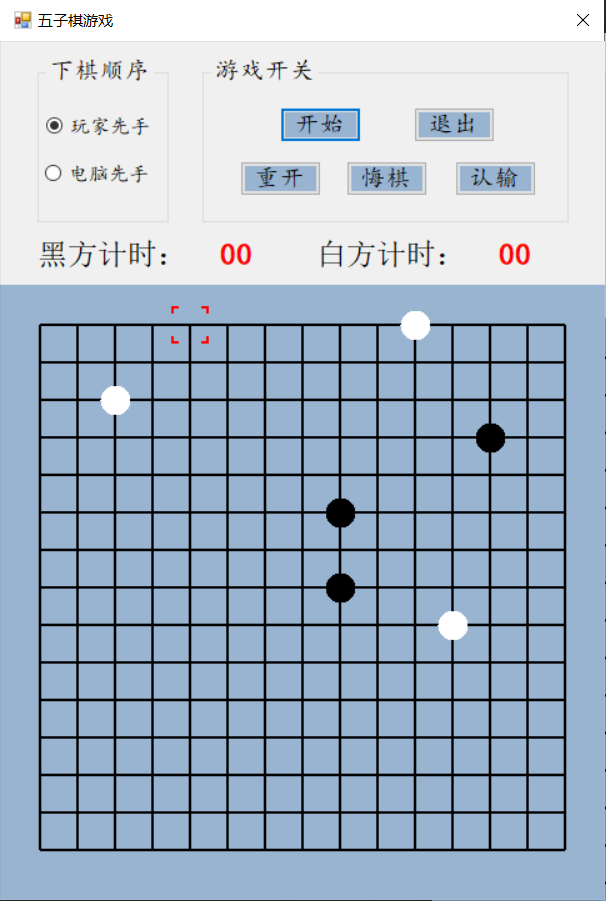 设计说明书学院 计算机学院 班别 电子照片姓名 学号电话 其它成员教师评价 难度 完成情况 答辩情况 毕业报告 综合成绩优( )良( )中( )及格( )不及格( ) 优( )良( )中( )及格( )不及格( ) 优( )良( )中( )及格( )不及格( ) 优( )良( )中( )及格( )不及格( ) 优( )良( )中( )及格( )不及格( )主要工作内容 1.负责了整理报告、总结代码等工作;2.负责了程序界面的设计和控件的使用;3.负责了五子棋的棋盘和棋子的绘制;4.负责了全局变量及相关函数的设计;5.负责了计时器的函数设计;6.负责了鼠标移动时跟踪光标的设计;7.参与了电脑自动落子及判断胜负的函数设计;8.参与了玩家落子、悔棋及禁手的设计;9.参与了总体设计。团队分工:组长:陈淑婷 组员:邱子豪毕业名称 C#程序设计 指导教师 黄敏毕业设计题目 五子棋游戏毕业设计时间 第7周至第8周目 录一、 毕业设计内容 3二、 毕业设计目的 3三、 工具/准备工作 3四、 设计步骤和方法 3(一) 总体设计 31. 总体设计思路及设计图 32. 界面设计 43. 全局变量设计 4(二) 详细设计 51. 刷新棋盘 52. 绘制棋盘 53. 分步计时 54. 显示光标 65. 判断胜负 86. 判断禁手 107. 电脑落子 158. 玩家落子 189. 开始游戏 1910. 退出游戏 2011. 重新开局 2012. 玩家认输 2113. 玩家悔棋 22(三) 测试 231. 判断胜负模块测试 232. 判断禁手模块测试 23五、 心得体会 24一、毕业设计内容在Visual Studio 2015 平台上,开发一个“五子棋游戏”的Windows Form应用程序,题目要求:1.整体规划,即画出棋盘和显示出“游戏开始”、“悔棋”、“退出游戏”等按钮。2.游戏界面的具体实现,即有绝对坐标与相对坐标、又有界面的颜色与大小和各部分所处的位置。3.在鼠标在棋盘上经过的时候,可以看出光标在那里;4.正常落棋子,不会覆盖已有棋子。5.记录游戏中棋子的落子过程,并且允许悔棋6.判断双方输赢,先走出五子连珠的一方赢7.先下者落子时不允许走禁手。二、毕业设计目的综合运用c#.net知识,在vs 2015 平台上,进行控制台应用程序和简单Windows Form应用程序的开发;初步熟悉开发一个Windows软件的流程。三、工具/准备工作Microsoft Visual Studio 2015,PC机一台,上网查找资料,相关参考书籍。