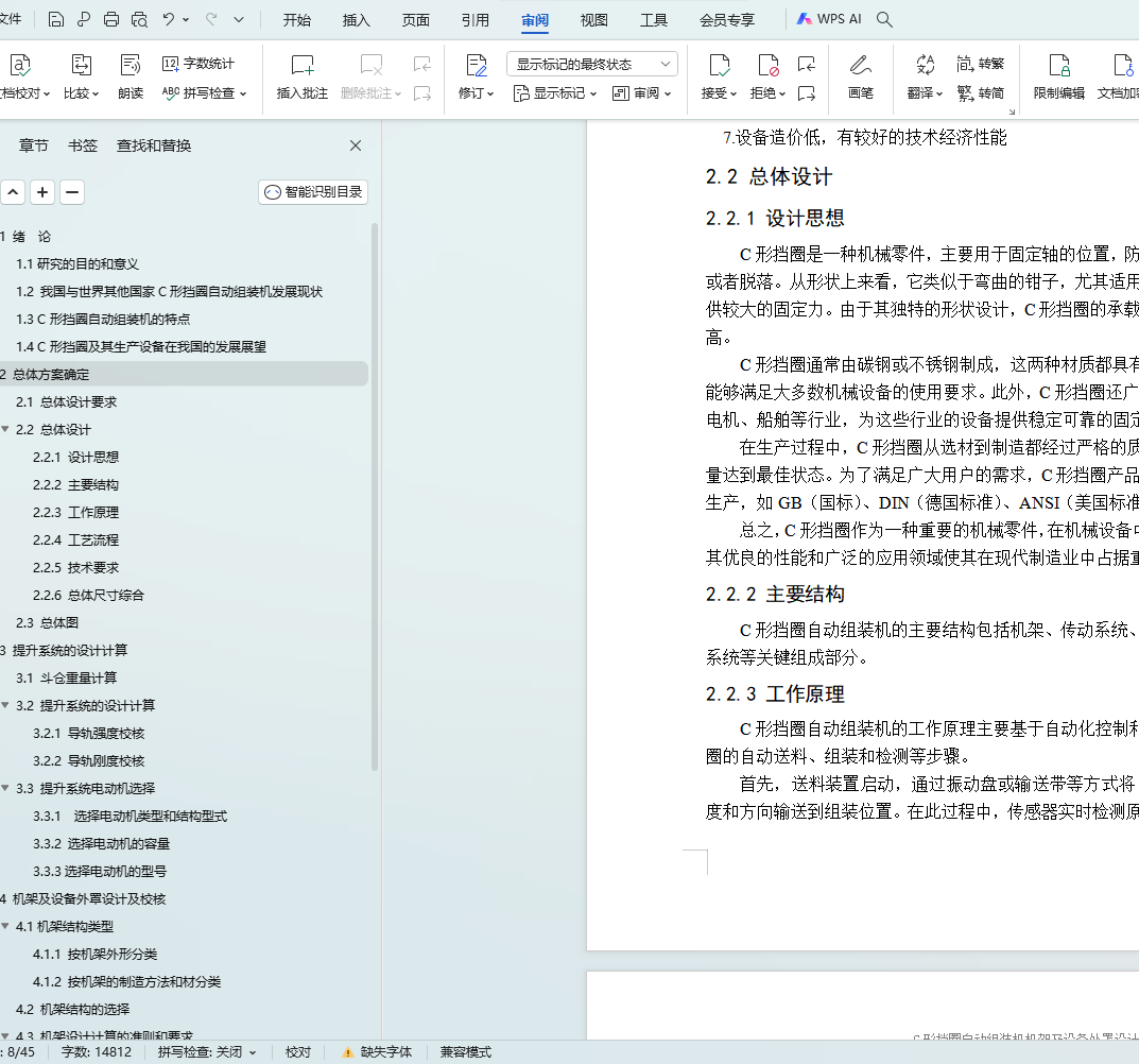本论文主要研究了C形挡圈自动组装机的总体设计及其传动系统设计。C形挡圈作为机械部件的重要组成部分,其组装过程的高效性和精确性对于提升产品质量和生产效率具有关键性意义。因此,开发一款自动化程度高、性能稳定可靠的C形挡圈自动组装机,对于推动我国相关制造业的发展具有重要意义。本课题首先确定了C形挡圈自动组装机的总体方案,包括机架及设备外罩的设计。机架作为整机的支撑结构,其稳定性和承重能力对于确保整机的正常运行至关重要;设备外罩则起到安全防护和美化外观的作用。接着,对传动系统进行了详细的设计和尺寸计算,确保传动系统能够准确、高效地传递动力,实现C形挡圈的自动组装。通过本课题的研究,为C形挡圈自动组装机的开发和应用提供了重要的理论依据和技术支持,有助于提升我国相关制造业的技术水平和市场竞争力。