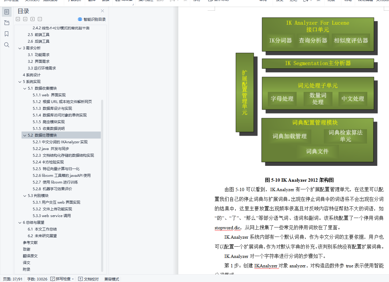 基于SVM的程序设计相关网页判别系统摘要ACM/ICPC是一个有着重大影响力的国际大学生程序设计竞赛,互联网亦有大量的训练习题与解题报告。有些学校会建设自己的网站用于收集解题报告,供师生参考学习。该系统可服务于这样的网站,用于自动化评判网页。该判别系统接受一个url(或本地网页)作为输入x,判别后输出结果,一个重要的参数为字符串y,用于阐明该网页的类别。记集合A={网页|它描述的是计算机数据结构编程的相关内容},那么y为“yes”或“no”,前者表示x∈A;后者表示x∉A。该系统可分为三个模块。收集模块用于网页收集与标注,实现网页到原始训练集的处理。训练模块以上个模块的输出作为输入,先后进行中文分词处理、初始特征空间统计,并通过卡方检验得到抽取后的特征空间,由此可计算每篇文档的特征向量,归一化后送往SVM进行训练。这是一个机器学习过程,通过对径向基核函数较关键的参数gamma与C调优,得到训练好的模型。判别模块通过web页面与用户交互,可接受url或本地网页文档作为输入,输出结果包括网页的标题、正文、分词结果、特征向量、判别结果、判别结果准确率估计这6个参数。除了与人交互外,判别模块同时也提供了web 服务,可以供其他代码跨平台批量调用。关键词:程序设计,支持向量机,文本分类,机器学习,统计A System Based on SVM to Judge the WebPage about Programming DesignABSTRACTACM/ICPC is a famous international collegiate programming contest. There are many exercises and problem-solving reports in the Internet. Some schools would build their own websites to collect them for teaching, and this system is helpful to judge the webpages automatically.This judge system accepts an url (or a local webpage) as the input x, then outputs a result which contains an important parameter y, indicating the type of this webpage. We assign set A={webpage | the content it describes is relative to computer programming or data structure}, so y is "yes" or "no". The former means x∈A;and the later means x∉A.This system is divided into 3 parts. Collecting module collects and labels the webpages. Namely, it transforms webpages to raw training set.Training module uses the former module's output as input, then complete following tasks:Chinese word segmentation, raw feature space statistics, Chi-square testing, feature vector caculate per document. Next sends the vector set into SVM after being normalized to train. This is a machine learning procedure, gaining a module by adjusting parameters gamma and C of the RBF.Judging module’s output contains title, content, word segmentation, feature vector, result and probability estimate. In addition, this judge system provides web service, which makes it convenient that other codes’ cross platform and batch calling.Key words: programming design, SVM, text classification, machine learning, statistics目 录摘要 IABSTRACT II1绪论 31.1 研究背景 31.2 文本分类研究现状 31.3 主要研究内容 41.4 本文章节安排 52理论基础与相关工具 62.1 中文分词 62.2 卡方检验 72.3 神经网络 102.3.1 神经网络简介 112.3.2核方法与径向基函数 122.4 支持向量机 122.4.1线性可分模式的最优超平面 122.4.2线性不可分模式的最优超平面 142.5 前端工具 152.6 后端工具 163需求分析 193.1 功能需求 193.2 界面需求 193.3运行环境需求 204系统设计 215系统实现 245.1 数据收集模块 245.1.1 web 界面实现 245.1.2 根据URL或本地文件解析网页 265.1.3 数据库设计与实现 275.1.4 数据库访问对象的单例实现 295.1.5 爬虫模块实现 295.1.5 收集数据说明 305.2 数据处理模块 335.2.1中文分词的IKAnalyzer实现 335.2.2 java 并发与同步 355.2.3 文档结构化存储的数据结构实现 375.2.4卡方检验实现 395.2.5 特征向量计算与归一化 415.2.6 libsvm工具箱的javaAPI使用 435.2.7 使用libsvm进行训练 465.2.8 机器学习效果评价 495.3判别模块 495.3.1用户交互web界面实现 505.3.2 文件上传功能实现 535.3.3 web service调用 536总结与展望 556.1 本文工作总结 556.2 未来研究展望 55参考文献 57致谢 58翻译原文 59译文 75附录 86