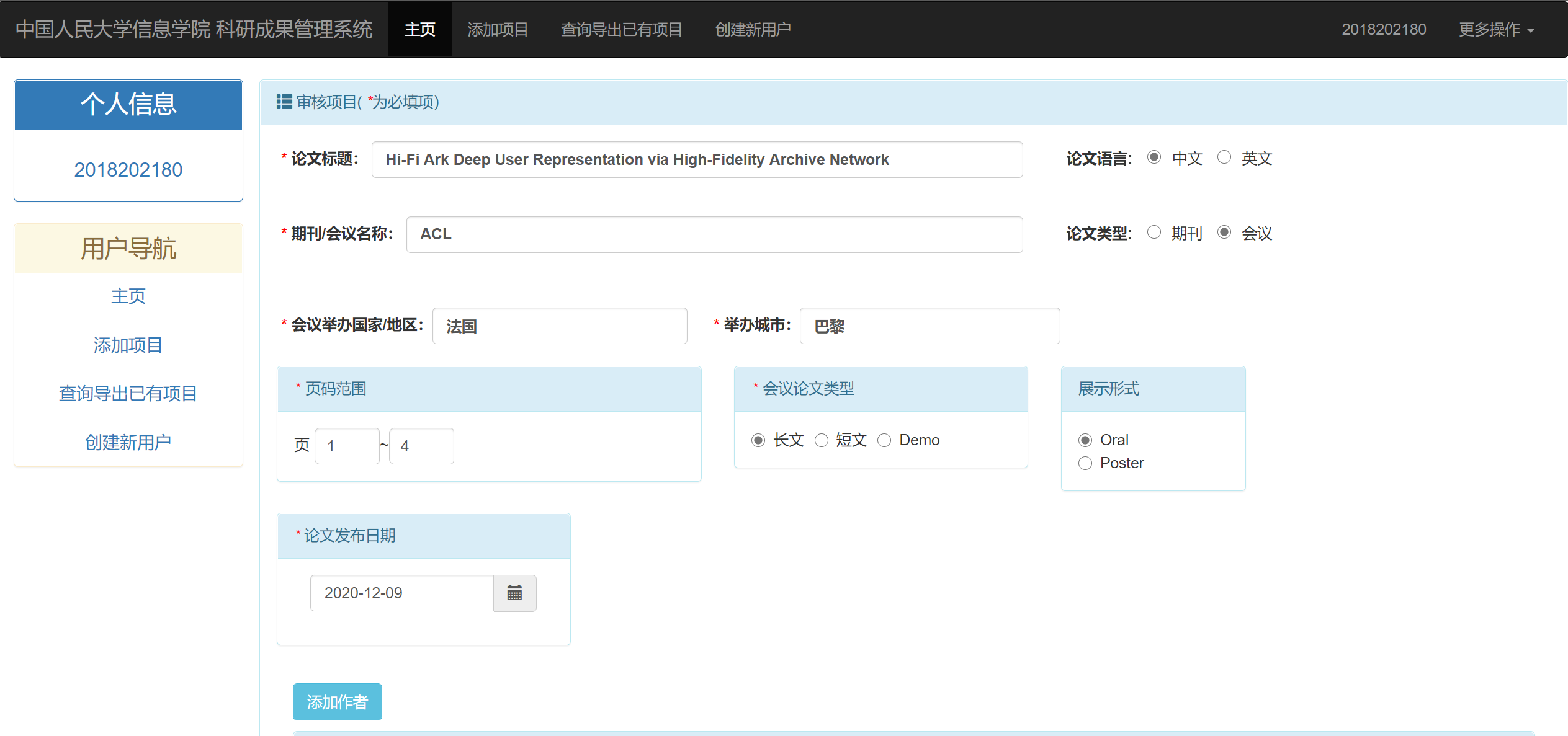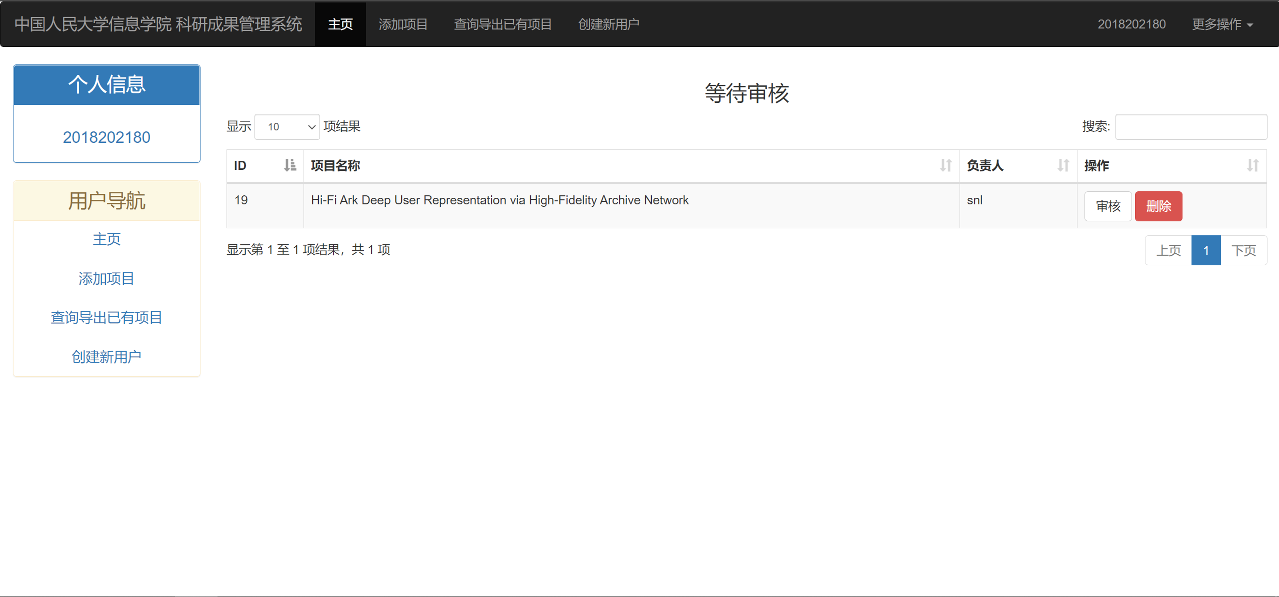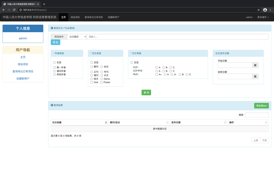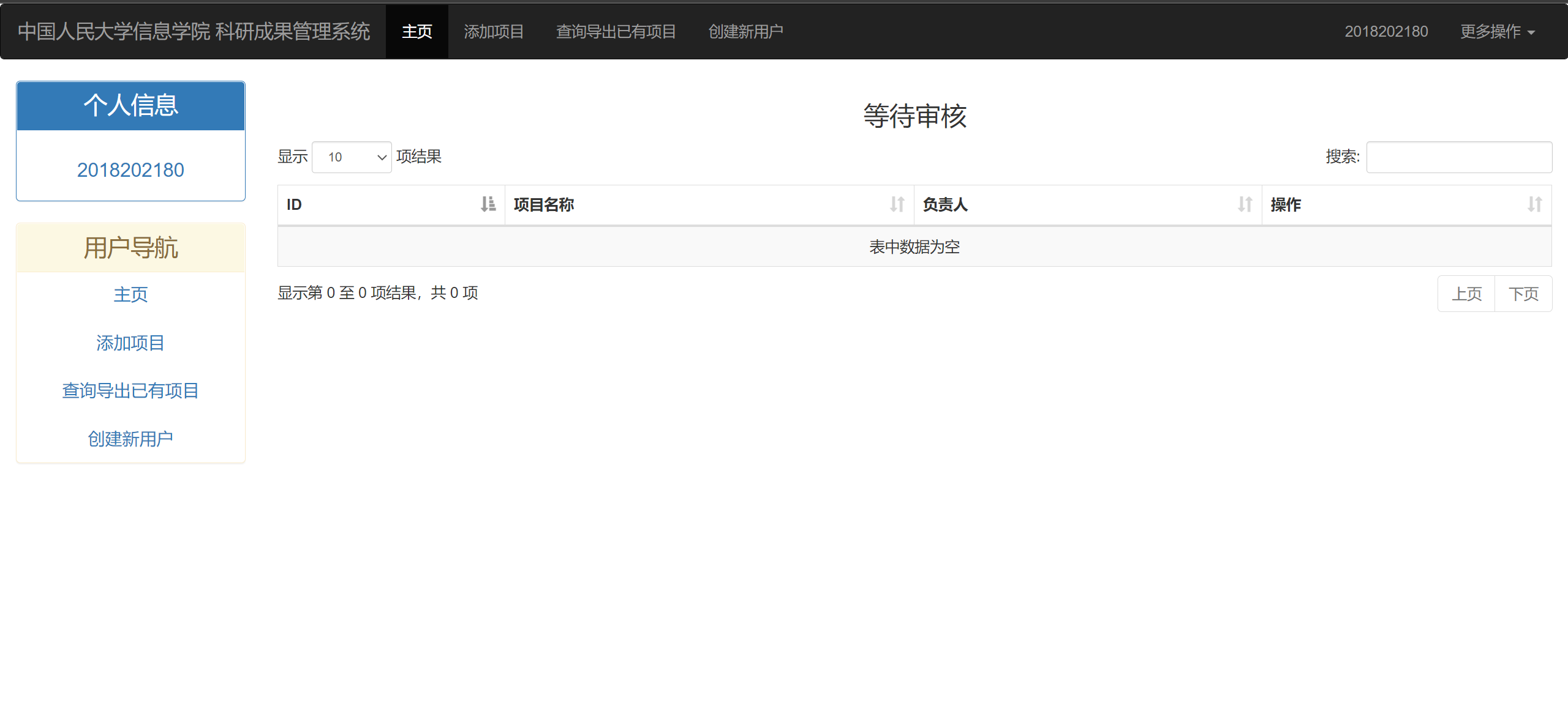 主要功能按照登录账号的身份不同,系统界面和功能略有不同:普通用户(主要指教师)登录后,主页显示未审核的项目的基本信息,用户可以点击左侧侧边栏中的主页按钮、添加按钮和查询按钮来跳转到相应页面。在添加页面,用户可以填写项目信息表格(仅需填写少部分必须内容,其它部分可以通过查询期刊级别表等辅助表自动填充,也可由管理员在审核时补充填写)并提交。在查询页面,用户可以按条件筛选**自己**已审核通过的项目,也可在此页面导出为 Excel 表格。管理员登录后,主页显示等待审核的项目,每个条目右边有审核按钮,可直接跳转审核页面。管理员也可以点击主页左侧侧边栏中的主页按钮、添加按钮、查询按钮和用户管理按钮。在添加界面中,管理员也可以添加项目。在查询界面中,管理员可以按条件查询**全院**所有已审核通过的项目,并可导出 Excel 表格。在用户管理界面中,管理员可以创建新账号以提供给新用户使用。在审核页面中,管理员可以审核未审核的项目,可以对项目信息进行修改、补充。