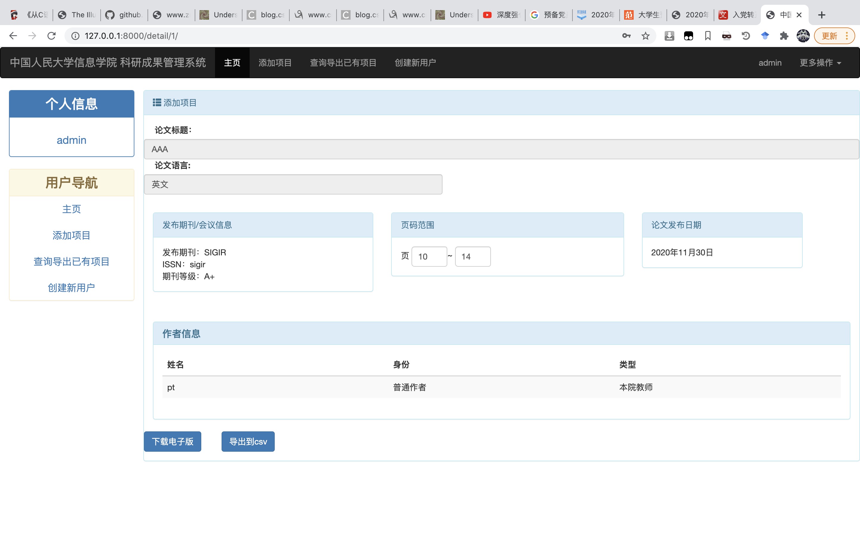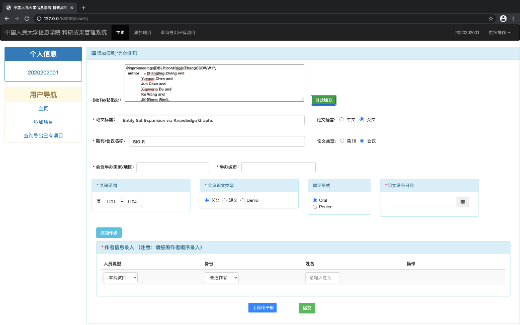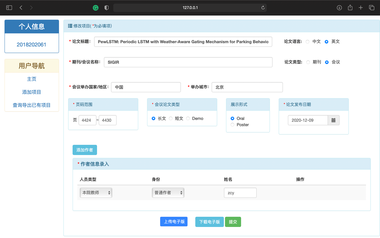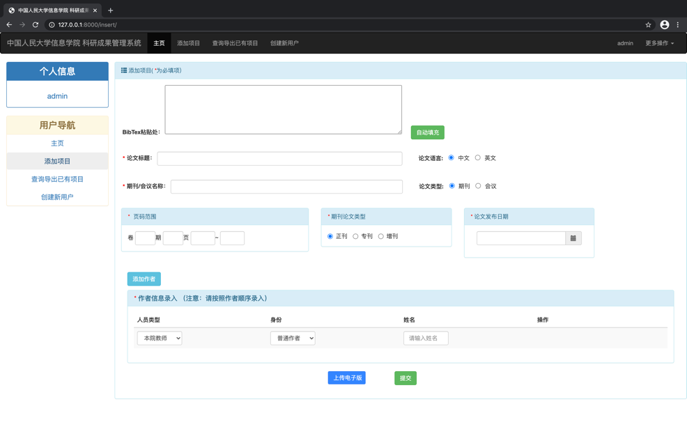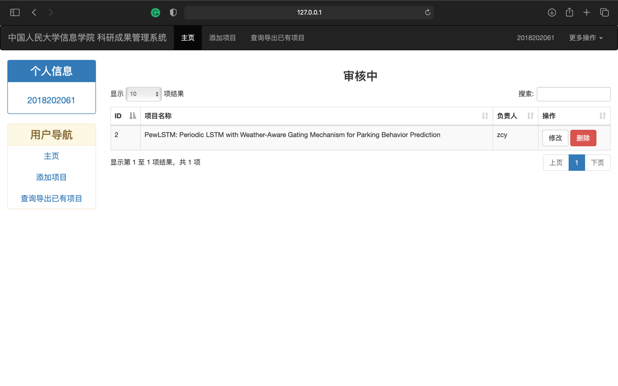 主要功能按照登录账号的身份不同,系统界面和功能略有不同:普通用户(主要指教师)登录后,主页显示未审核的项目的基本信息,用户可以点击左侧侧边栏中的主页按钮、添加按钮和查询按钮来跳转到相应页面。在添加页面,用户可以填写项目信息表格(仅需填写少部分必须内容,其它部分可以通过查询期刊级别表等辅助表自动填充,也可由管理员在审核时补充填写)并提交。在查询页面,用户可以按条件筛选**自己**已审核通过的项目,也可在此页面导出为 Excel 表格。管理员登录后,主页显示等待审核的项目,每个条目右边有审核按钮,可直接跳转审核页面。管理员也可以点击主页左侧侧边栏中的主页按钮、添加按钮、查询按钮和用户管理按钮。在添加界面中,管理员也可以添加项目。在查询界面中,管理员可以按条件查询**全院**所有已审核通过的项目,并可导出 Excel 表格。在用户管理界面中,管理员可以创建新账号以提供给新用户使用。在审核页面中,管理员可以审核未审核的项目,可以对项目信息进行修改、补充。