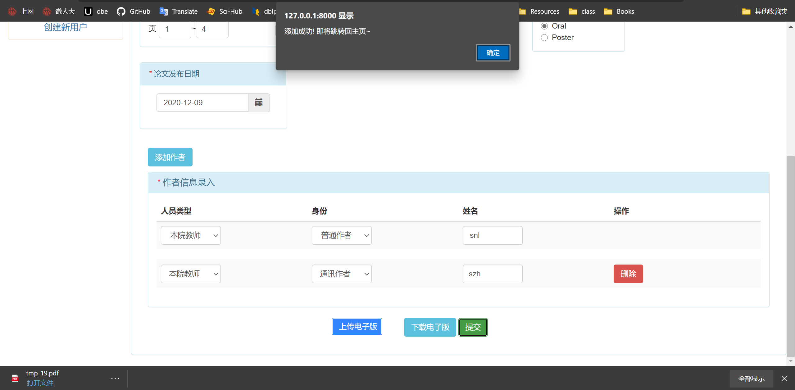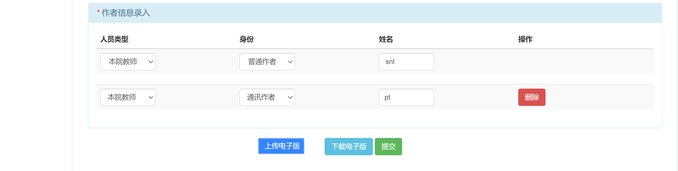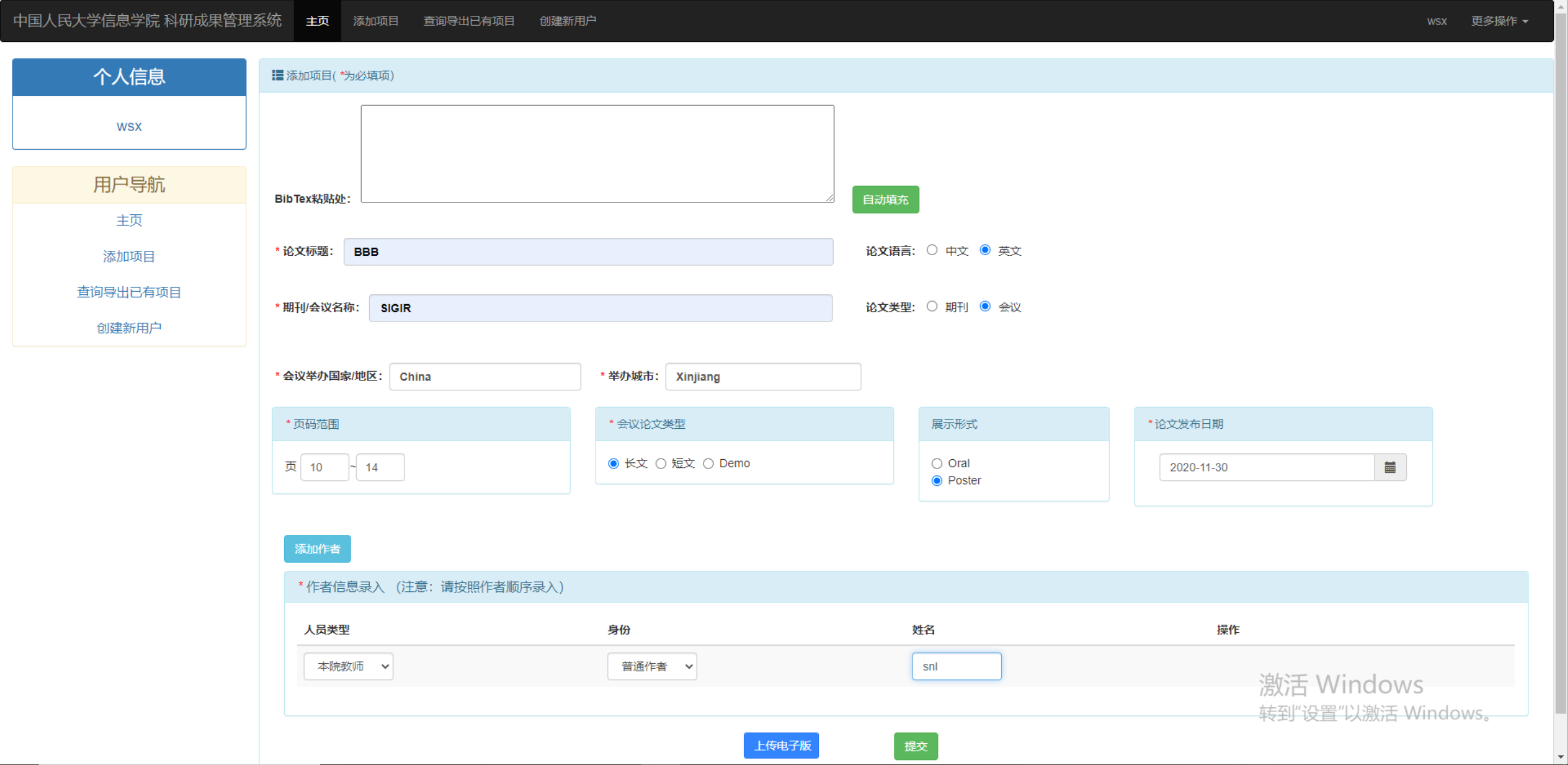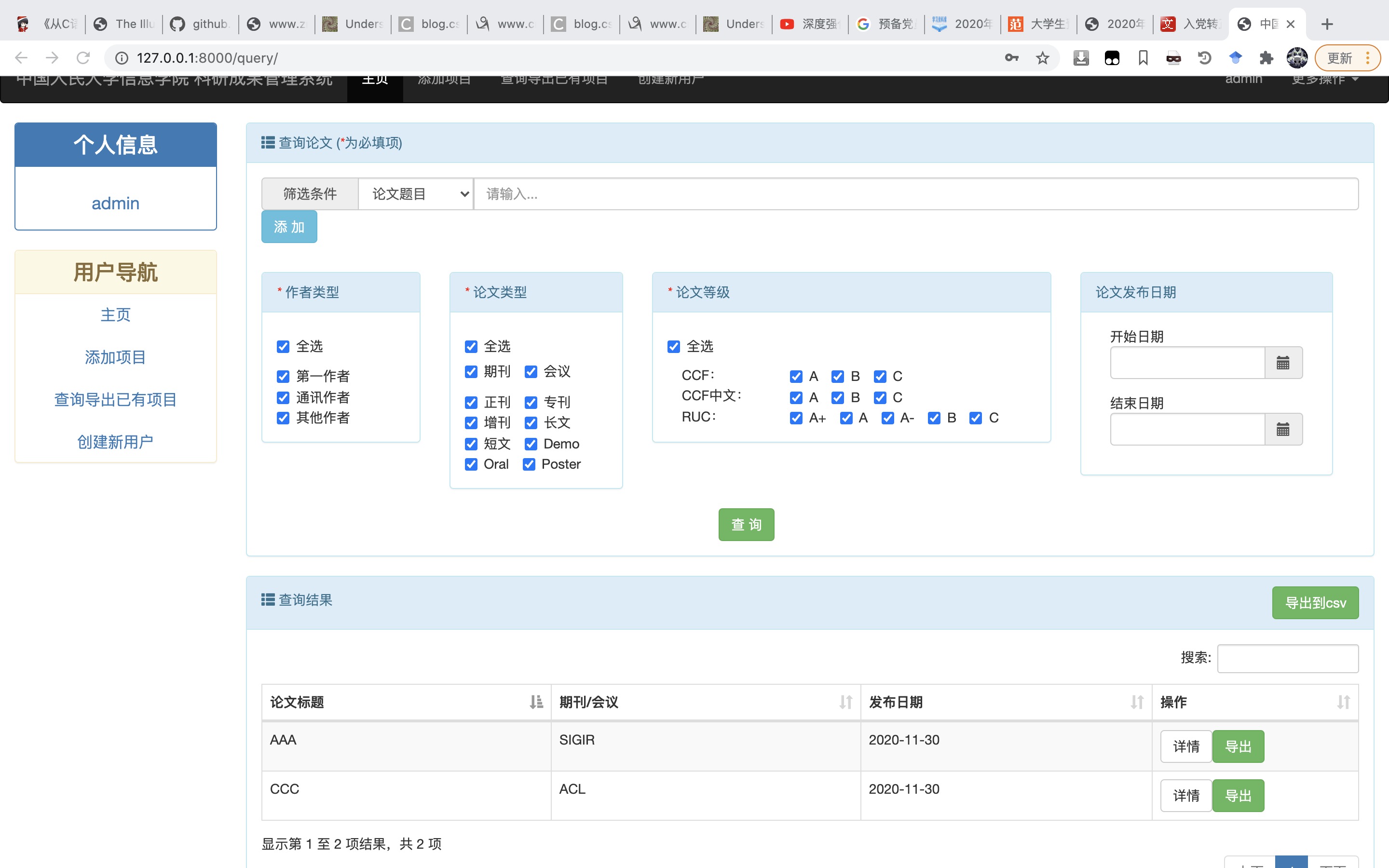 主要功能按照登录账号的身份不同,系统界面和功能略有不同:普通用户(主要指教师)登录后,主页显示未审核的项目的基本信息,用户可以点击左侧侧边栏中的主页按钮、添加按钮和查询按钮来跳转到相应页面。在添加页面,用户可以填写项目信息表格(仅需填写少部分必须内容,其它部分可以通过查询期刊级别表等辅助表自动填充,也可由管理员在审核时补充填写)并提交。在查询页面,用户可以按条件筛选**自己**已审核通过的项目,也可在此页面导出为 Excel 表格。管理员登录后,主页显示等待审核的项目,每个条目右边有审核按钮,可直接跳转审核页面。管理员也可以点击主页左侧侧边栏中的主页按钮、添加按钮、查询按钮和用户管理按钮。在添加界面中,管理员也可以添加项目。在查询界面中,管理员可以按条件查询**全院**所有已审核通过的项目,并可导出 Excel 表格。在用户管理界面中,管理员可以创建新账号以提供给新用户使用。在审核页面中,管理员可以审核未审核的项目,可以对项目信息进行修改、补充。