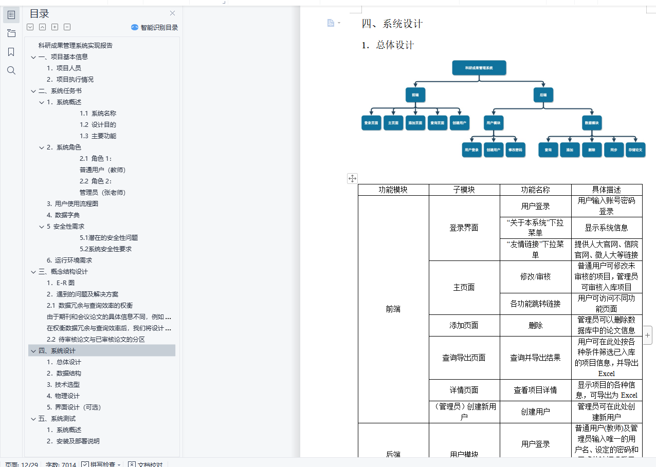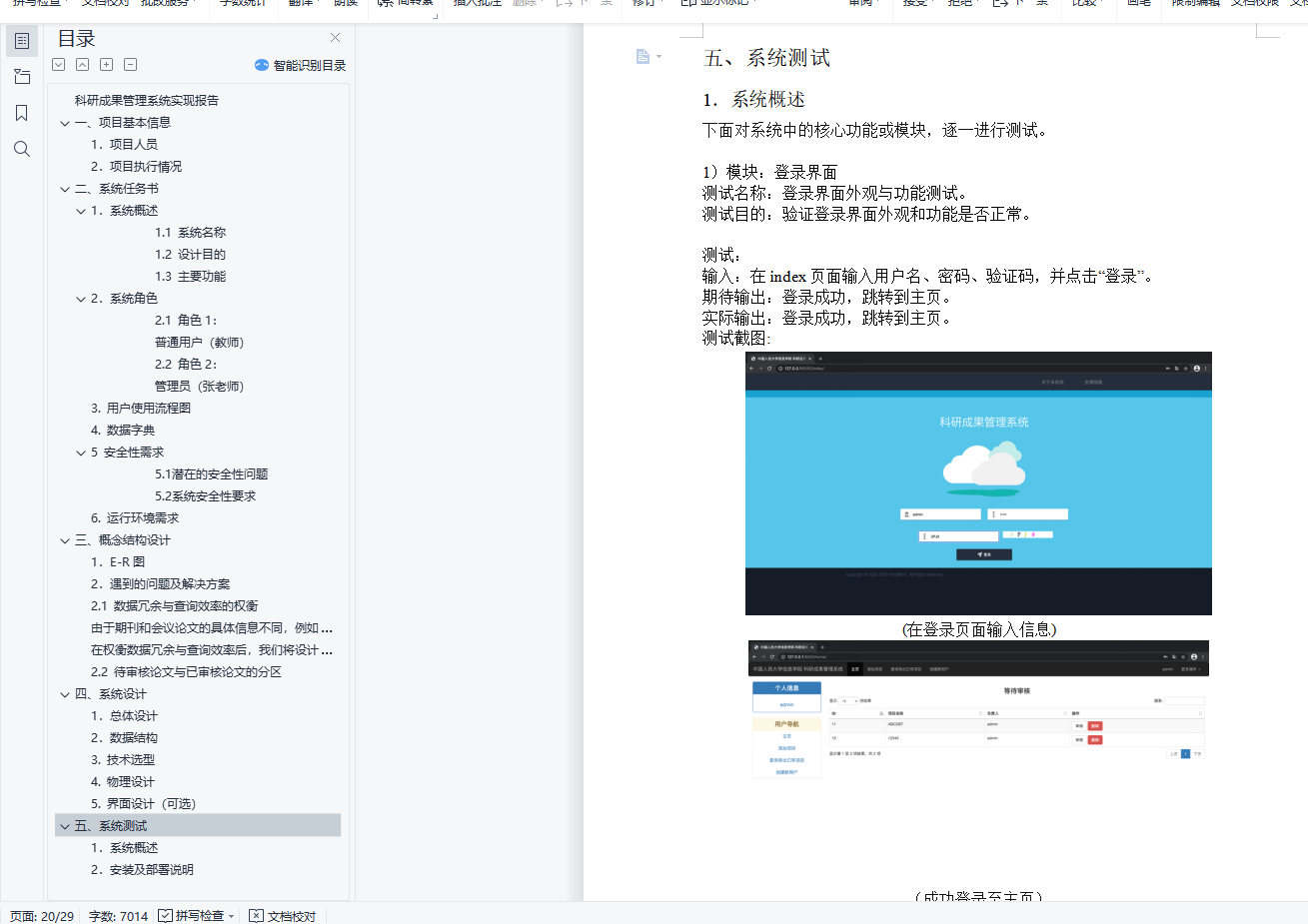 目录科研成果管理系统实现报告 1一、项目基本信息 21.项目人员 22.项目执行情况 2二、系统任务书 31.系统概述 32.系统角色 33. 用户使用流程图 44. 数据字典 75 安全性需求 86. 运行环境需求 9三、概念结构设计 101.E-R图 102.遇到的问题及解决方案 10四、系统设计 111.总体设计 112.数据结构 123. 技术选型 144. 物理设计 155. 界面设计(可选) 16五、系统测试 191.系统概述 192.安装及部署说明 20